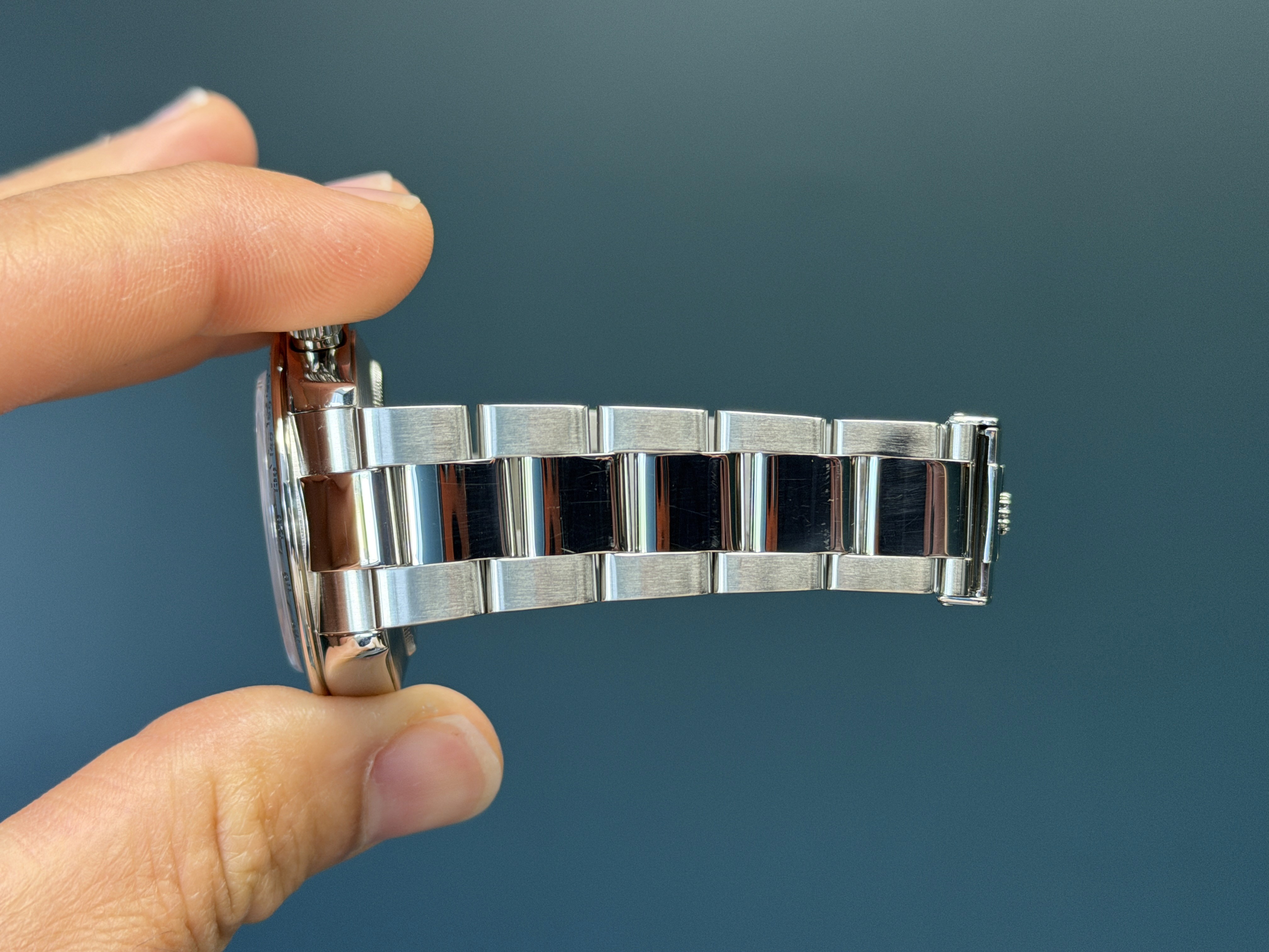 Today's example comes to us in excellent condition with its original box and papers dated 5/3/03. Although I wouldn't consider this a "Panna" the dial is indeed creamy and not white paired with rare thin hands! The case is excellent and has thick even lugs throughout. The bezel is excellent with all of its enamel in place remaining sharp and crisp. The bracelet has 12.5 links and shows no stretch. The watch is keeping excellent time and the chronograph feature functions as it should.