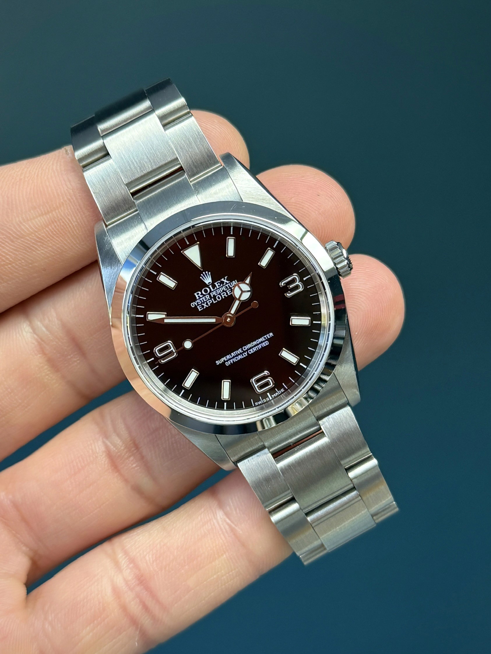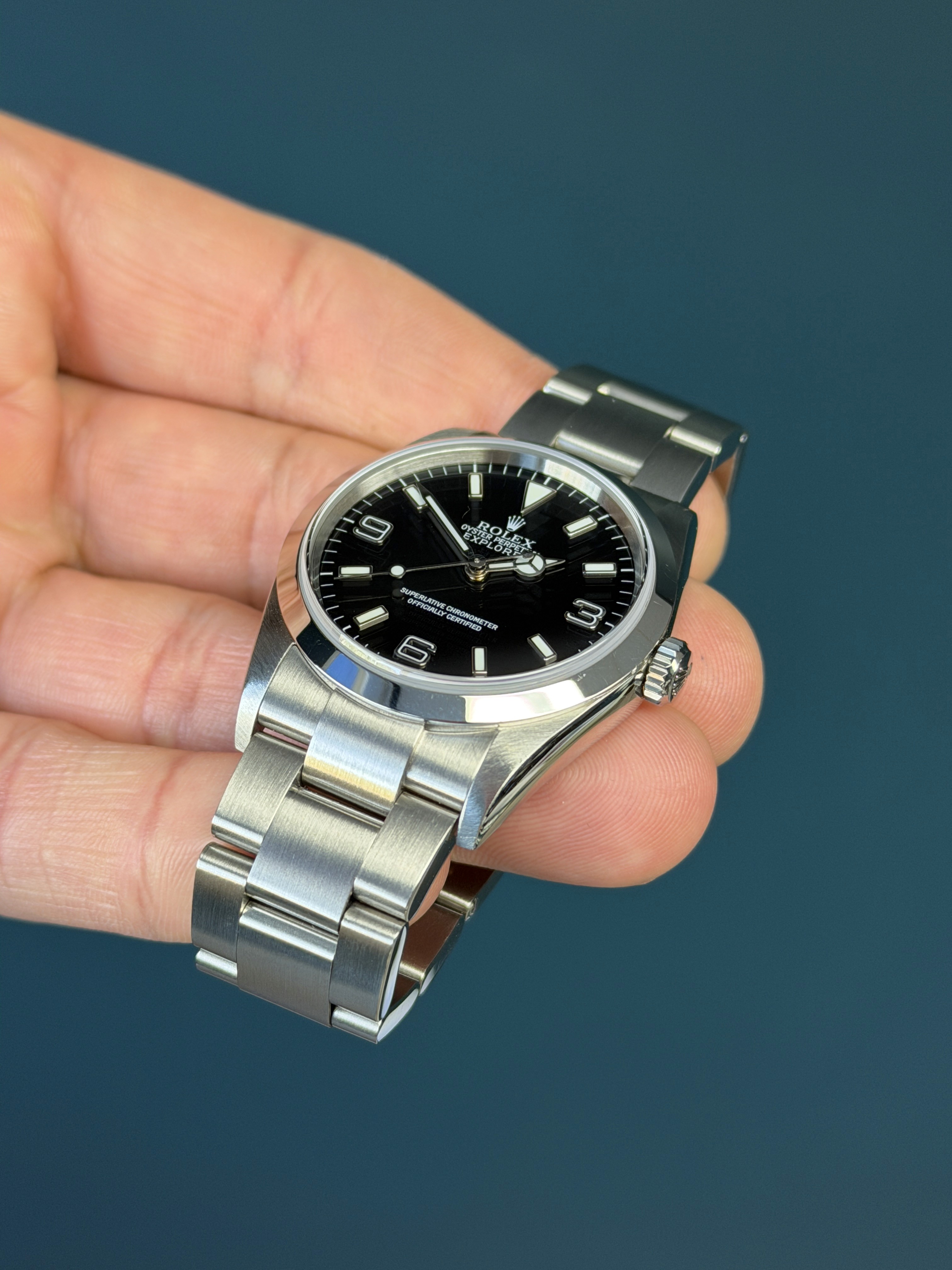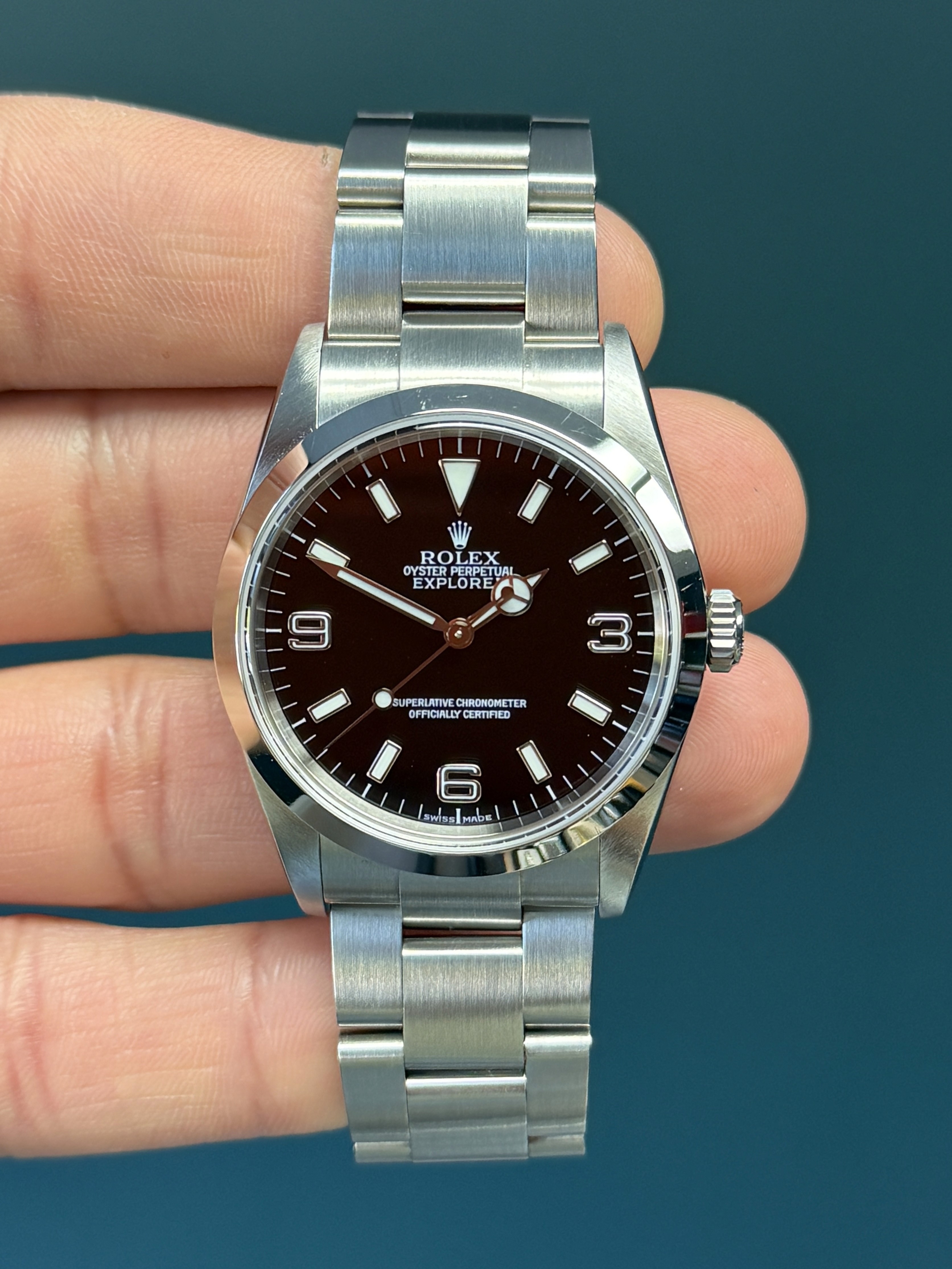 The Rolex Explorer Reference 114270 is a timeless emblem of rugged sophistication, designed for adventurers and explorers alike. With a classic 36mm stainless steel case and a sleek black dial adorned with luminous hour markers and hands, this iconic timepiece exudes understated elegance and exceptional functionality. Equipped with Rolex's renowned automatic movement, the Explorer 114270 ensures precision timekeeping in any environment, while its scratch-resistant sapphire crystal and robust Oyster case guarantee durability and resilience on the most demanding expeditions. Combining heritage-inspired design with modern reliability, the Rolex Explorer 114270 remains a steadfast companion for those who seek to conquer new horizons with confidence and style.