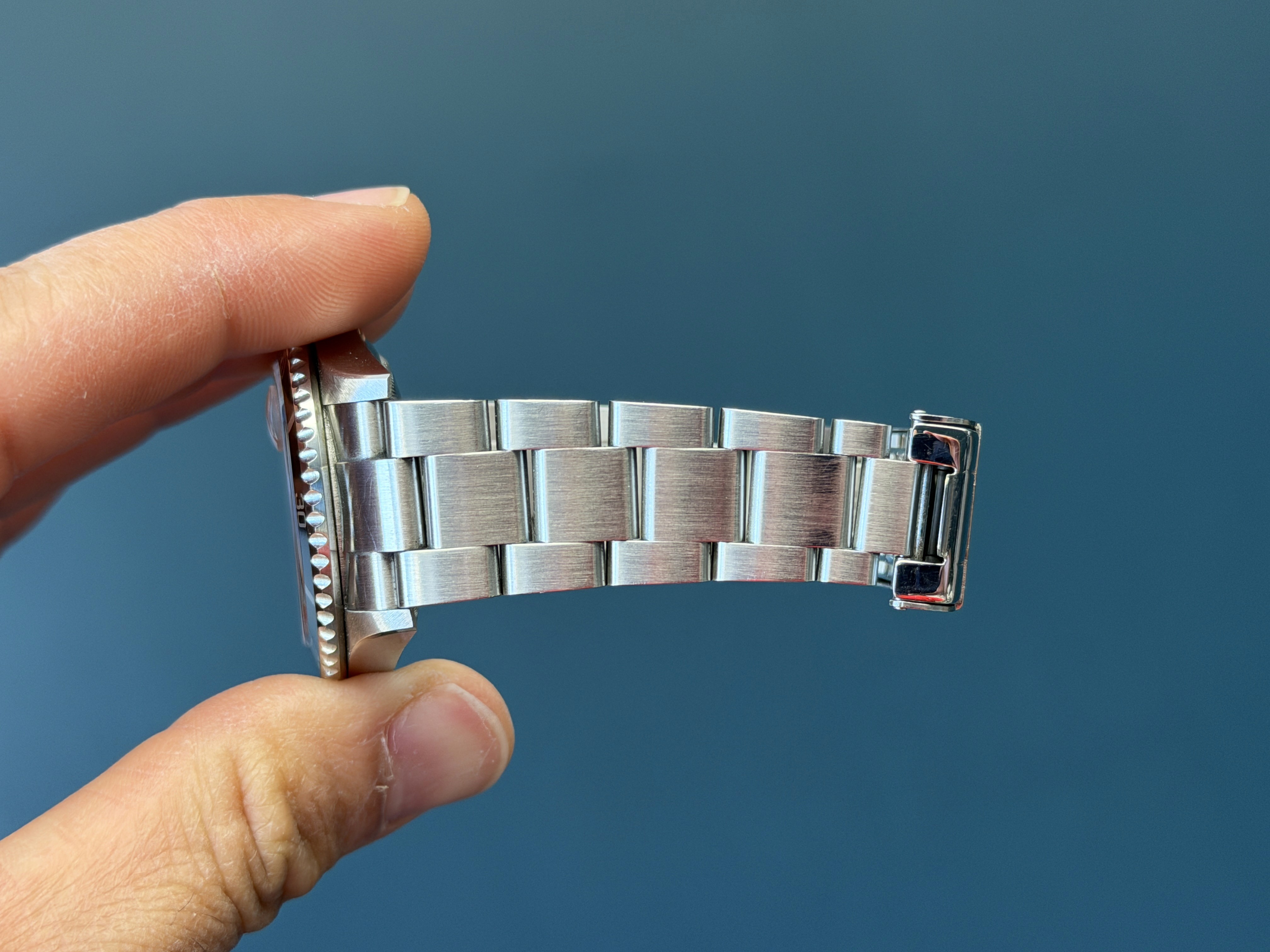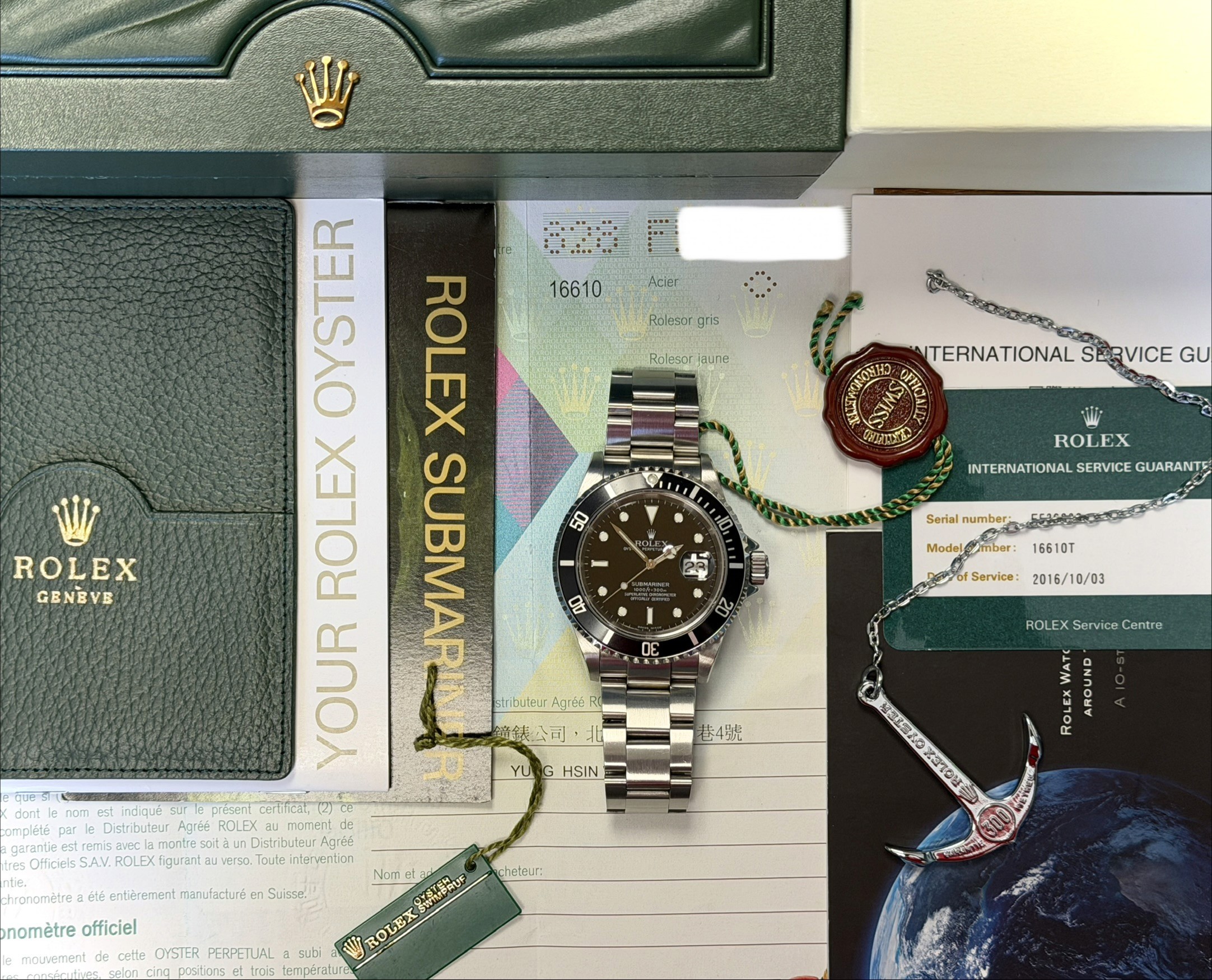Today we bring you a beautiful Submariner reference 16610 accompanied by its full complete set with Papers dated 10/12/04. This example also comes with Rolex Service Card dated 10/3/16. The no holes case is excellent and razor sharp. The insert is nice and clean. The dial and Saphire crystal are excellent showing no visible wear. The SEL oyster bracelet is fully linked and shows no stretch. This example is running COSC keeping time.