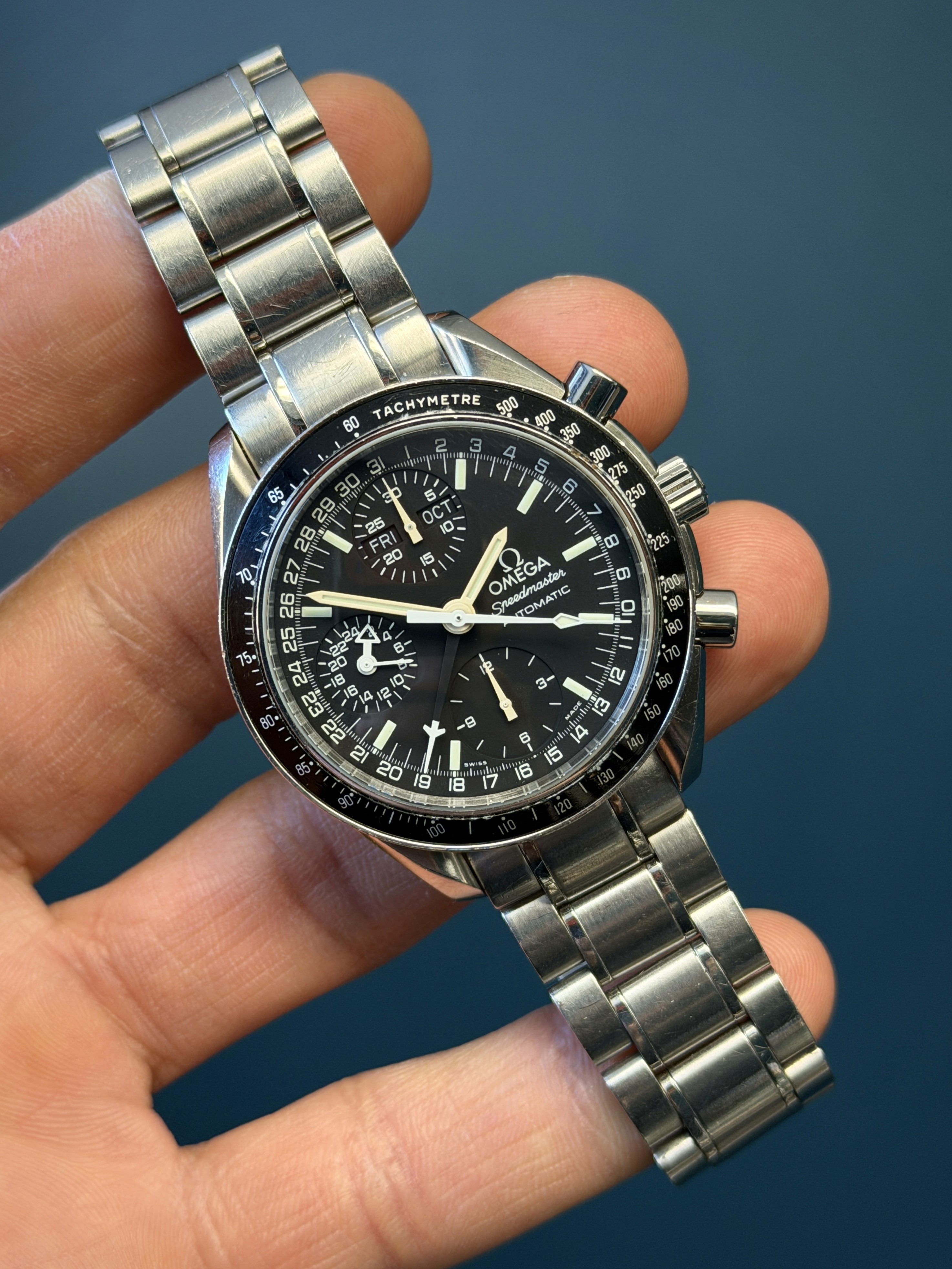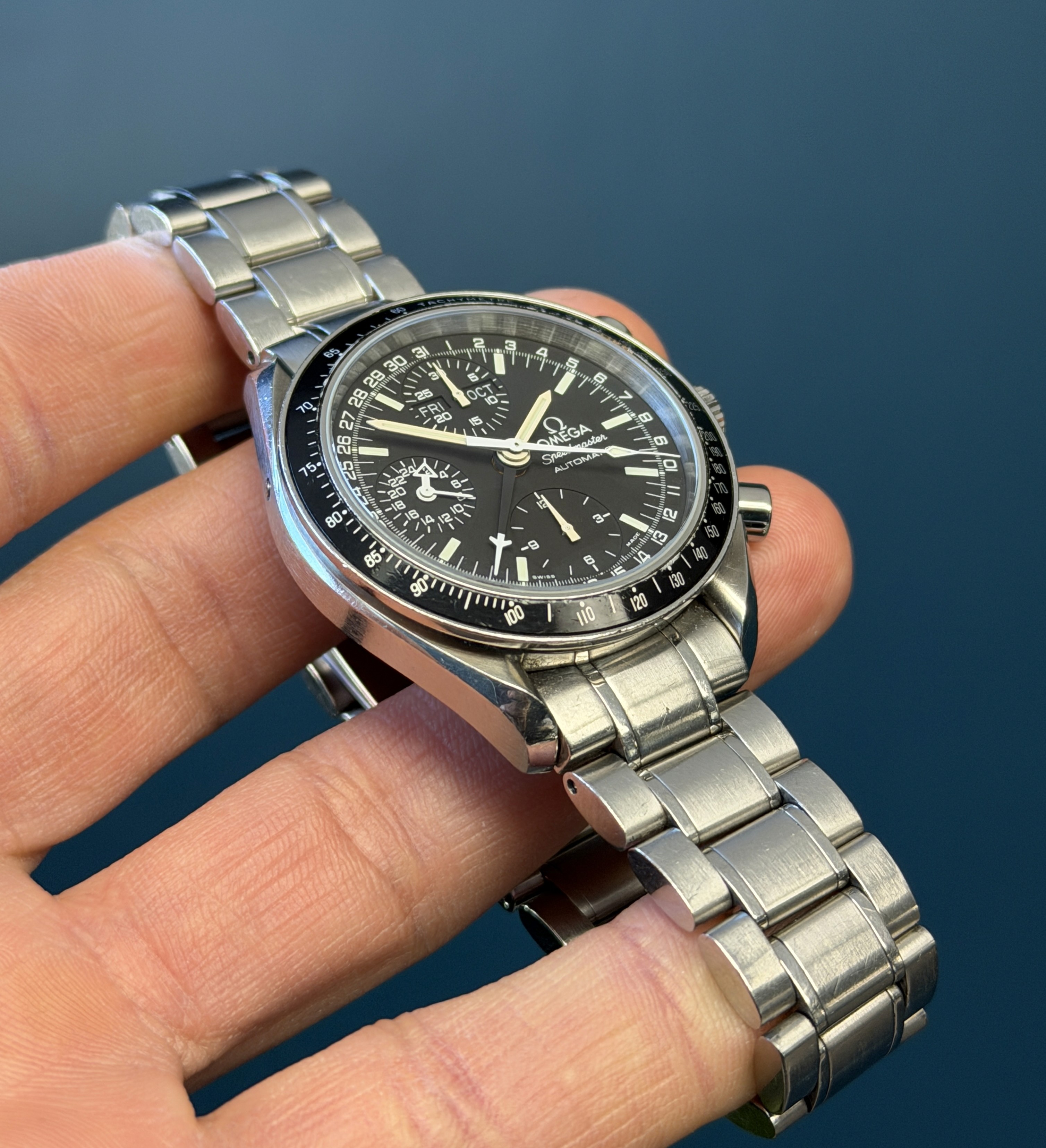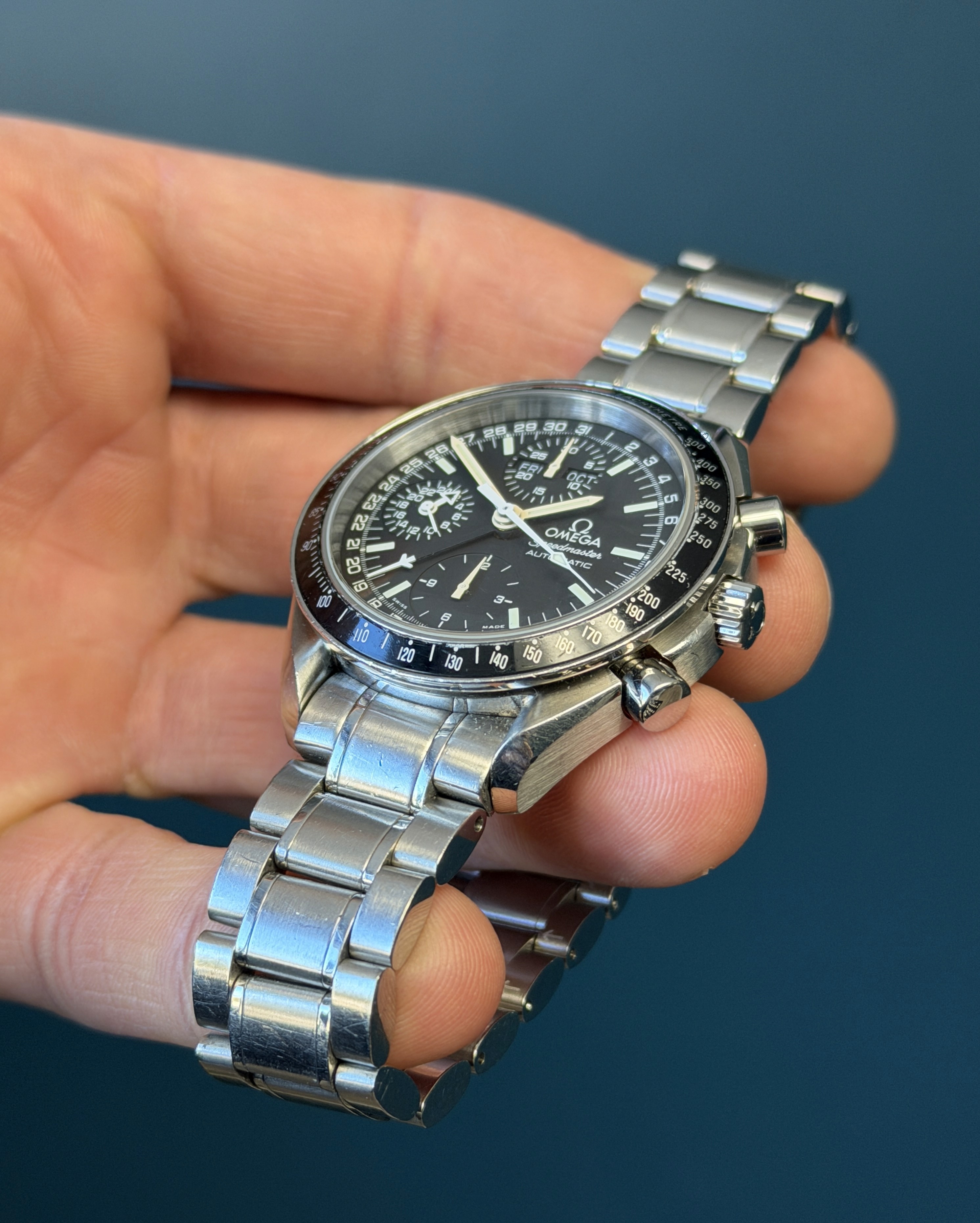 The Vintage Omega Speedmaster Reference 3520.50 is a remarkable timepiece that seamlessly blends historical significance with timeless design, offered here with its original box and papers. This exquisite watch features a robust stainless steel case and bracelet, exemplifying Omega's renowned craftsmanship. The black dial, adorned with luminous hands and pumpkin patina hour markers, includes three sub-dials and a unique triple calendar complication, providing both aesthetic appeal and functional versatility. Powered by the reliable Omega Caliber 1151 automatic movement, this Speedmaster ensures precise timekeeping and durability. The inclusion of the original box and papers enhances its value and authenticity, making it a prized addition for collectors and enthusiasts. The Vintage Omega Speedmaster Reference 3520.50 is not just a watch; it's a piece of horological history that stands as a testament to Omega's legacy of excellence and innovation.