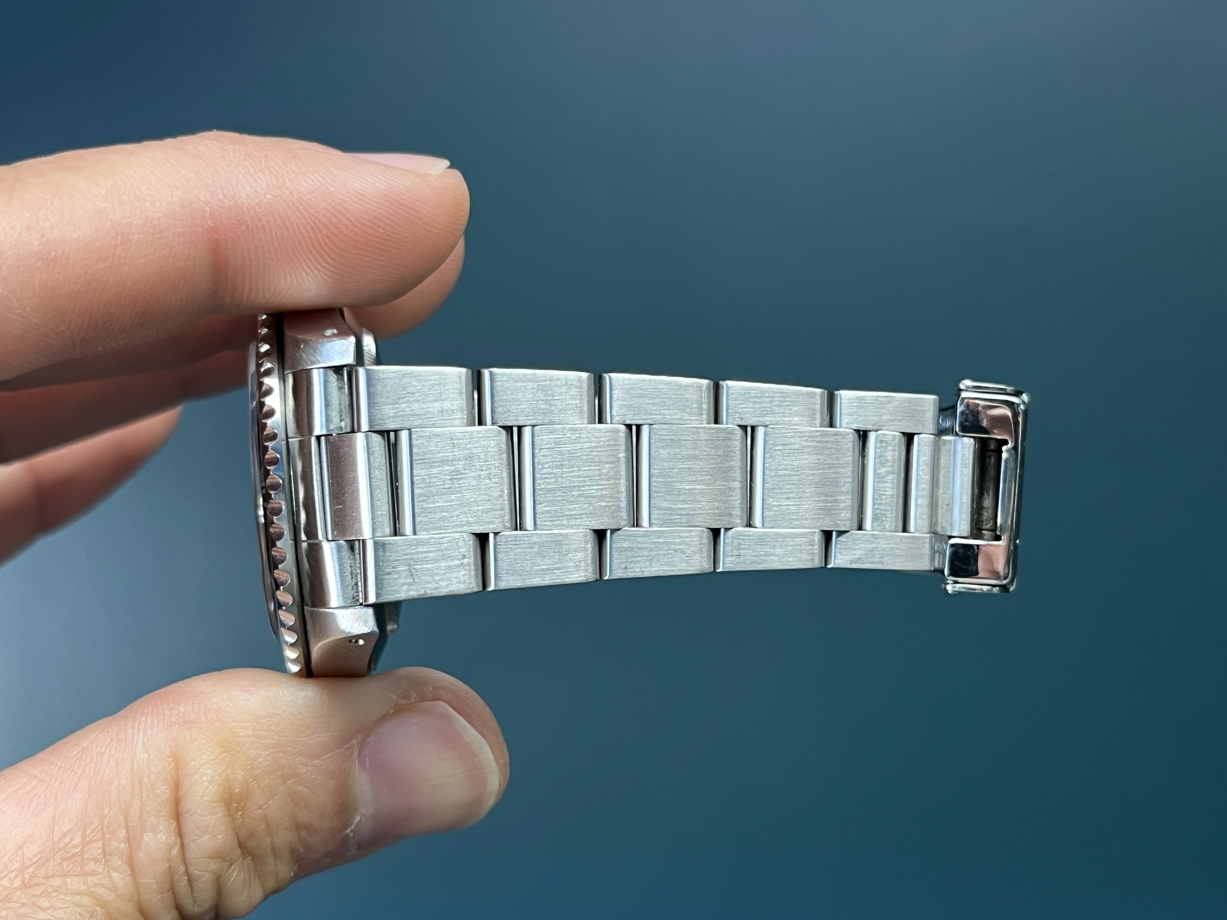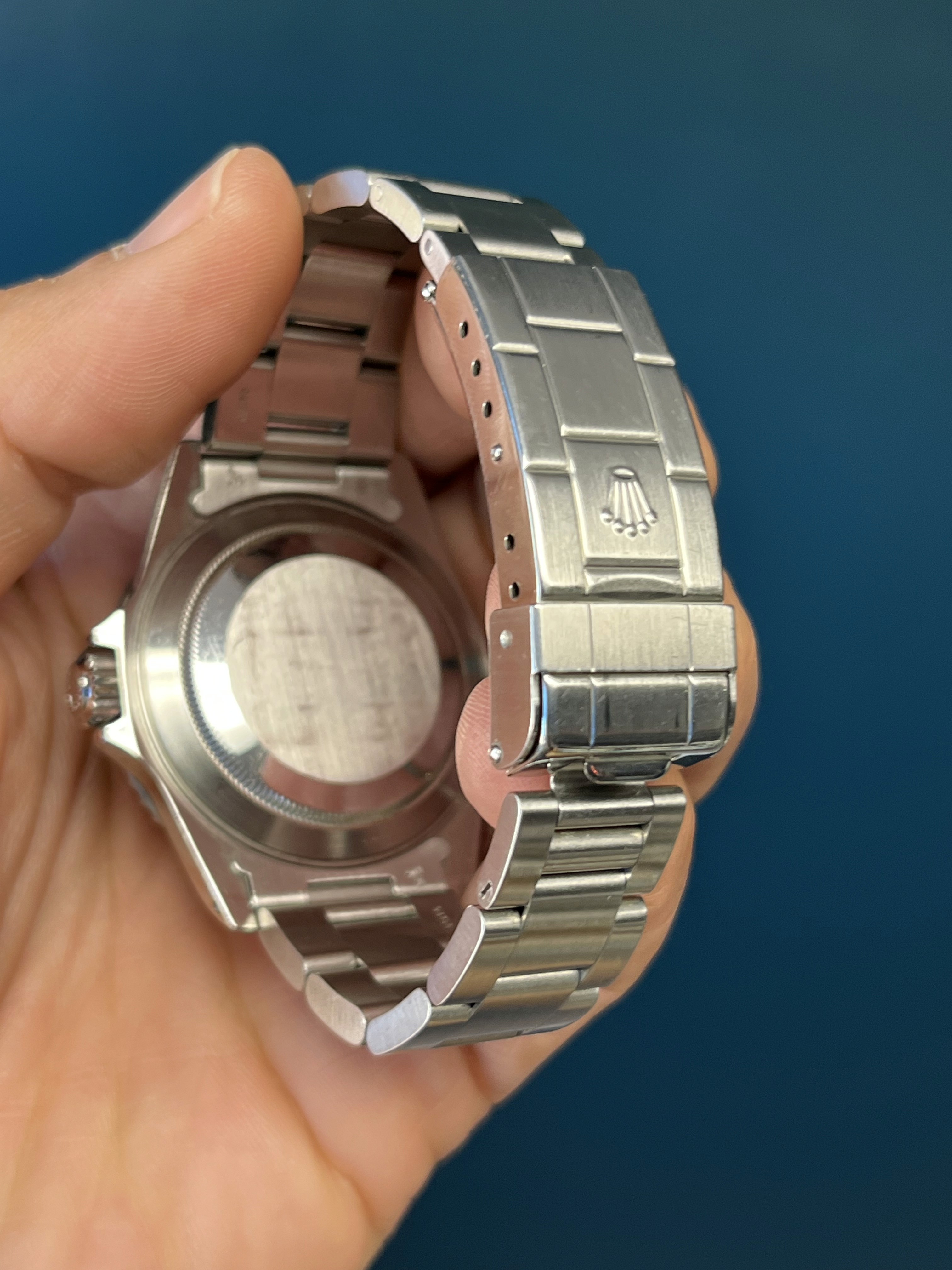 This example comes with its box and punched papers dated 2/28/03. The watch itself is in excellent neo vintage condition. The case is excellent with thick sharp lugs. The insert is in nice condition. The dial is excellent with matching patina. The bracelet has 12 links + div ext. and shows no stretch. Here is a great example with box & papers with a great look.