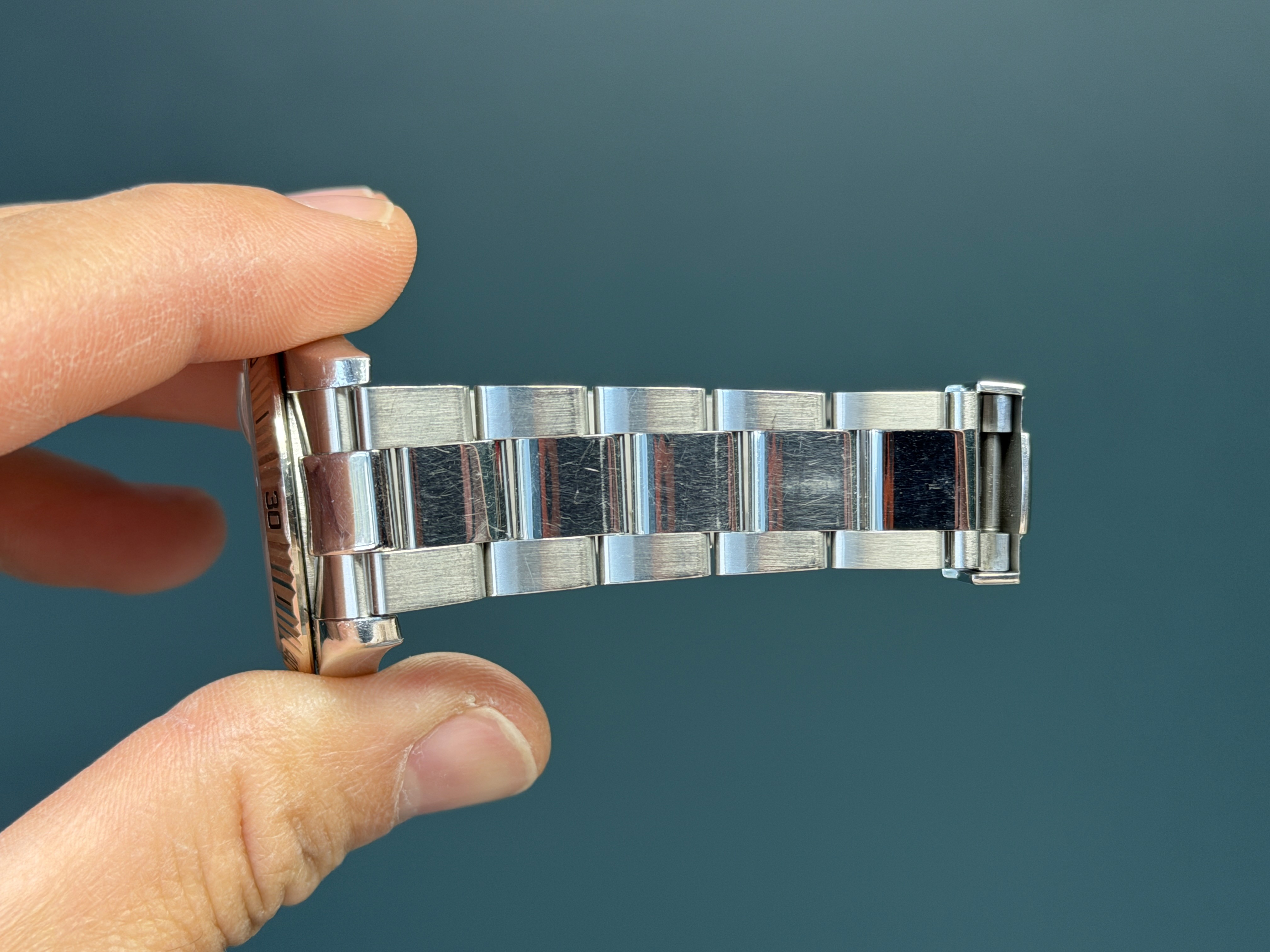 Todays example comes to us with an engraved bezel and as a full set with box and papers. The bezel is crisp. The bracelet has 11 large and 12 small links and shows no stretch.