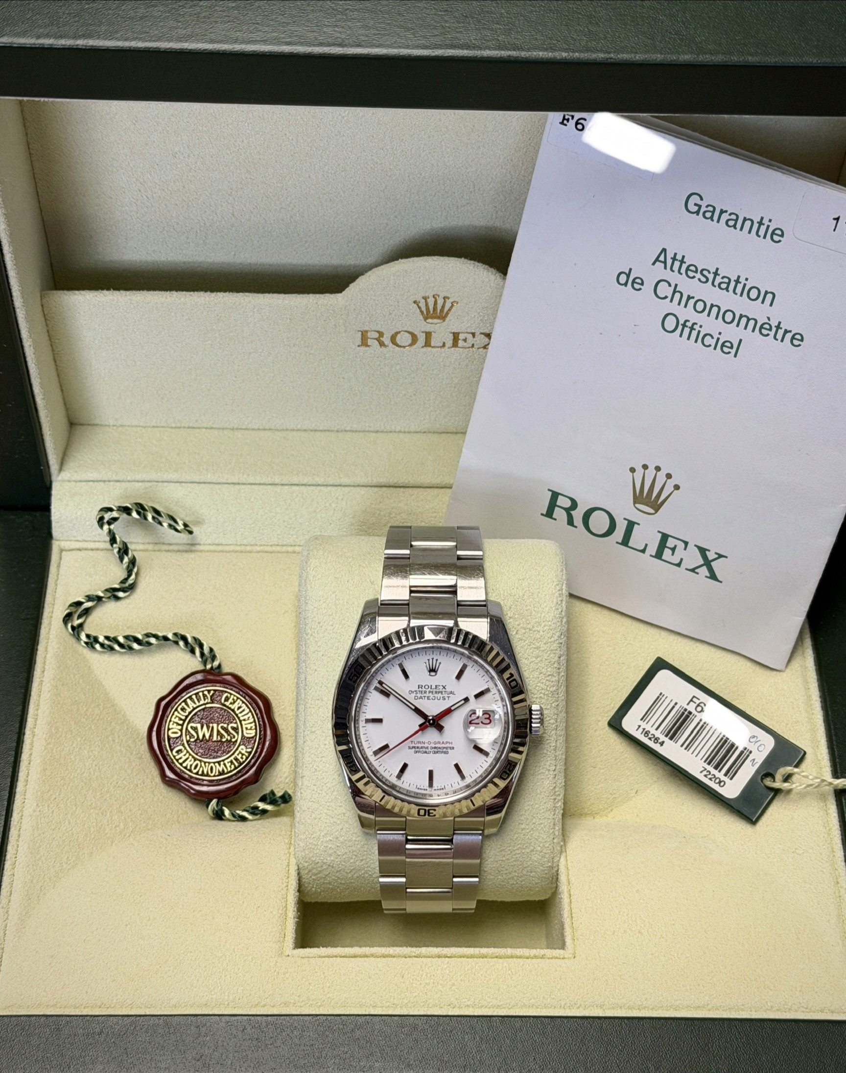 The Rolex Datejust Turn-O-Graph Reference 116264 is a distinctive and historically significant timepiece that bridges the gap between sport and sophistication. Crafted in stainless steel with an 18K white gold fluted rotating bezel, this model revives one of Rolex’s earliest tool watches—the original Turn-O-Graph, first introduced in the 1950s as a precursor to the Submariner and GMT-Master.