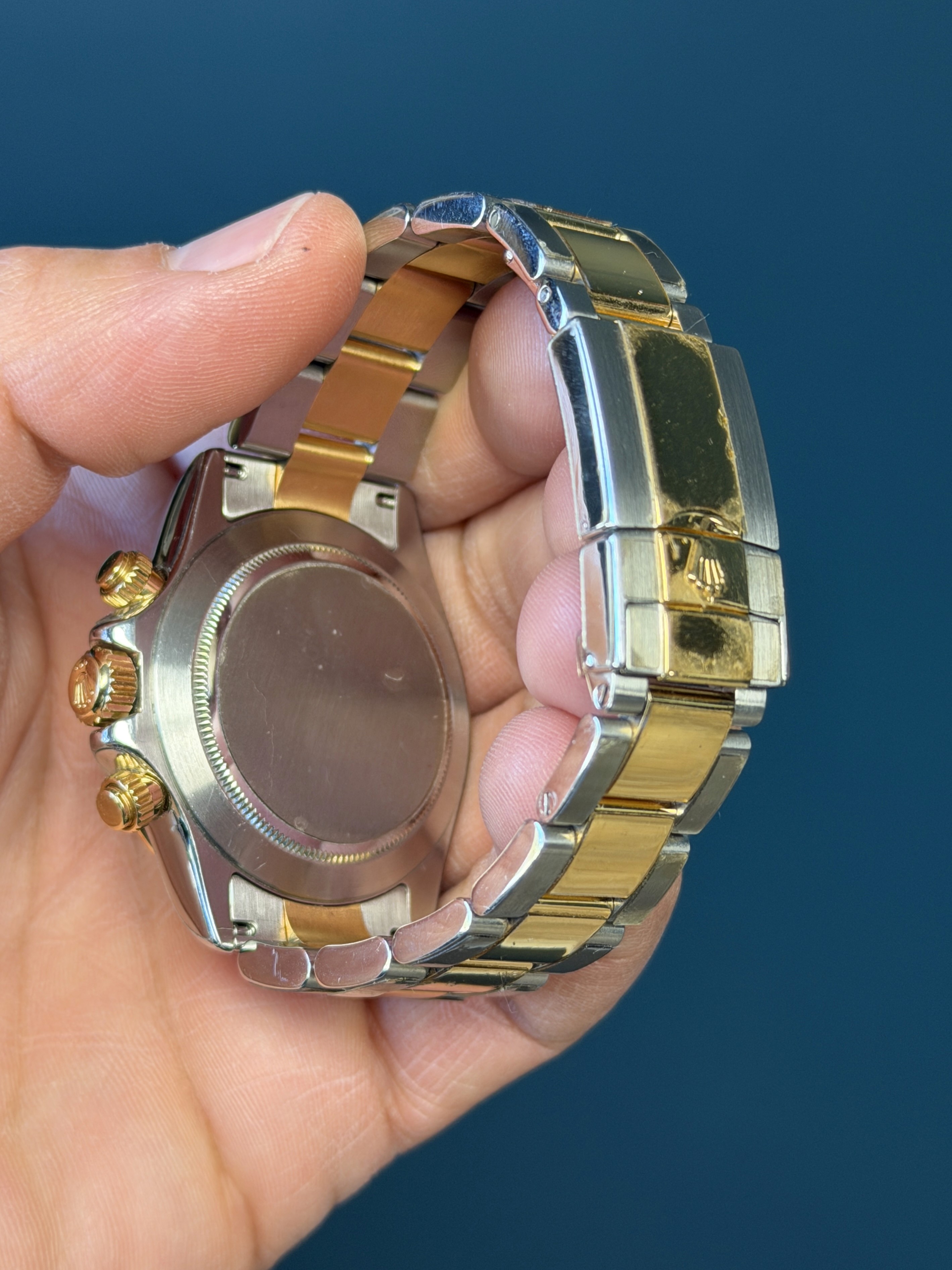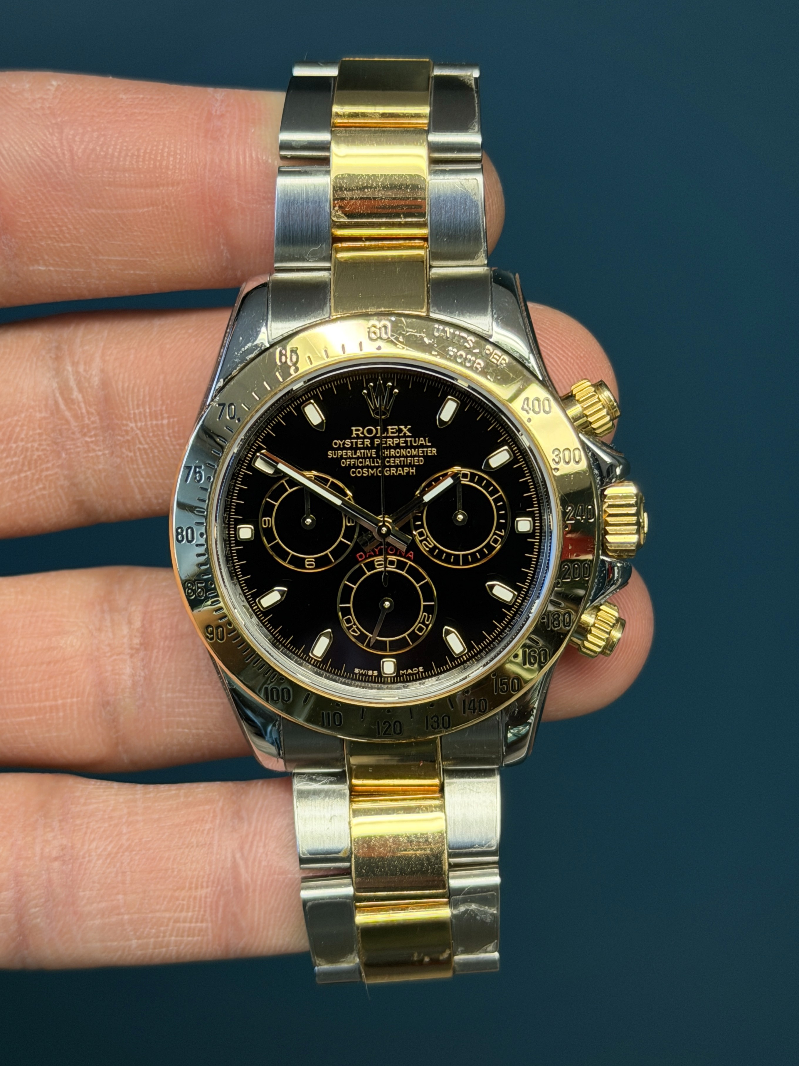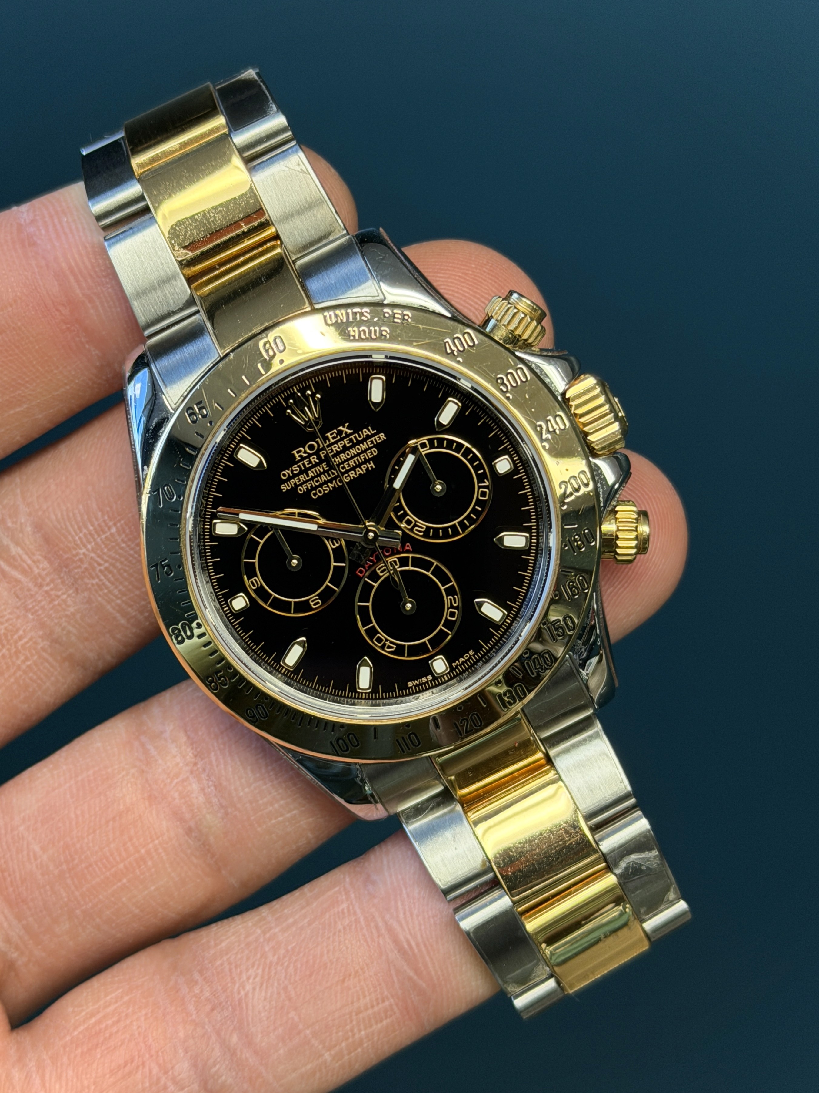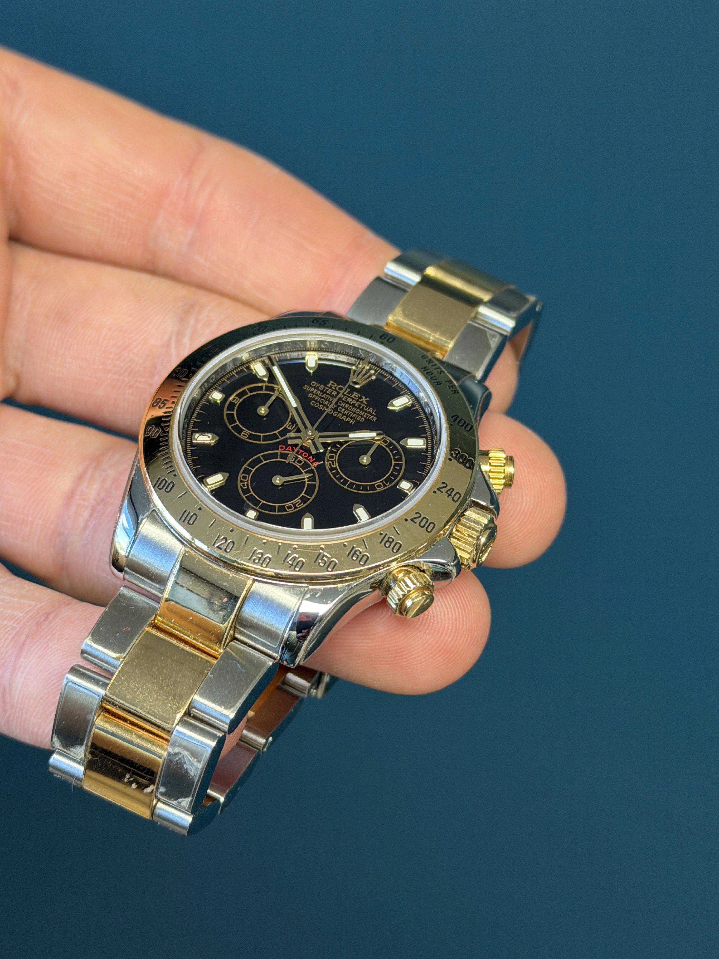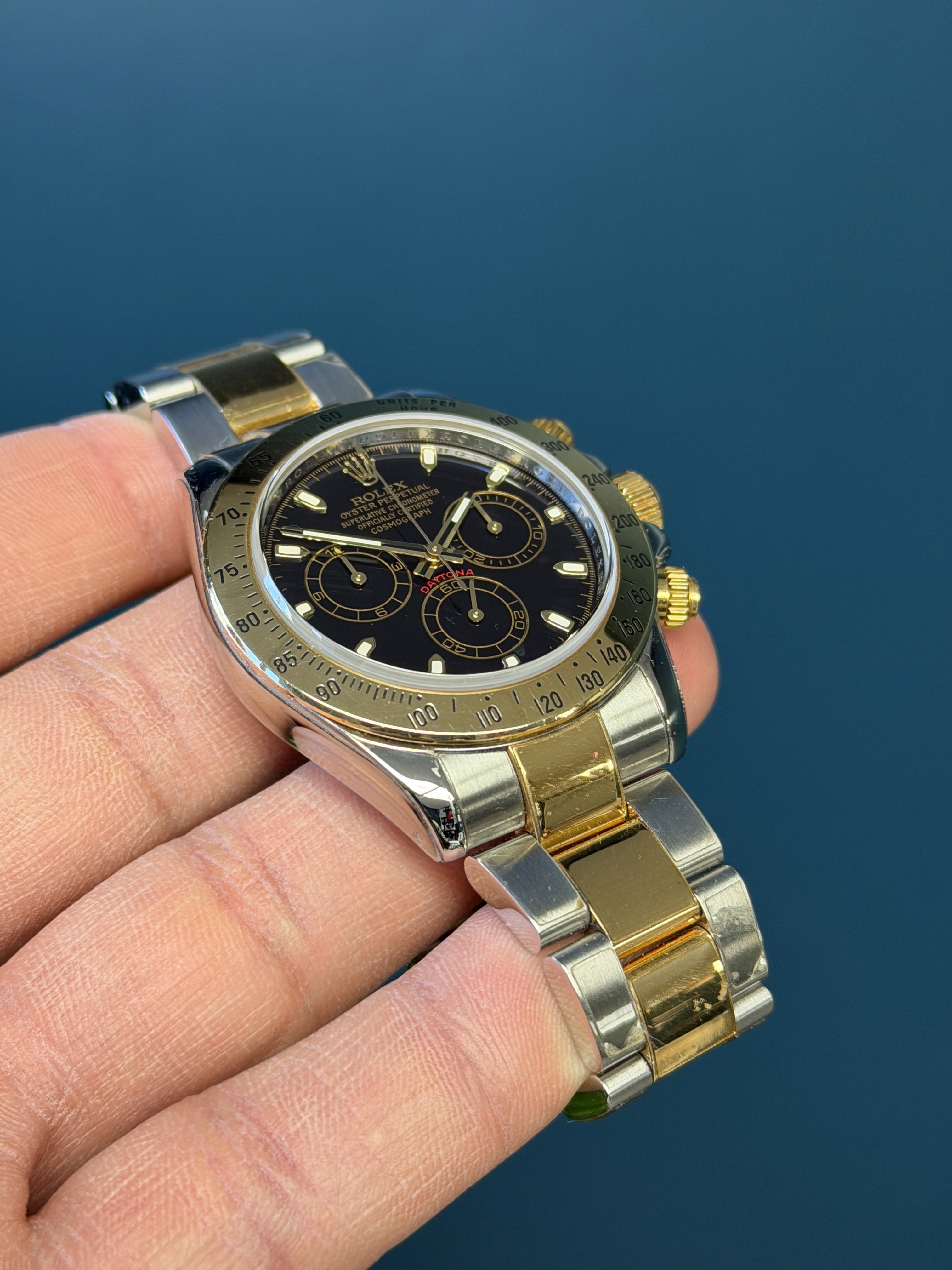 The Rolex Daytona Reference 116523 is a stunning fusion of luxury and performance, showcasing a sophisticated two-tone design crafted from stainless steel and 18k yellow gold. This iconic chronograph features a sleek, scratch-resistant sapphire crystal and a black dial for precise time tracking. Driven by the high-performance Rolex Caliber 4130 automatic movement, it guarantees exceptional accuracy and reliability. The engraved tachymetric scale on the bezel makes it perfect for high-speed pursuits, cementing its status as a favorite among racing enthusiasts and collectors. The Daytona 116523 is a timeless embodiment of Rolex's commitment to excellence and innovation.