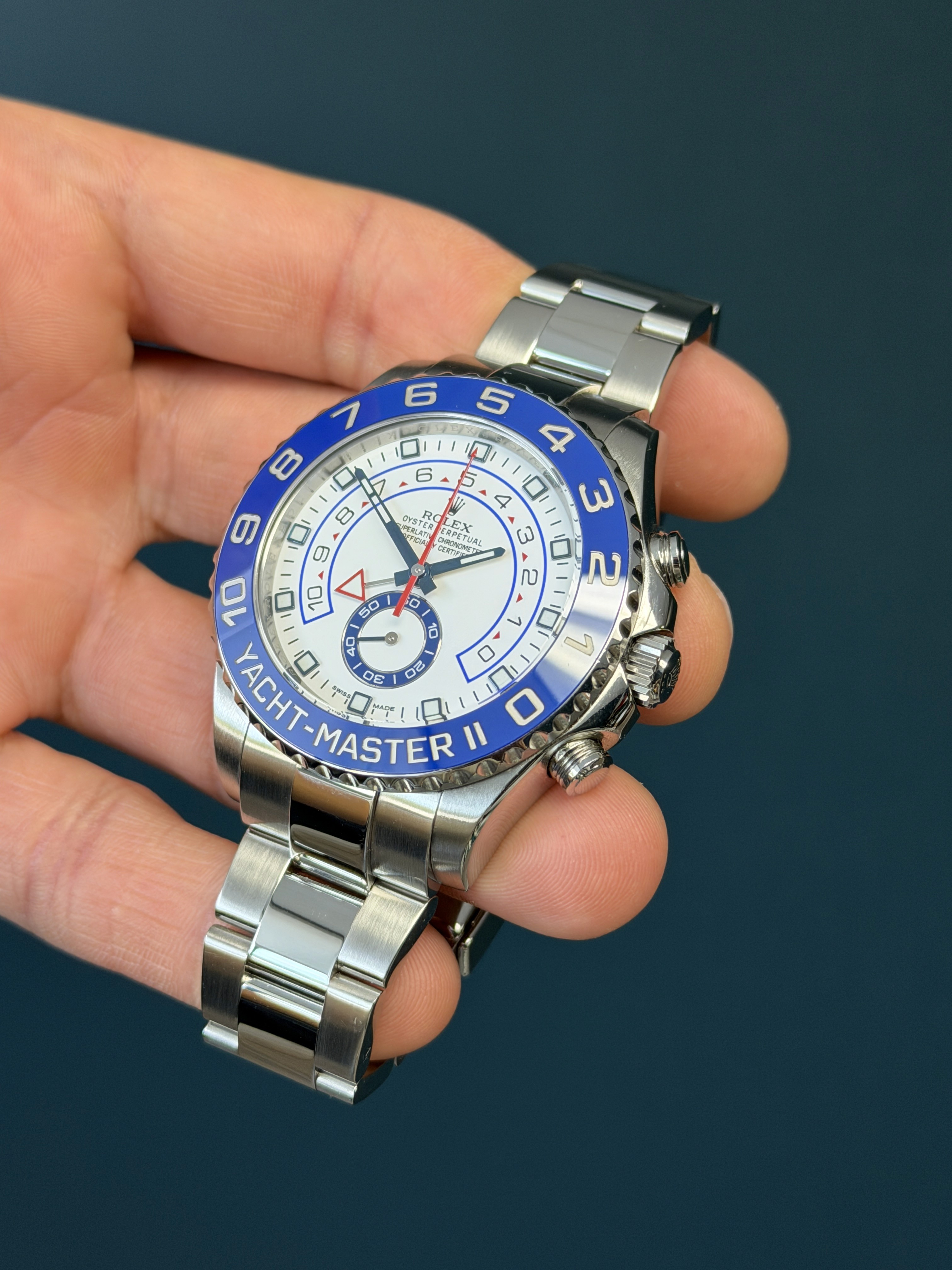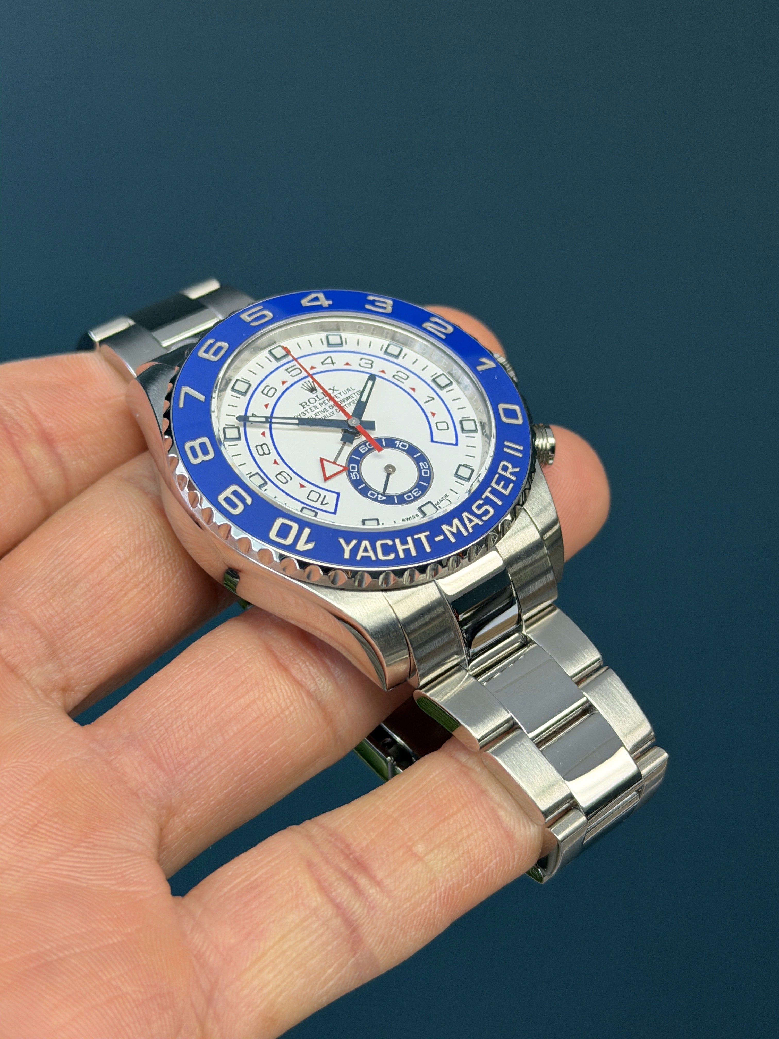 Powered by the Rolex caliber 4161 automatic movement, the Yacht-Master II delivers exceptional mechanical complexity, reliability, and a 72-hour power reserve. The robust Oyster bracelet with Oysterlock clasp ensures durability and secure wear in all conditions.