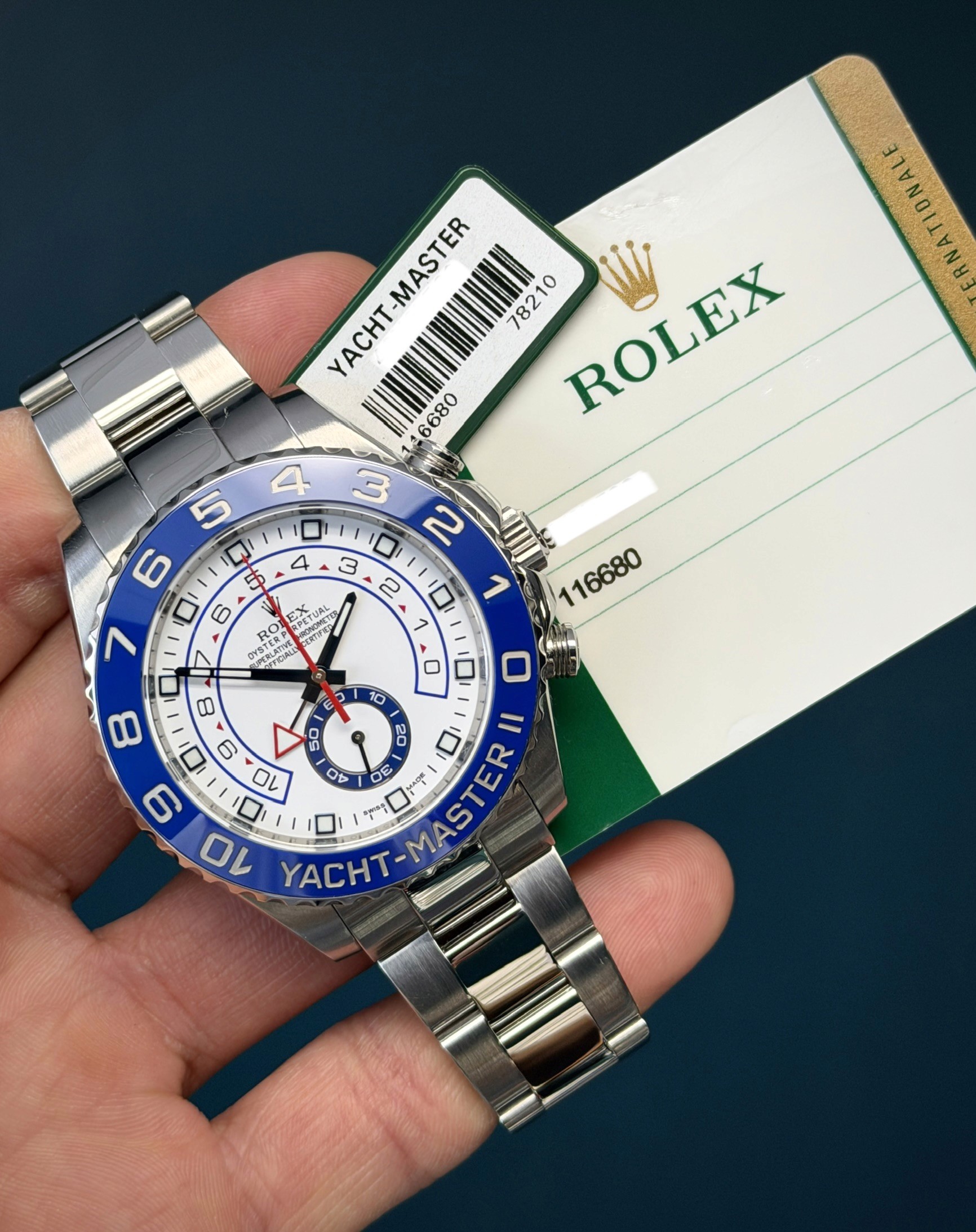 The Rolex Yacht-Master II reference 116680 is a bold and highly technical regatta chronograph designed for precision sailing and commanding wrist presence. This 2015 example is offered in excellent condition with its original warranty card and both hang tags.