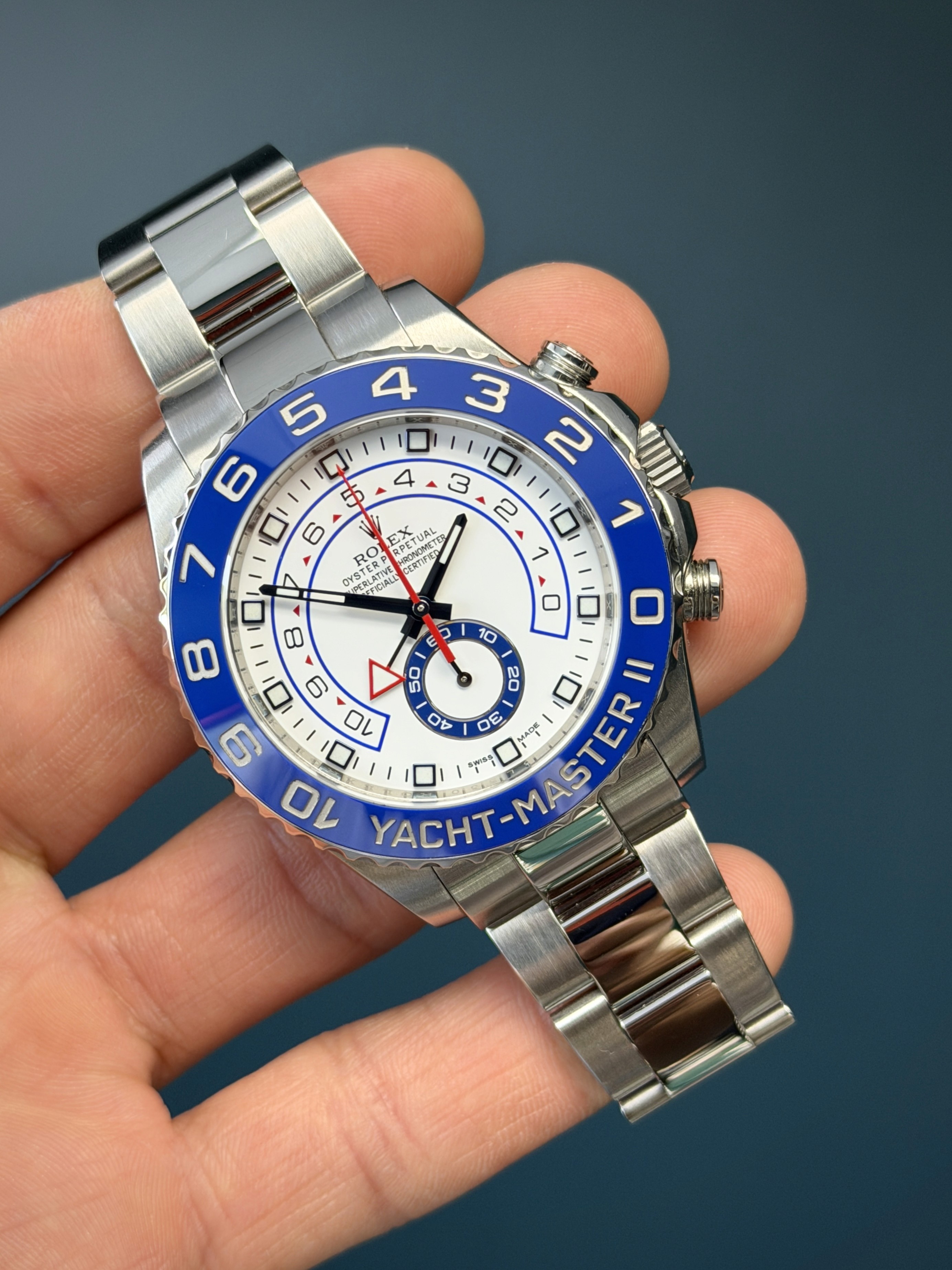 Housed in a 44mm Oyster case crafted from stainless steel, the watch features a striking white dial with blue and red accents, designed for maximum legibility and sporty impact. The standout feature is its programmable regatta countdown timer, controlled via the signature Ring Command bezel, allowing precise synchronization for yacht racing starts.