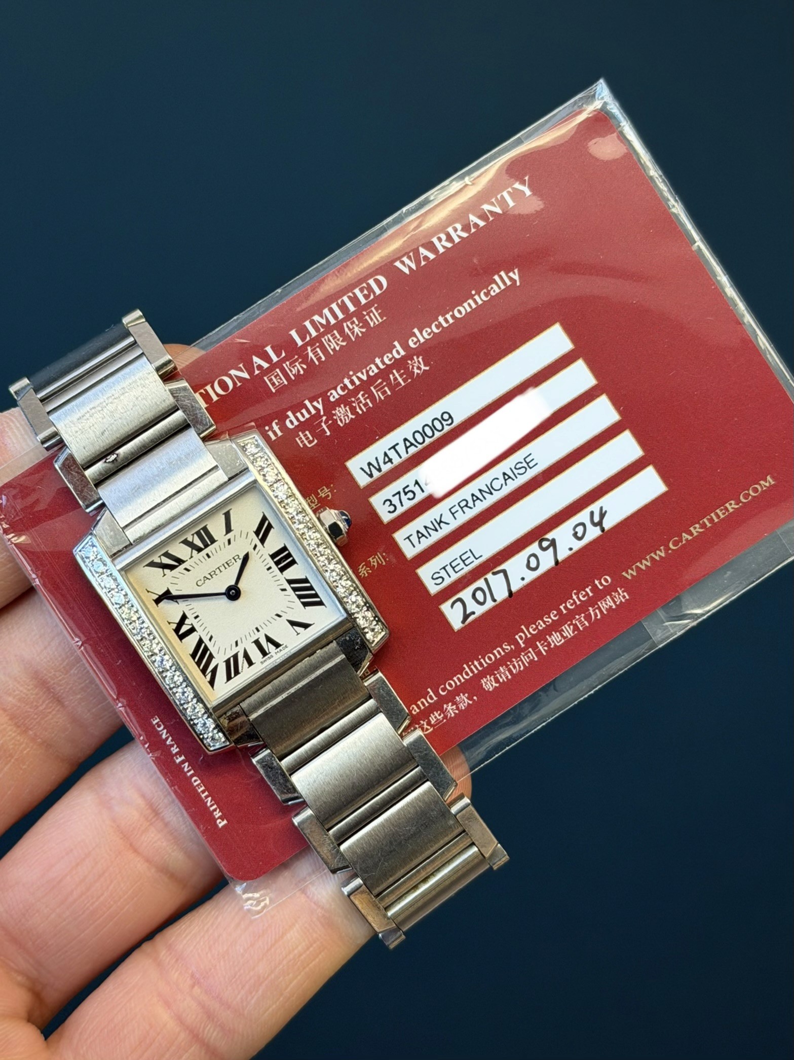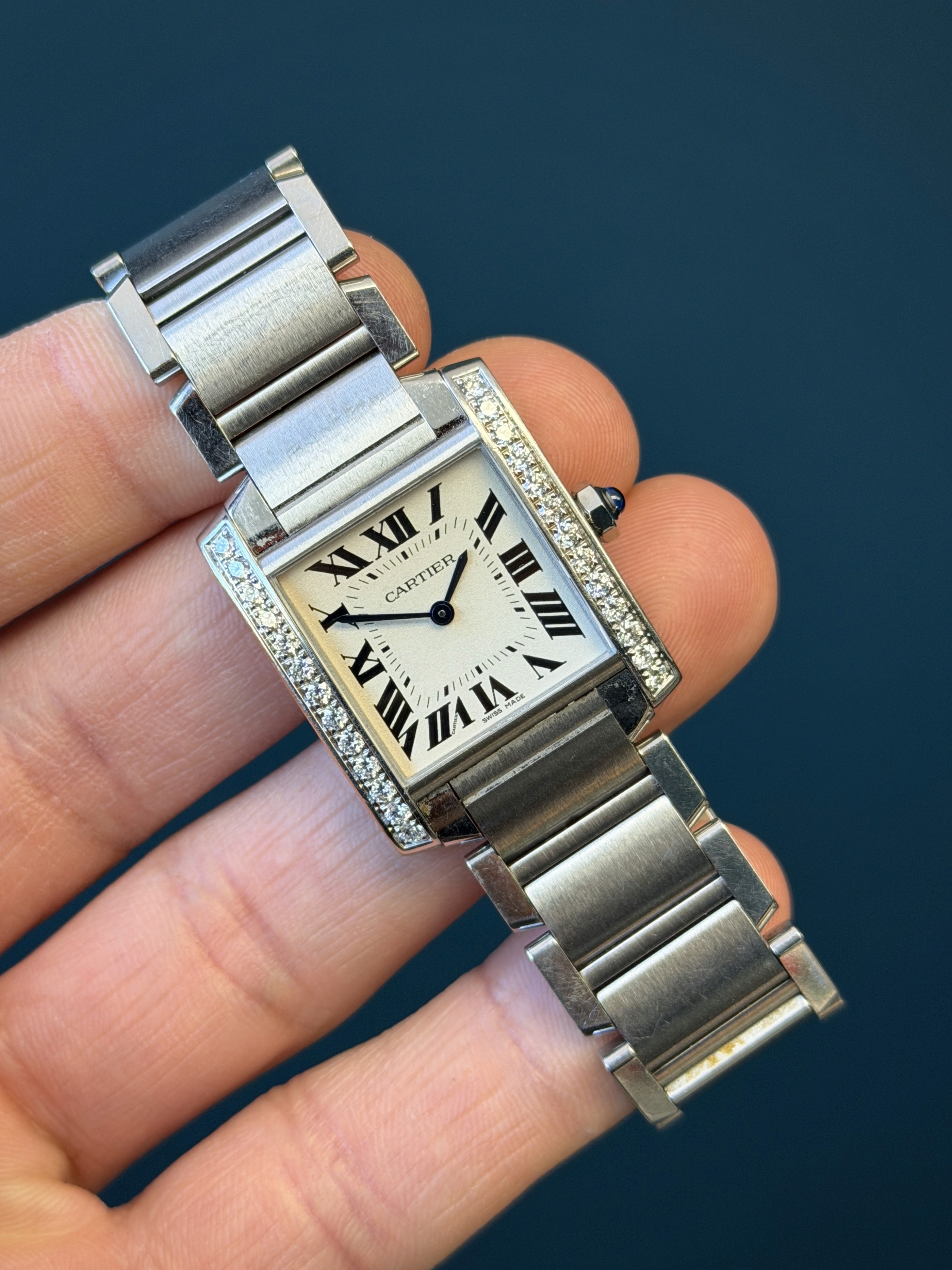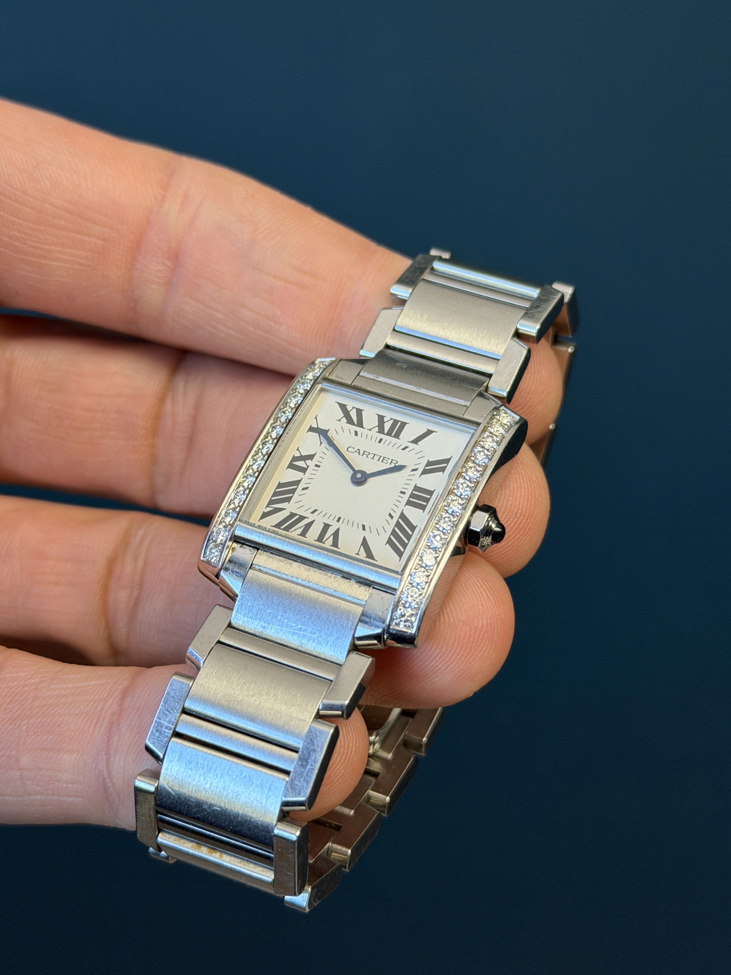 The clean, balanced dial features Cartier’s signature Roman numerals and blued steel hands, offering unmistakable identity and effortless legibility. The factory diamond setting enhances the case with tasteful sparkle—never overpowering, but perfectly complementing the watch’s sophisticated lines.