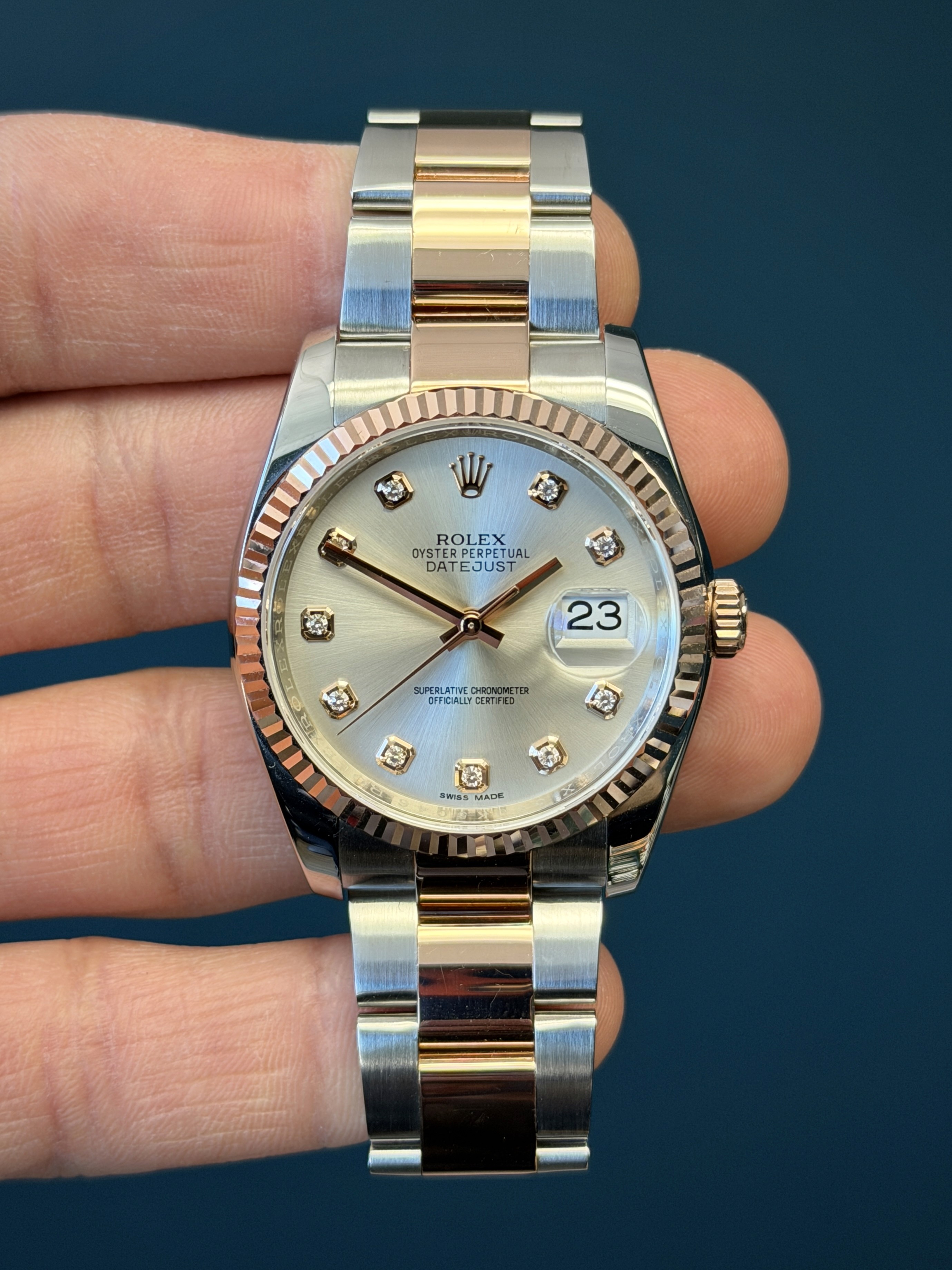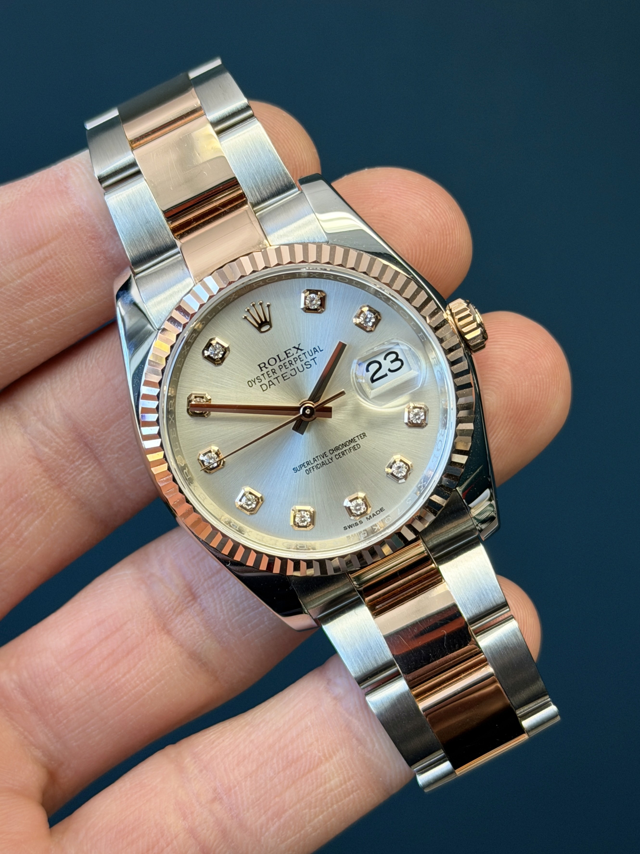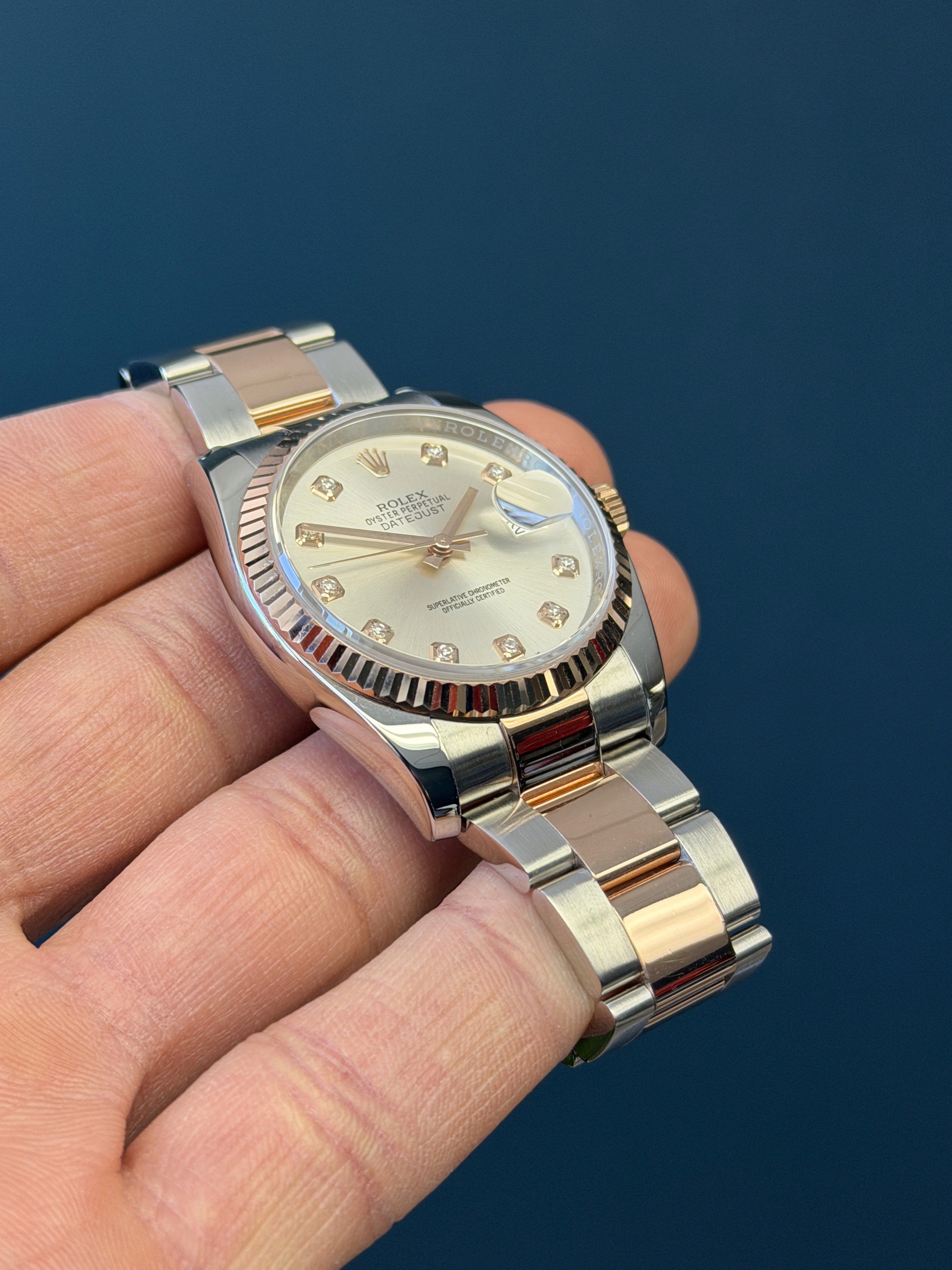 Crafted in stainless steel and 18k Everose gold, it has that warm, unmistakable two-tone look that works just as well with a suit as it does with jeans. The rose gold fluted bezel adds depth and character, while the standout feature is the factory silver diamond dial — set by Rolex with genuine diamond hour markers for refined sparkle without being over the top.