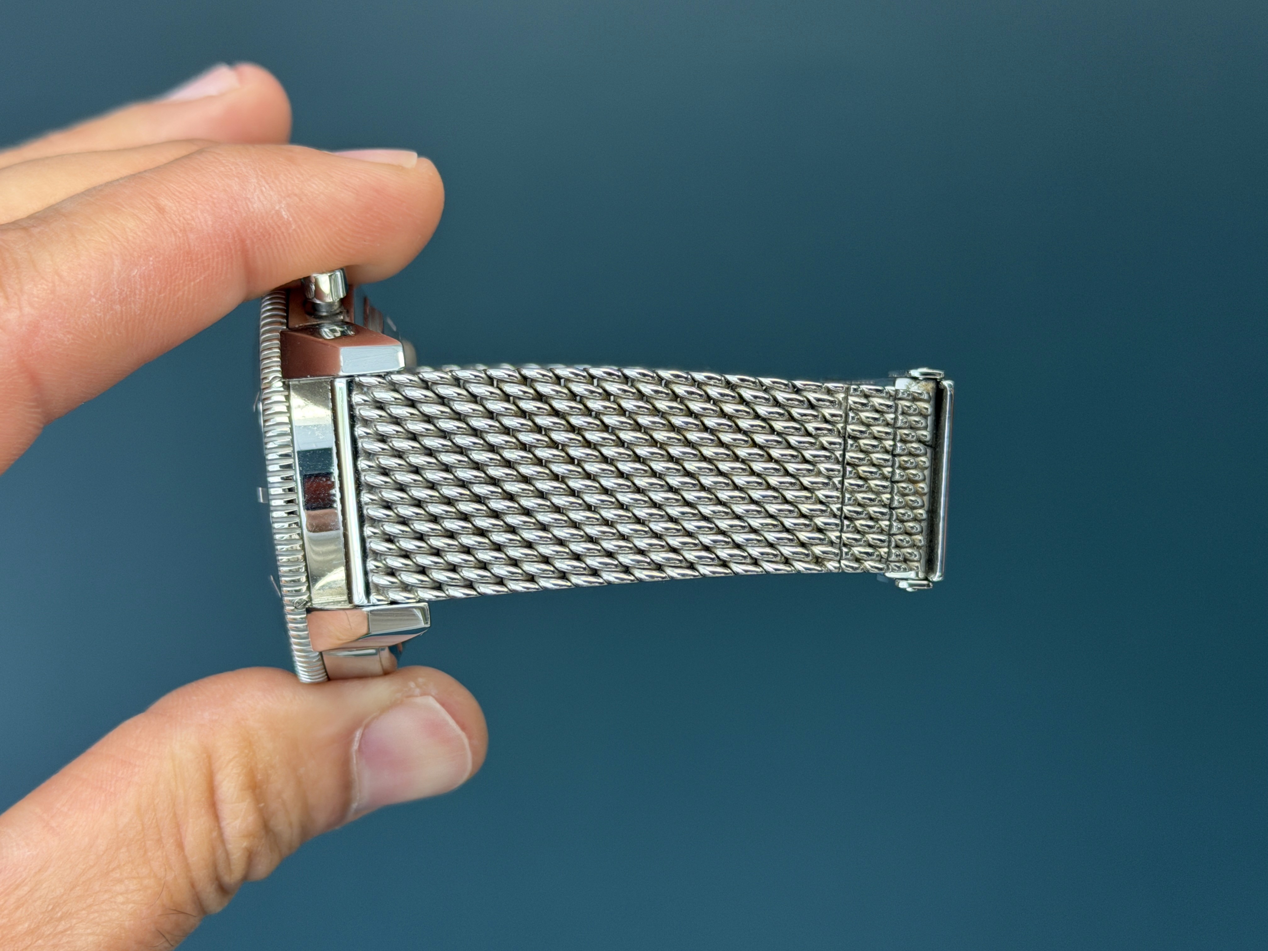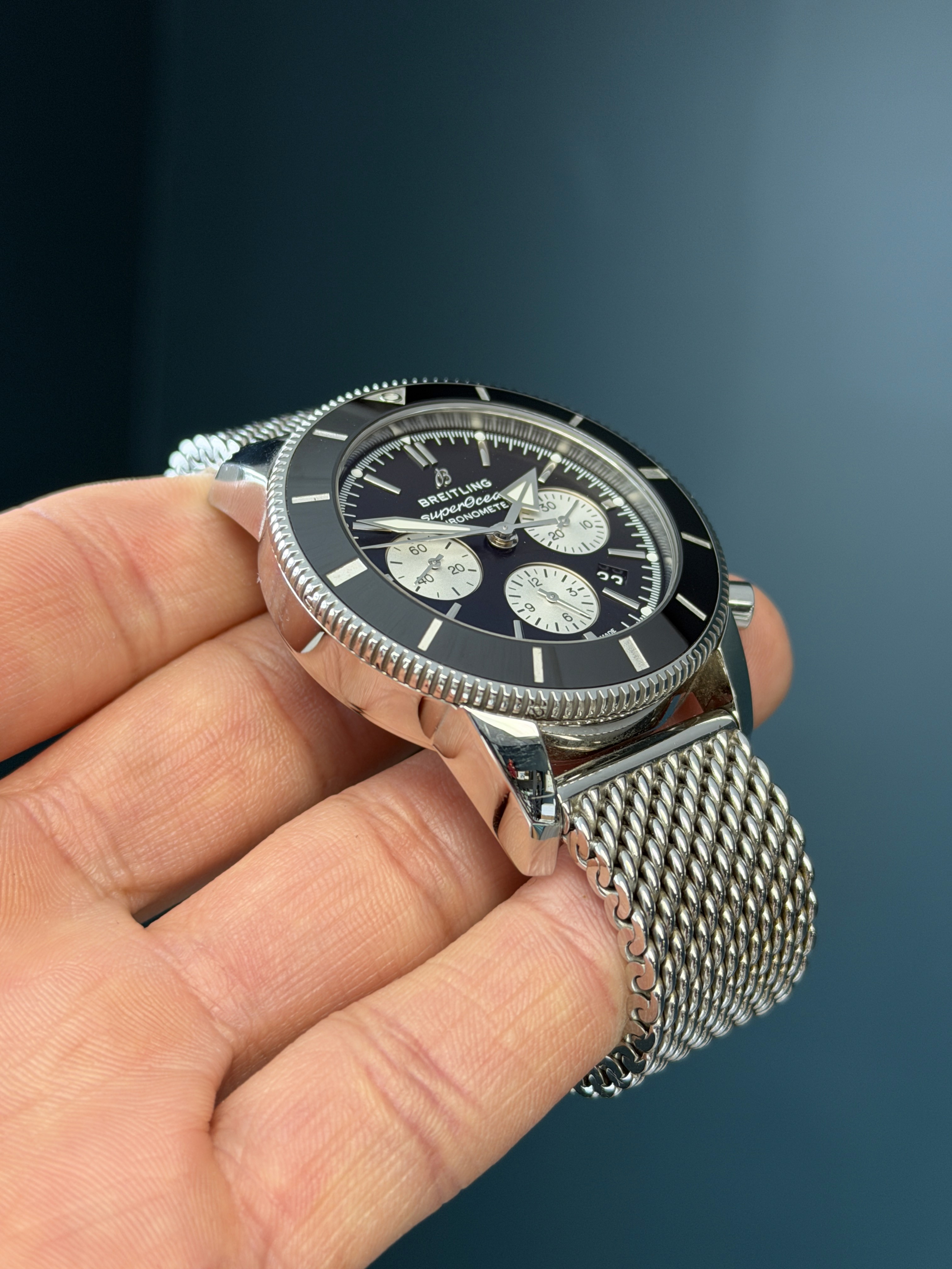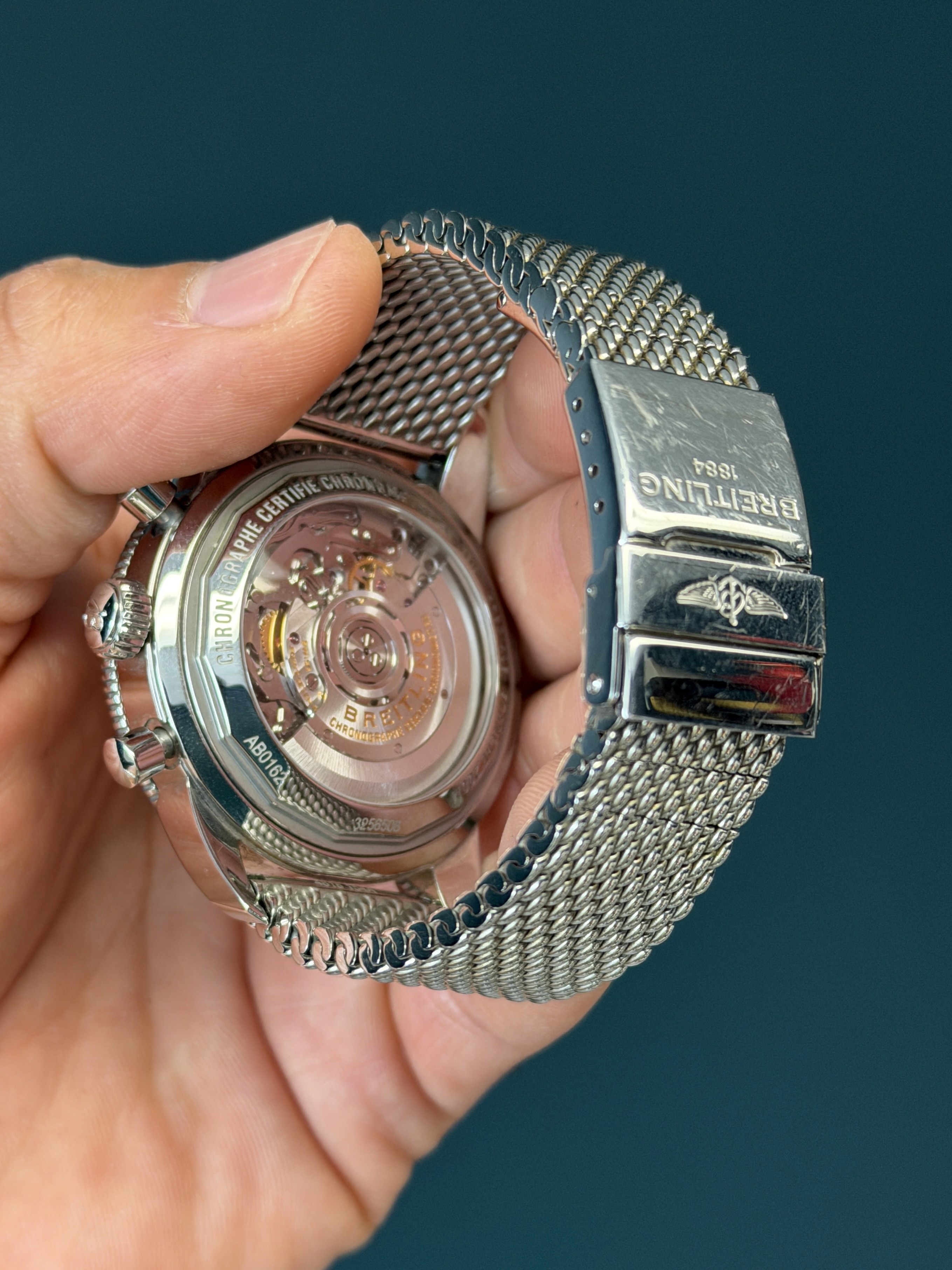 At its core is the in-house Breitling Manufacture Caliber 01, a COSC-certified automatic chronograph movement renowned for its precision, column-wheel construction, and approximately 70-hour power reserve. The watch is fitted with the signature stainless steel Aero Classic mesh bracelet, offering both comfort and a distinctive vintage aesthetic.