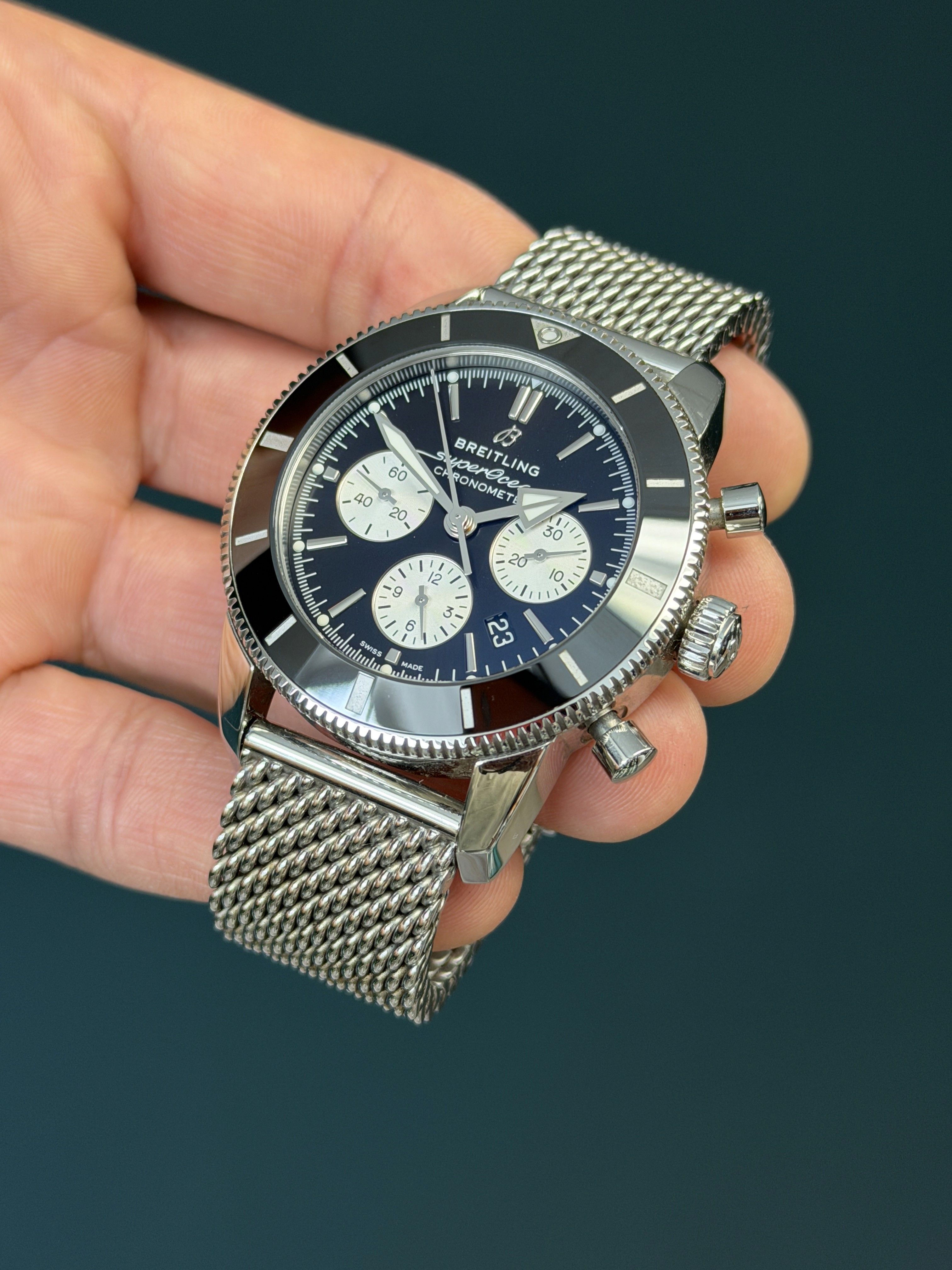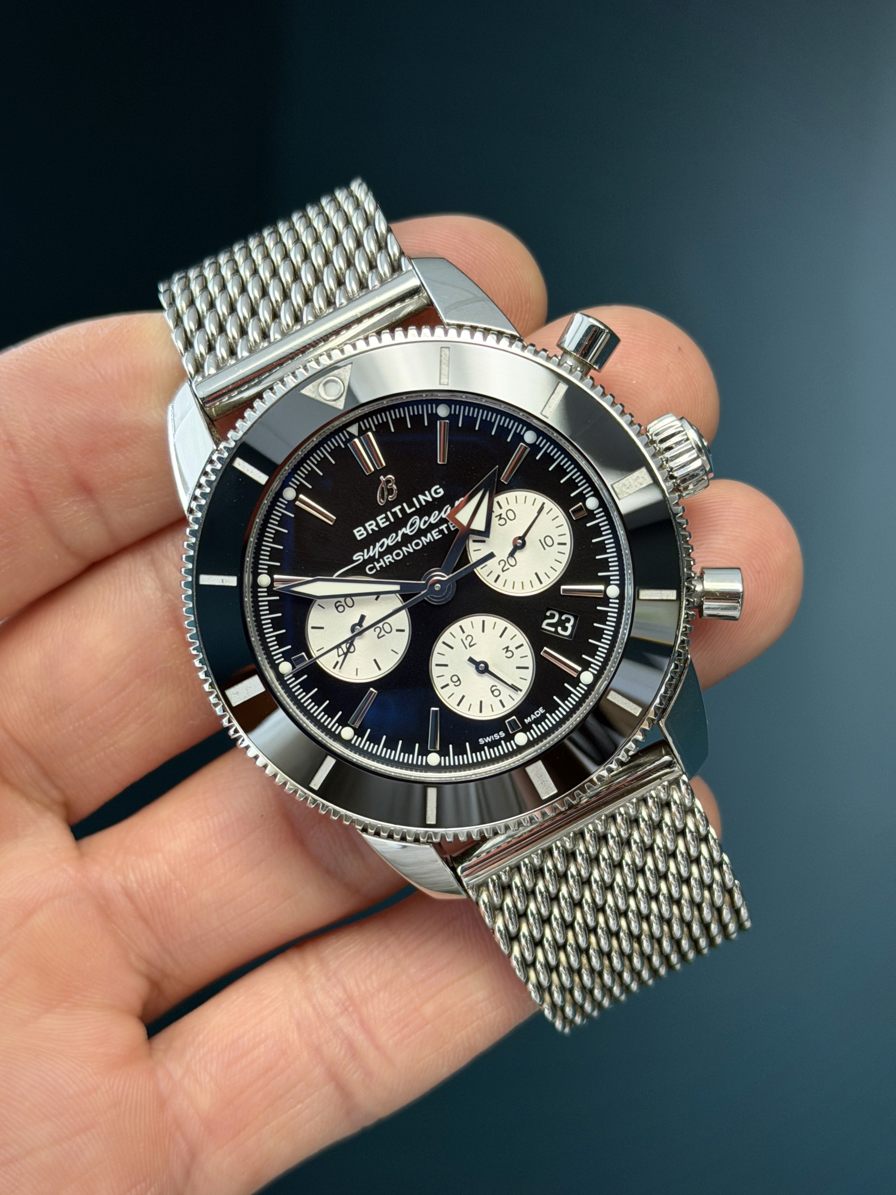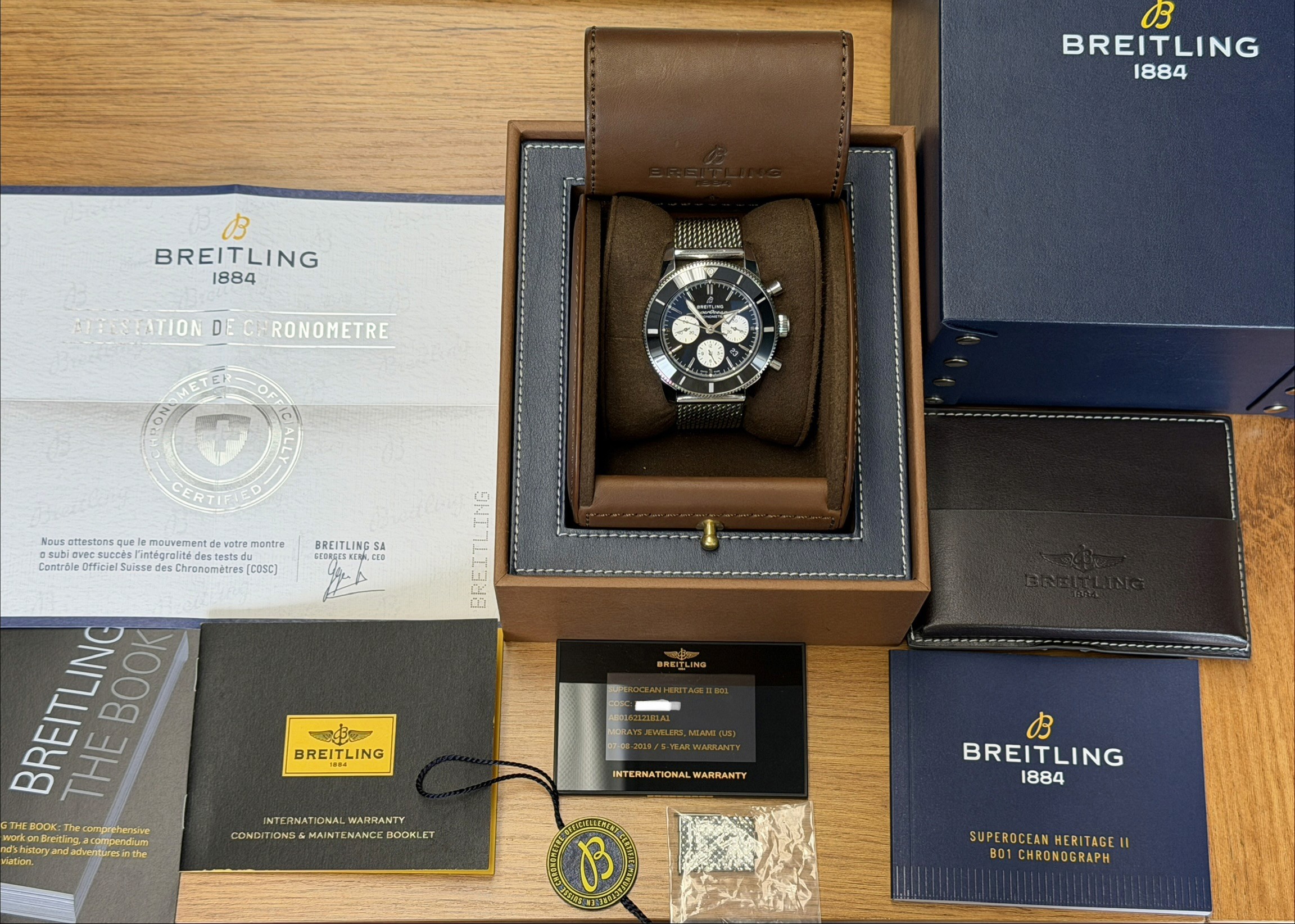 Presented as a full complete set, this 2019 example includes its original box, papers, and accessories, enhancing both its collectability and value. A versatile and well-balanced sports watch, the Superocean Heritage II B01 Chronograph stands as one of Breitling’s most compelling modern classics.