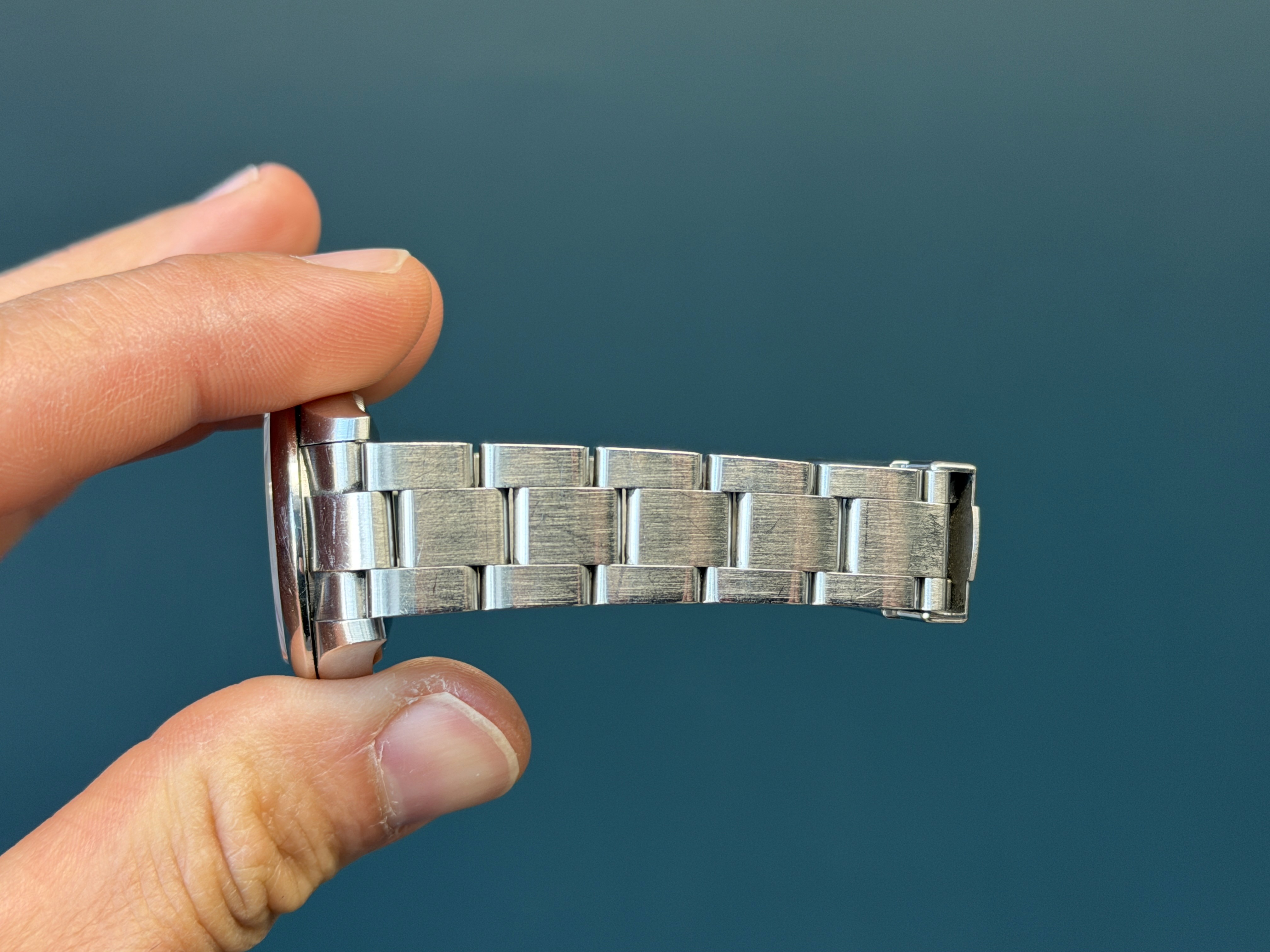 Today's example is in excellent pre-owned condition with a sharp thick no holes case and engraved bezel. This example comes to us with original papers and serial hang tag dated 3/2019. The purple dial is excellent showing no wear. The bracelet has 11 total links and shows no stretch.