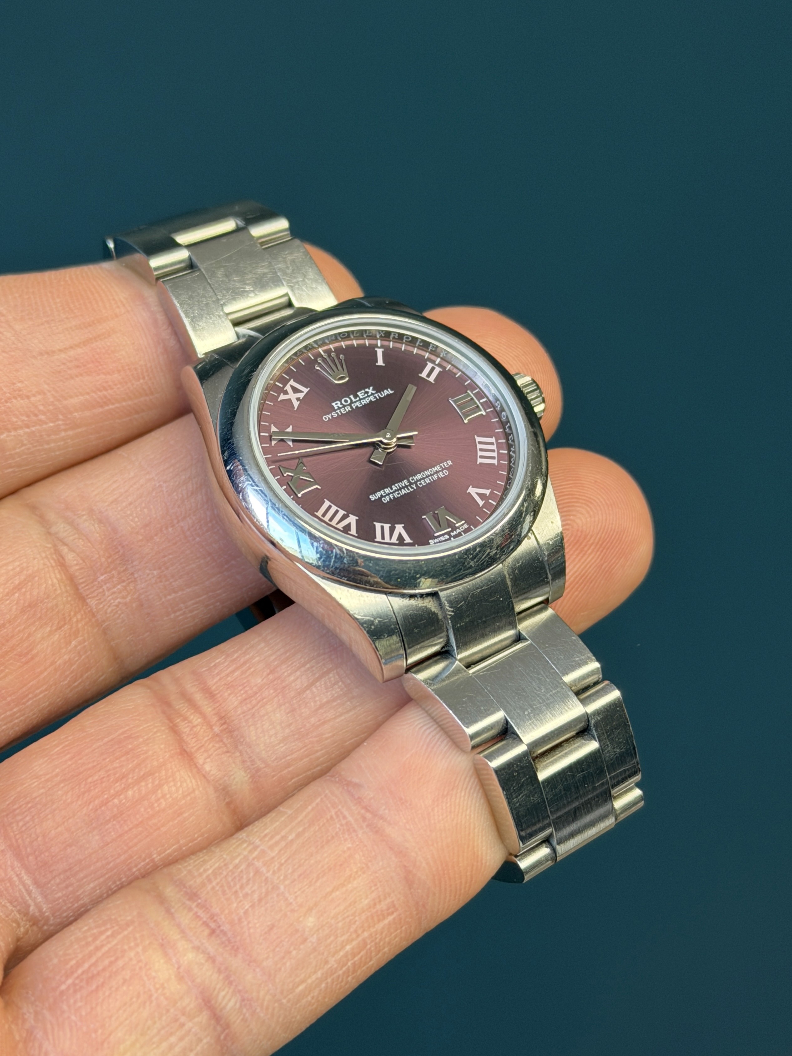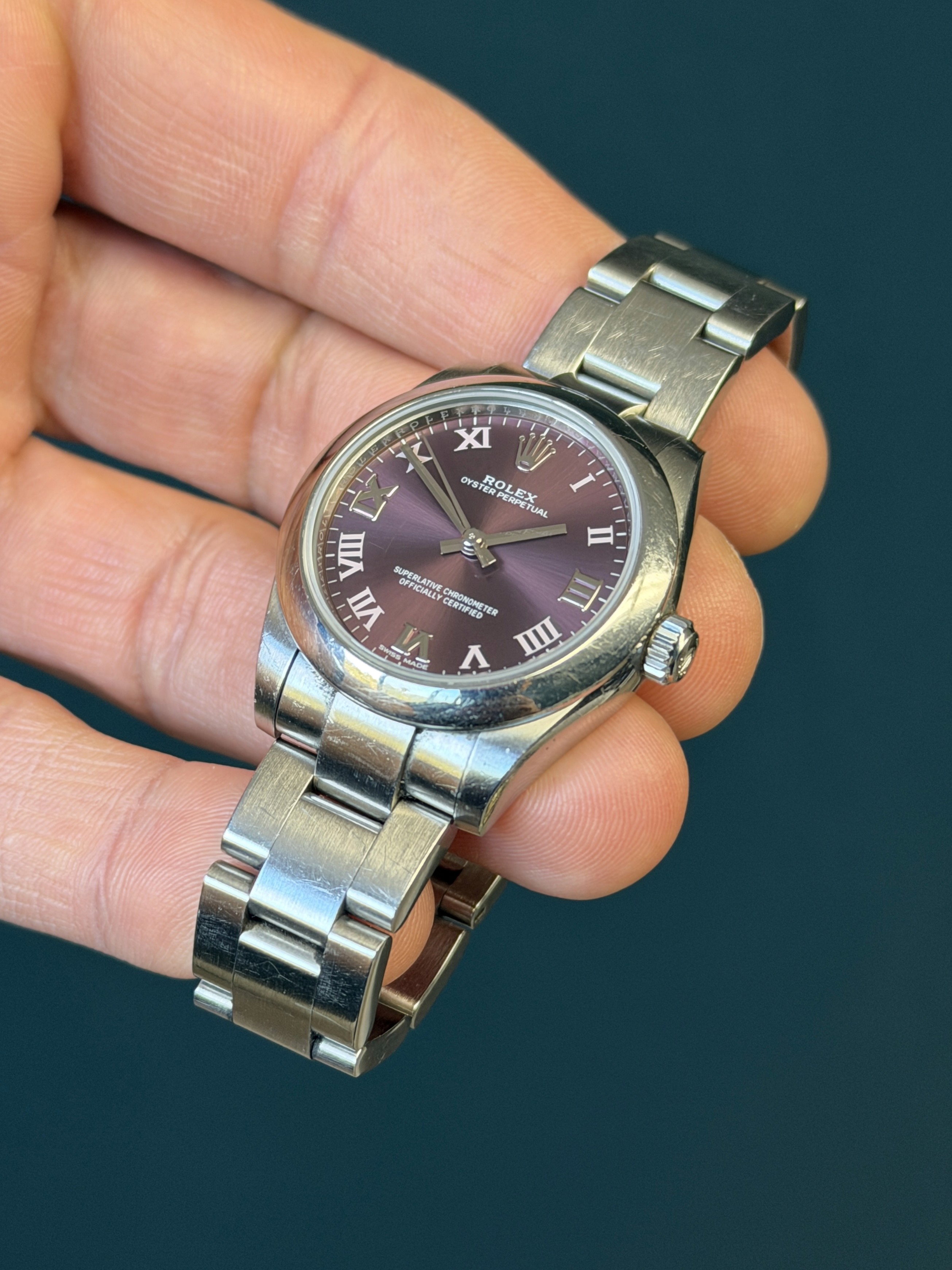 The Rolex Oyster Perpetual reference 177200 is a refined 31mm stainless steel timepiece that showcases Rolex’s timeless simplicity with a vibrant twist. This example features a striking purple dial, adding a bold yet elegant touch to the classic Oyster design, protected by a sapphire crystal.