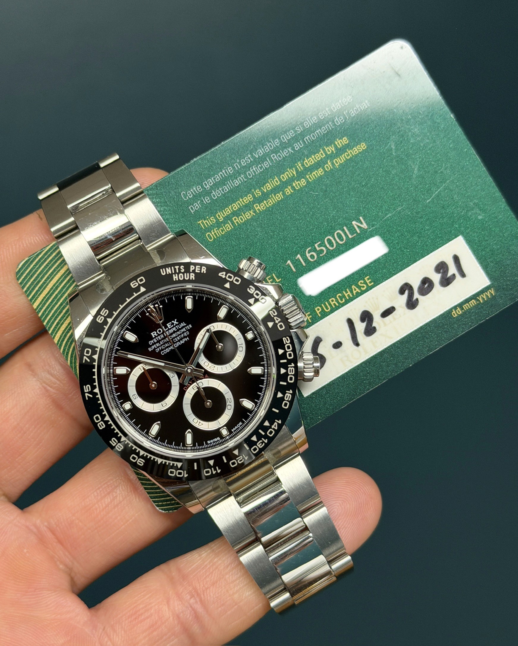 This example is offered in excellent pre-owned condition and is accompanied by its original Rolex warranty card dated 2021, making it especially appealing to collectors. Fitted with the solid Oyster bracelet and Oysterlock clasp, the Daytona 116500LN remains a modern icon—highly collectible, instantly recognizable, and a cornerstone of any serious watch collection.