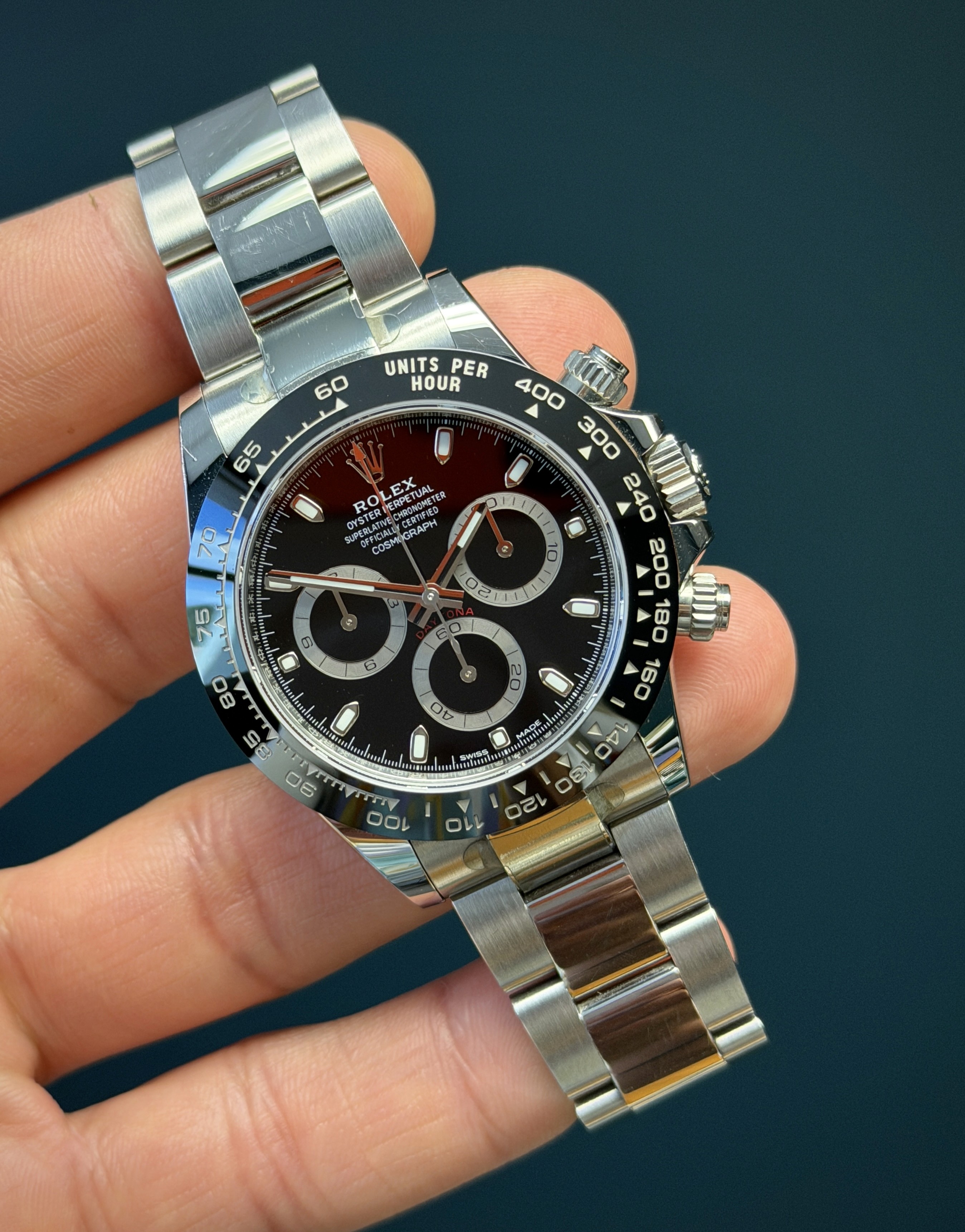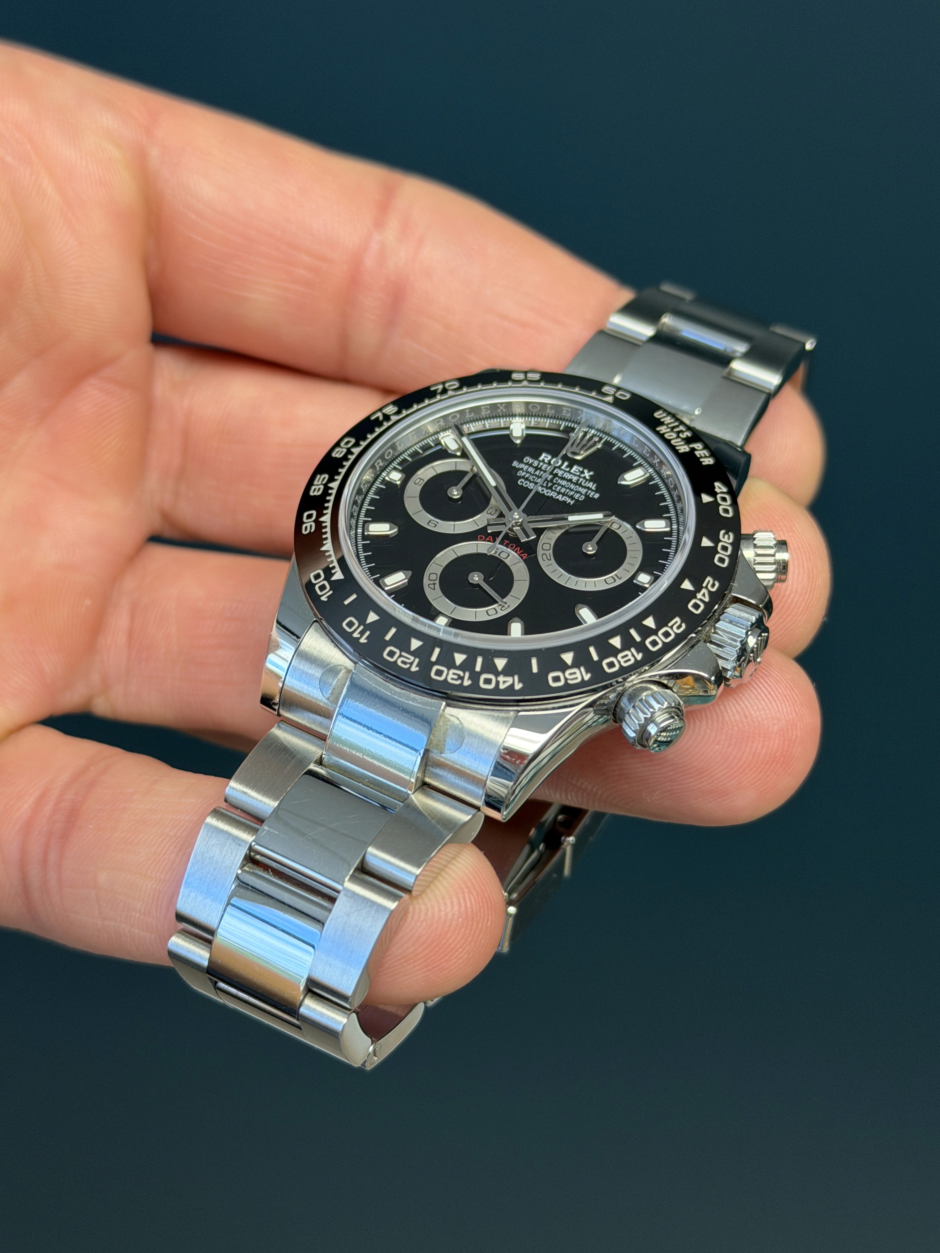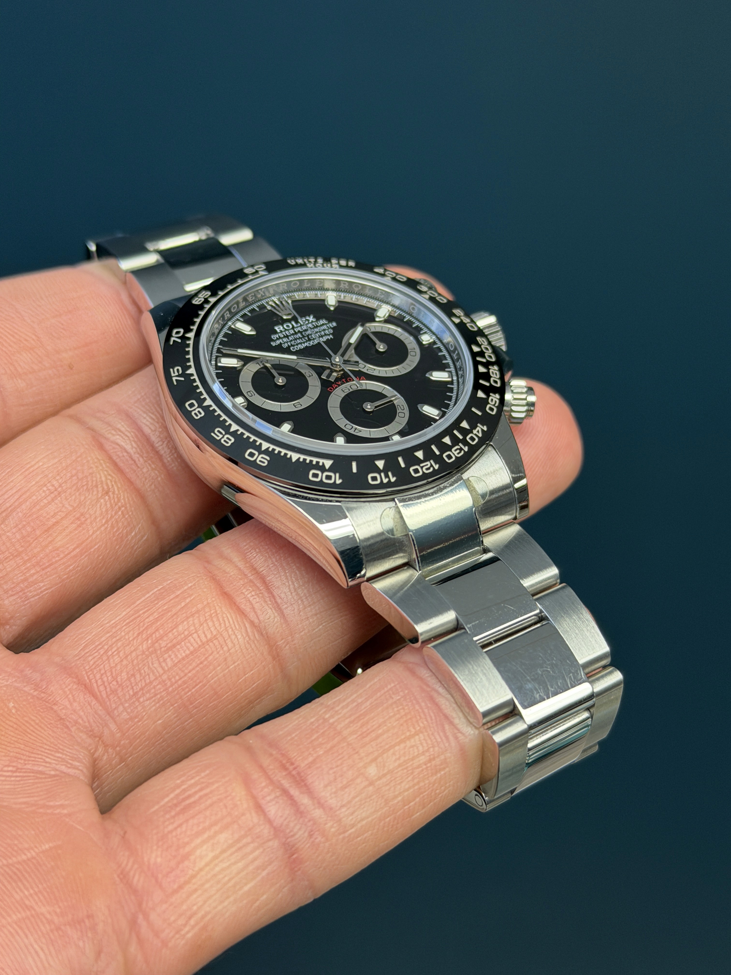 The Rolex Cosmograph Daytona Reference 116500LN is one of the most sought-after modern chronographs, celebrated for its perfect balance of performance, heritage, and contemporary design. This iconic reference features a 40mm stainless steel Oyster case paired with Rolex’s highly durable black Cerachrom bezel, giving the watch a sleek, modern profile while preserving the unmistakable Daytona identity.