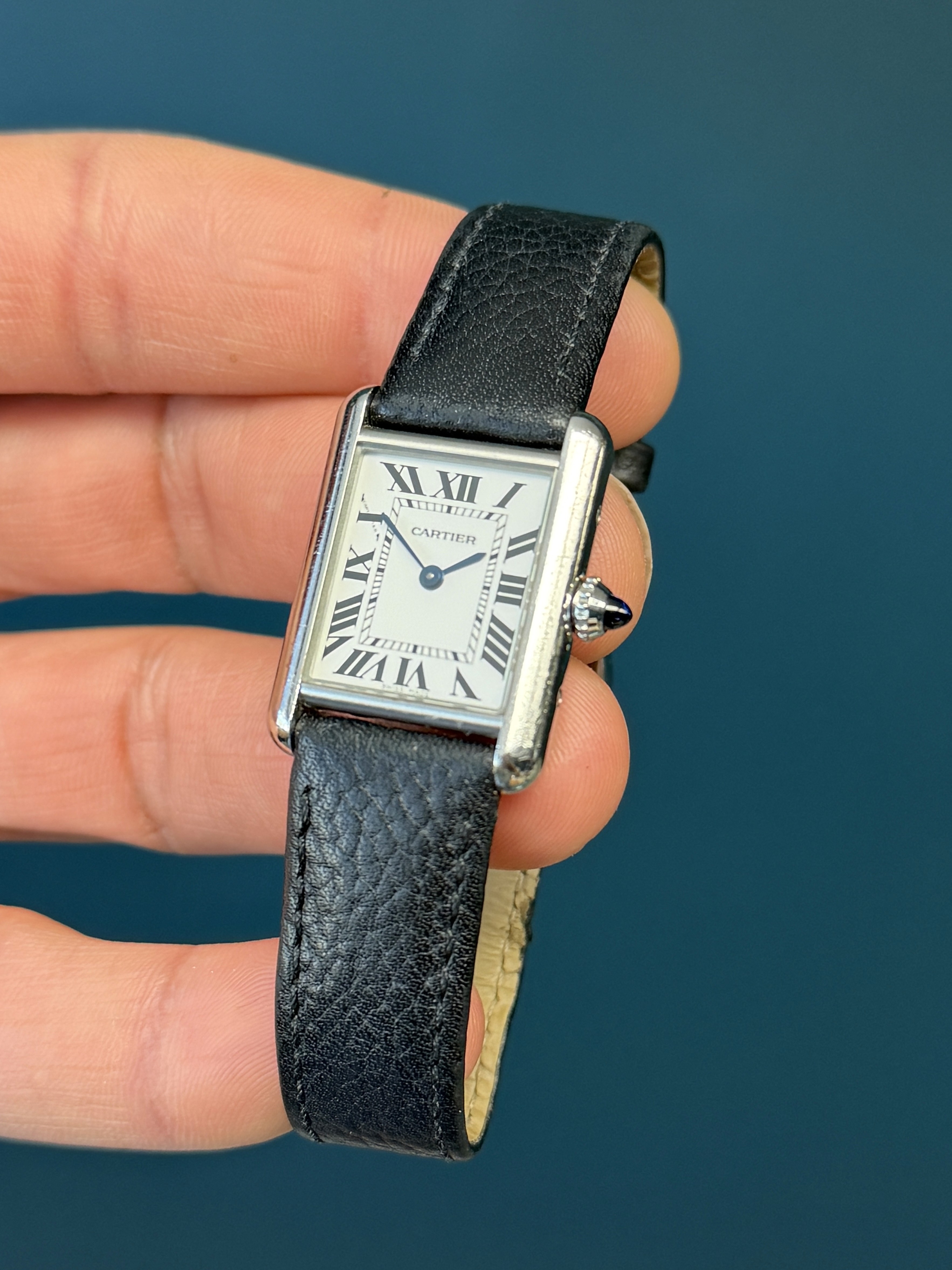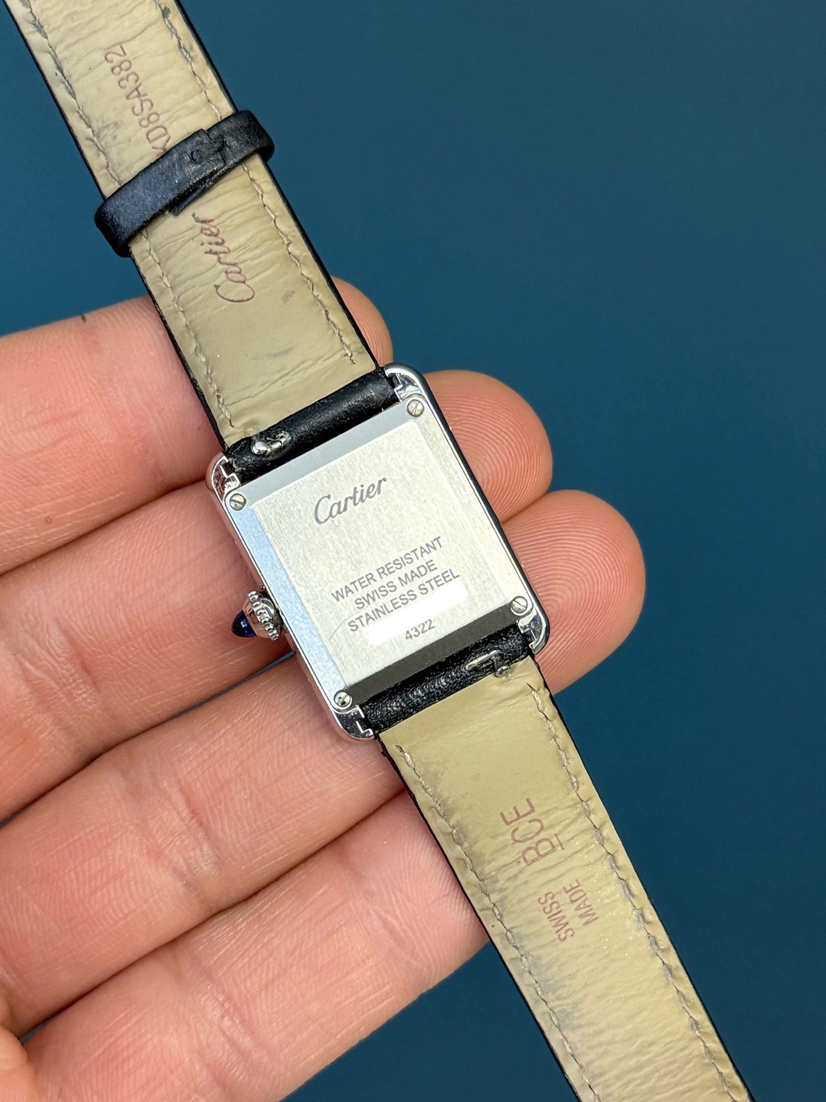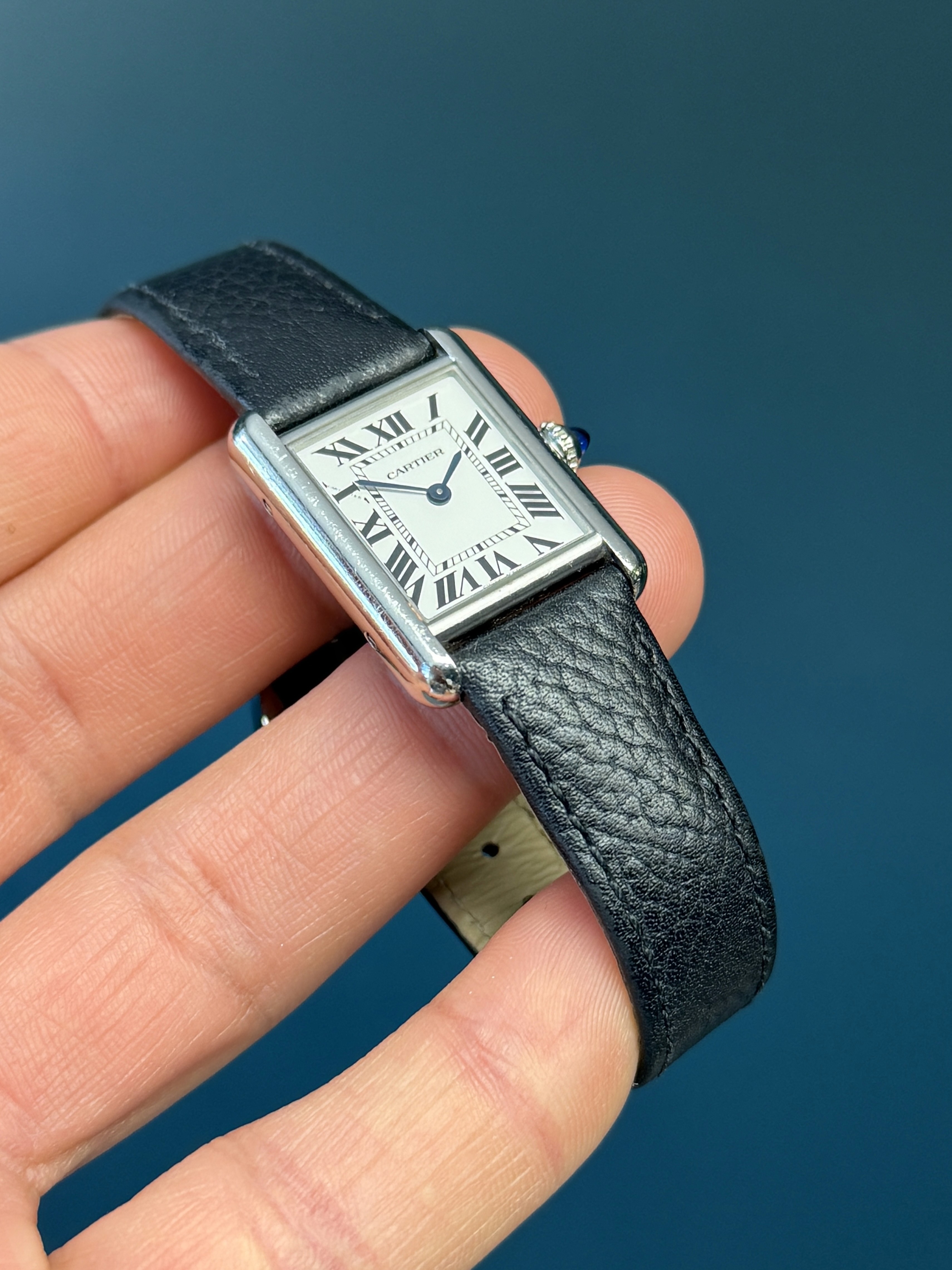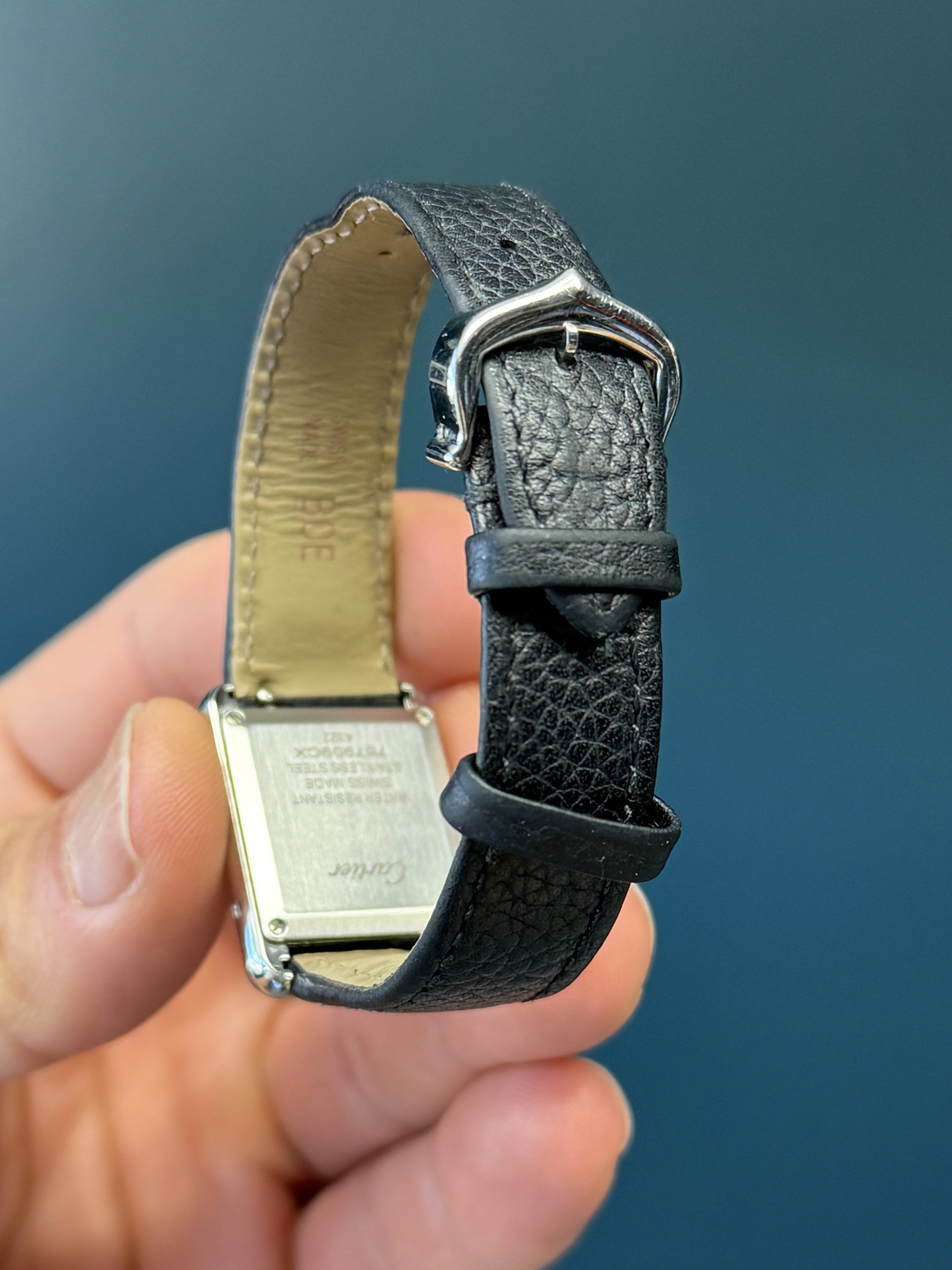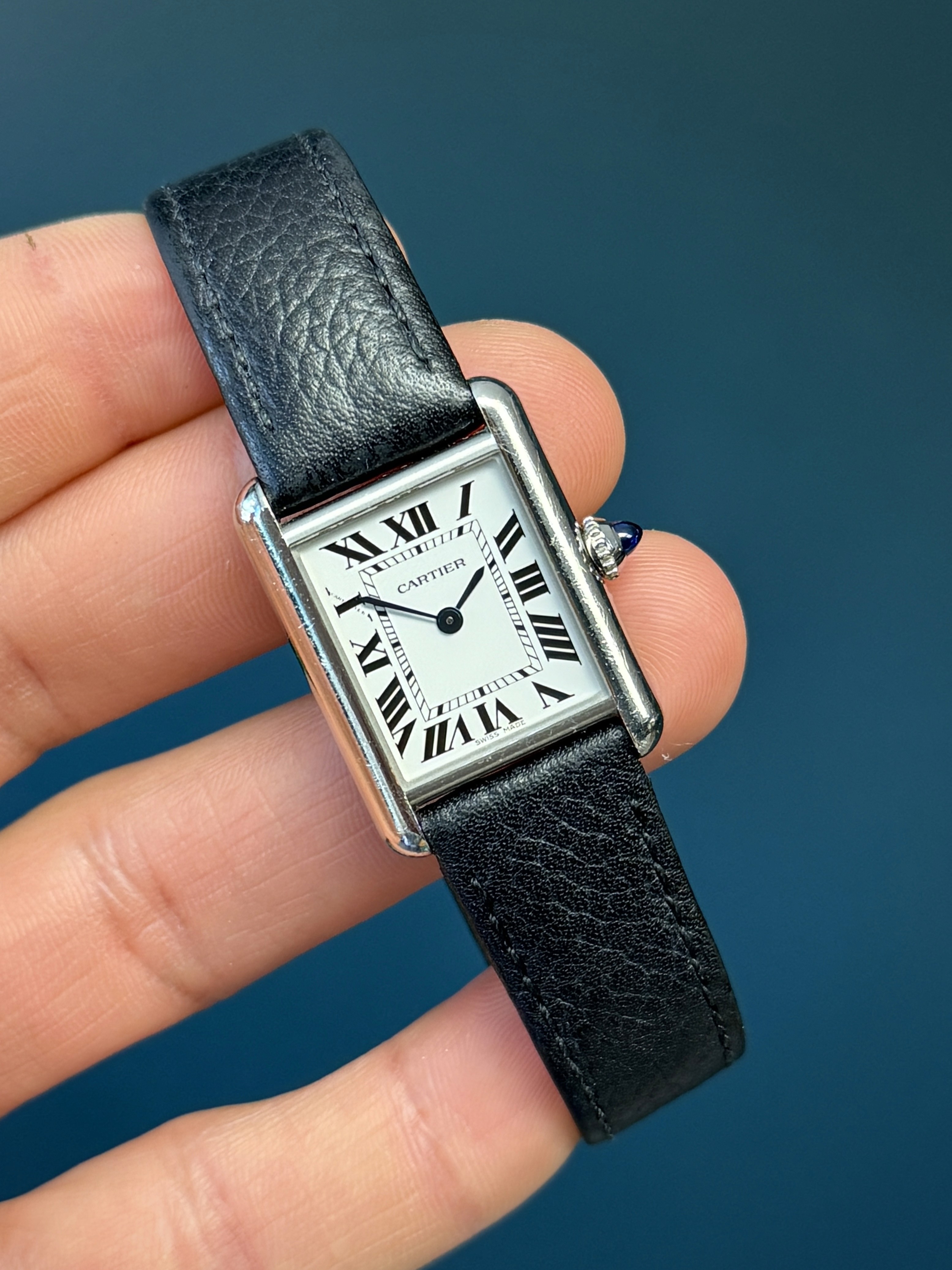 Housed in a stainless steel rectangular case, the watch features a refined silvered dial adorned with bold black Roman numerals, blued steel sword hands, and a classic chemin-de-fer minute track. The beaded crown set with a blue cabochon completes the signature Cartier look. Its slim profile ensures exceptional comfort and effortless wear, whether dressed up or down.
