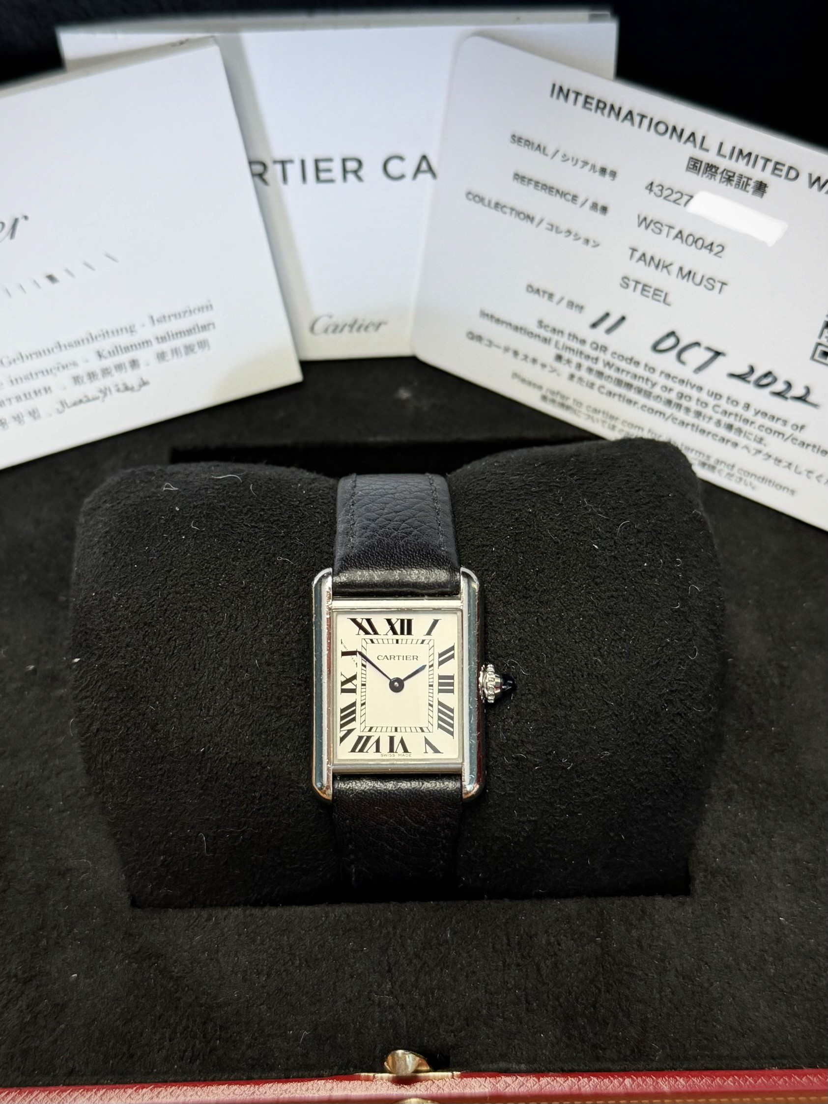 This example is offered as a full complete set from 2022, including its original inner and outer boxes, warranty card, and accompanying documentation—making it especially appealing to collectors and first-time Cartier owners alike. Fitted on its original Cartier strap, the watch maintains its factory-correct presentation.