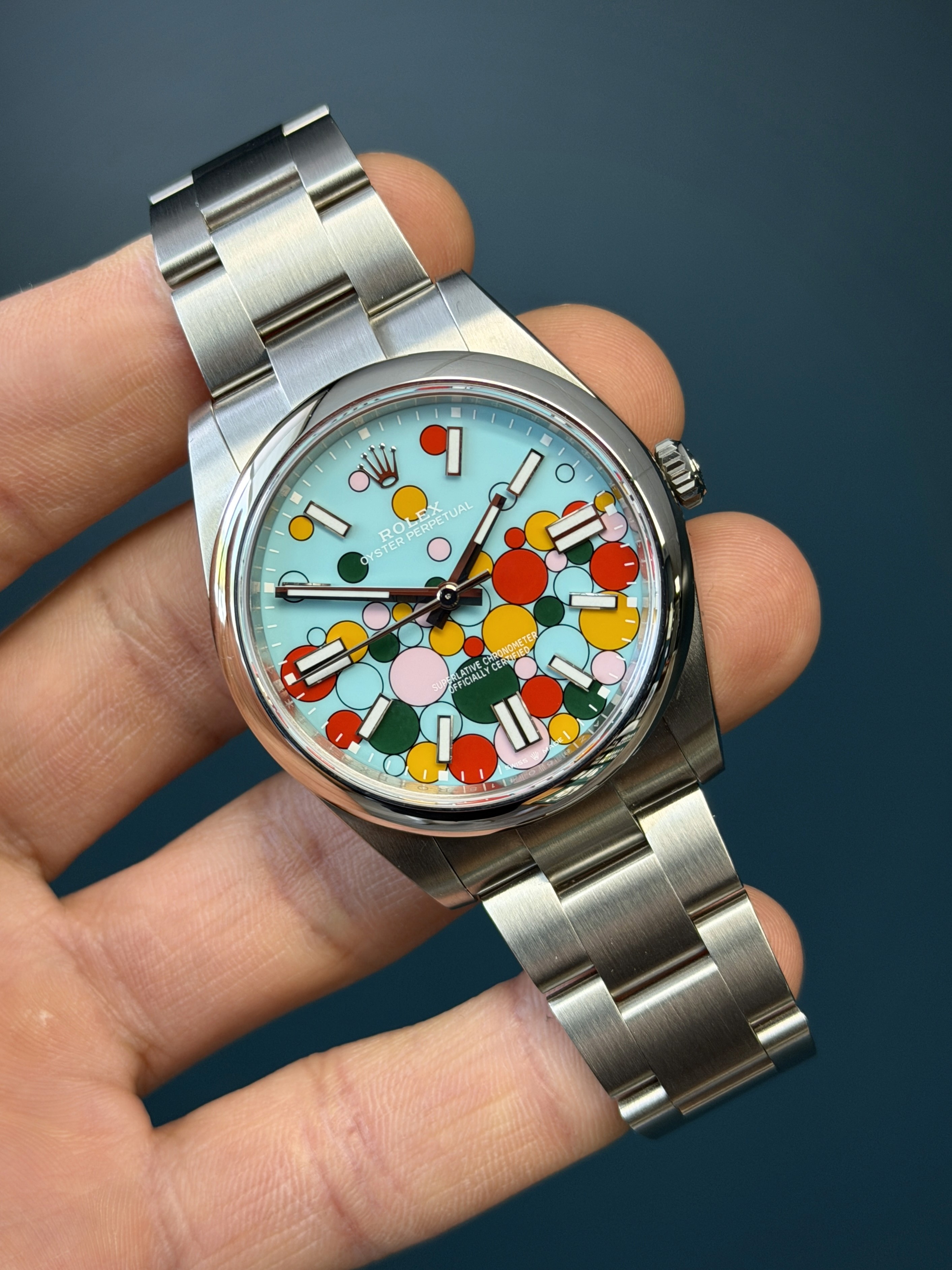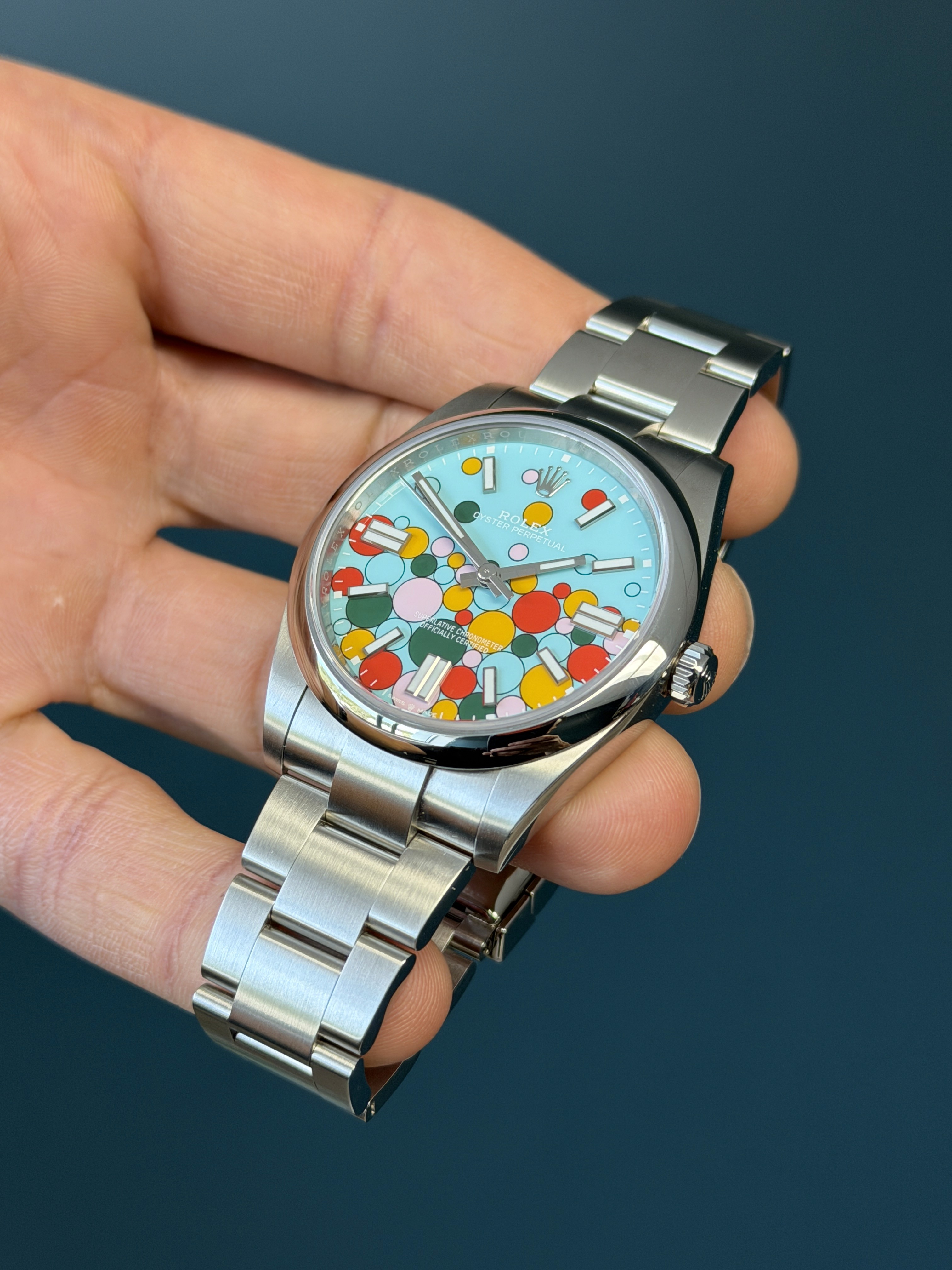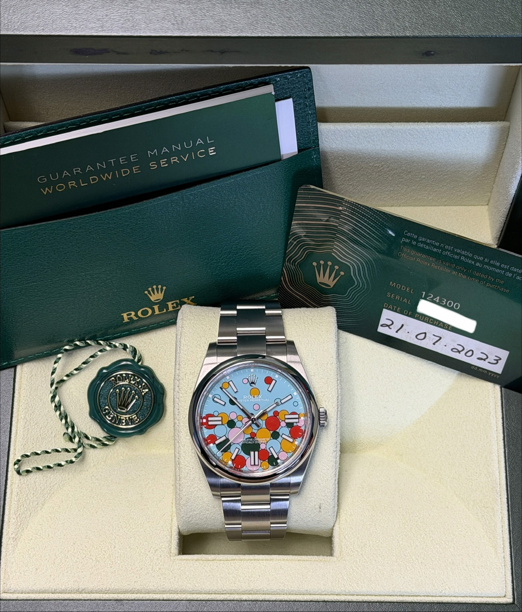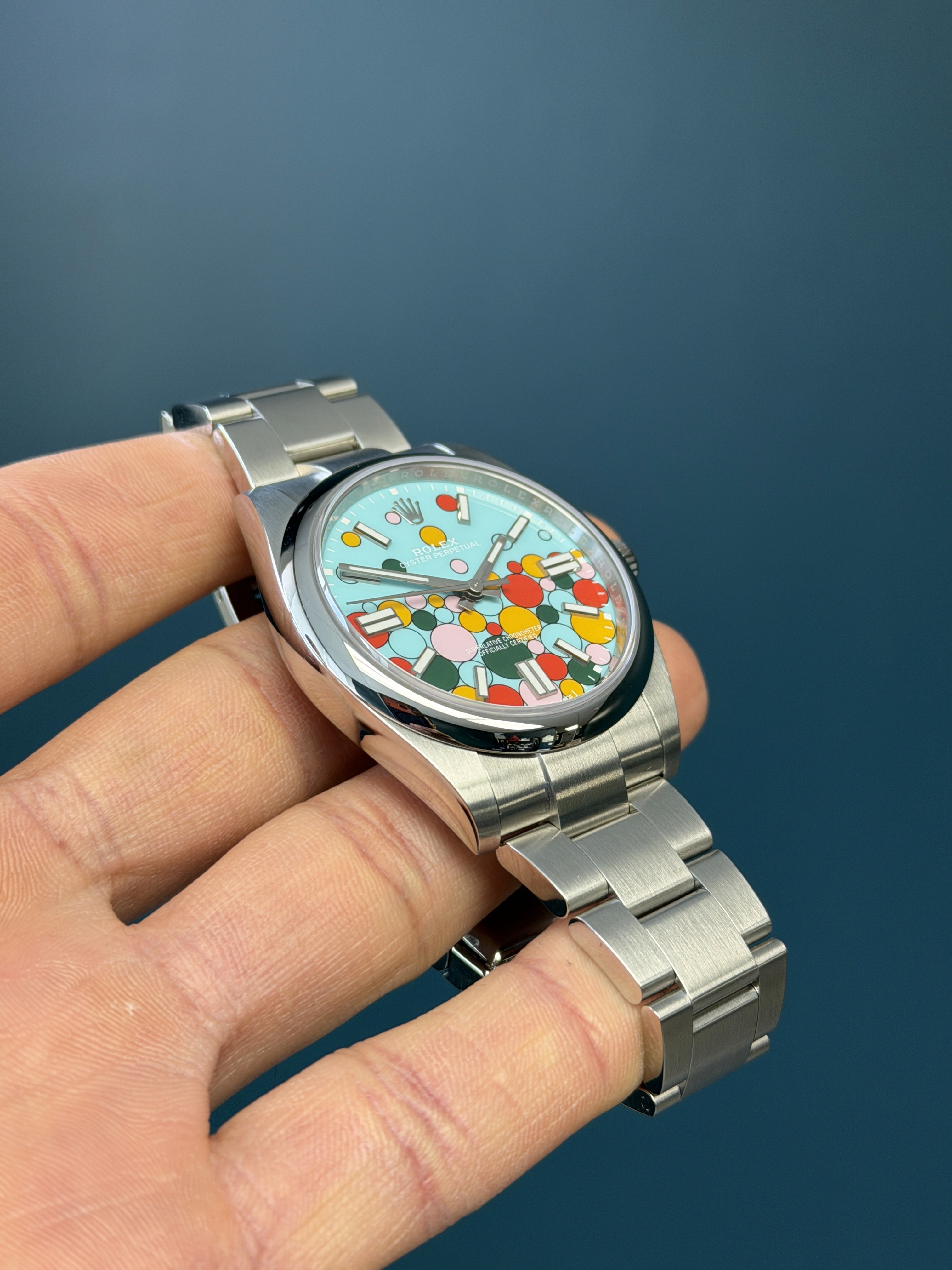 The Rolex Oyster Perpetual 41 ref. 124300 Celebration Dial is one of Rolex’s most distinctive modern designs, introduced in 2023 as a bold evolution of the colorful Oyster Perpetual lineup. Crafted in stainless steel with a 41mm case, it features the instantly recognizable turquoise “Celebration” dial, accented by playful multicolored bubble motifs inspired by the brand’s lacquer dial collection.