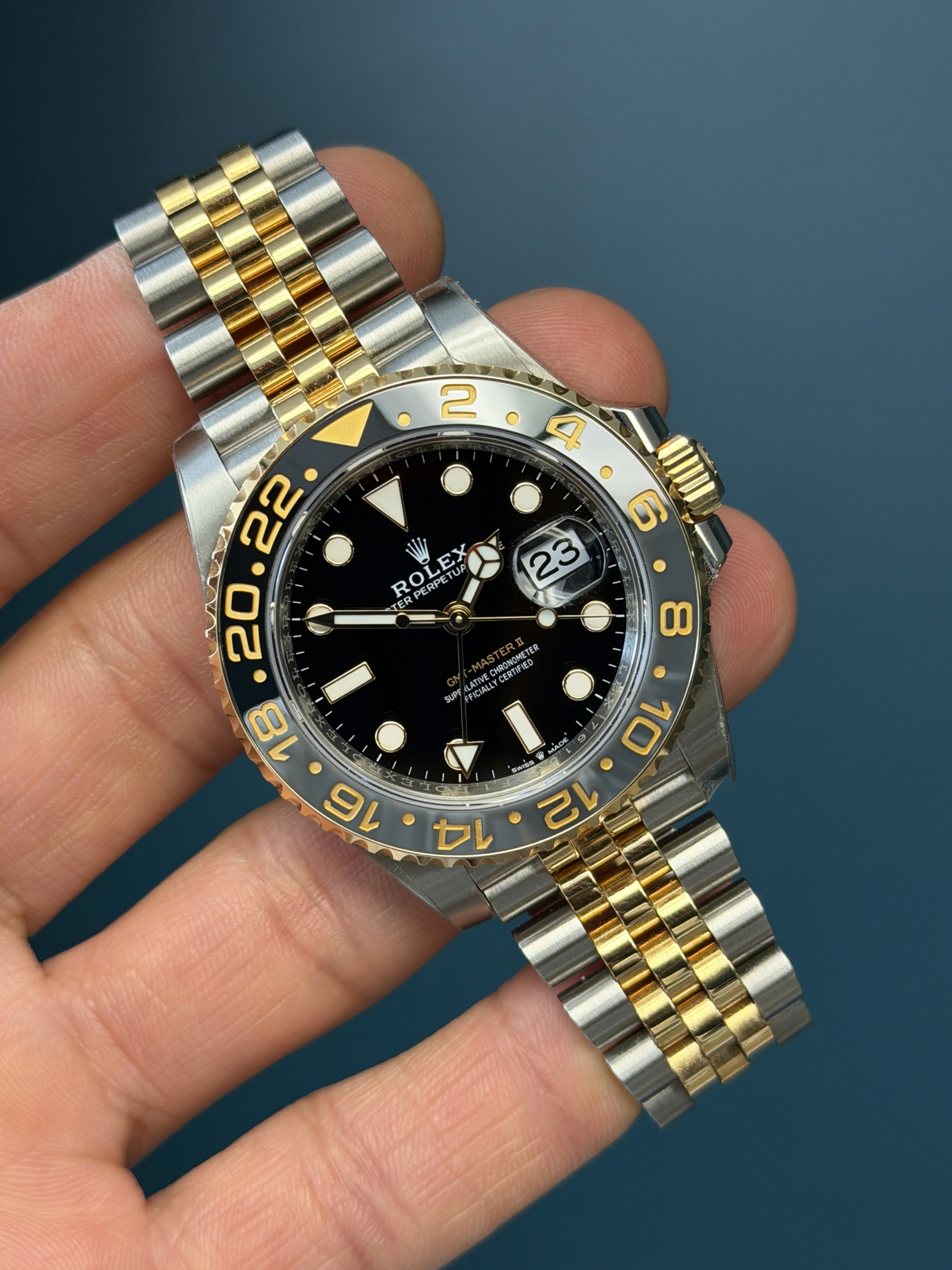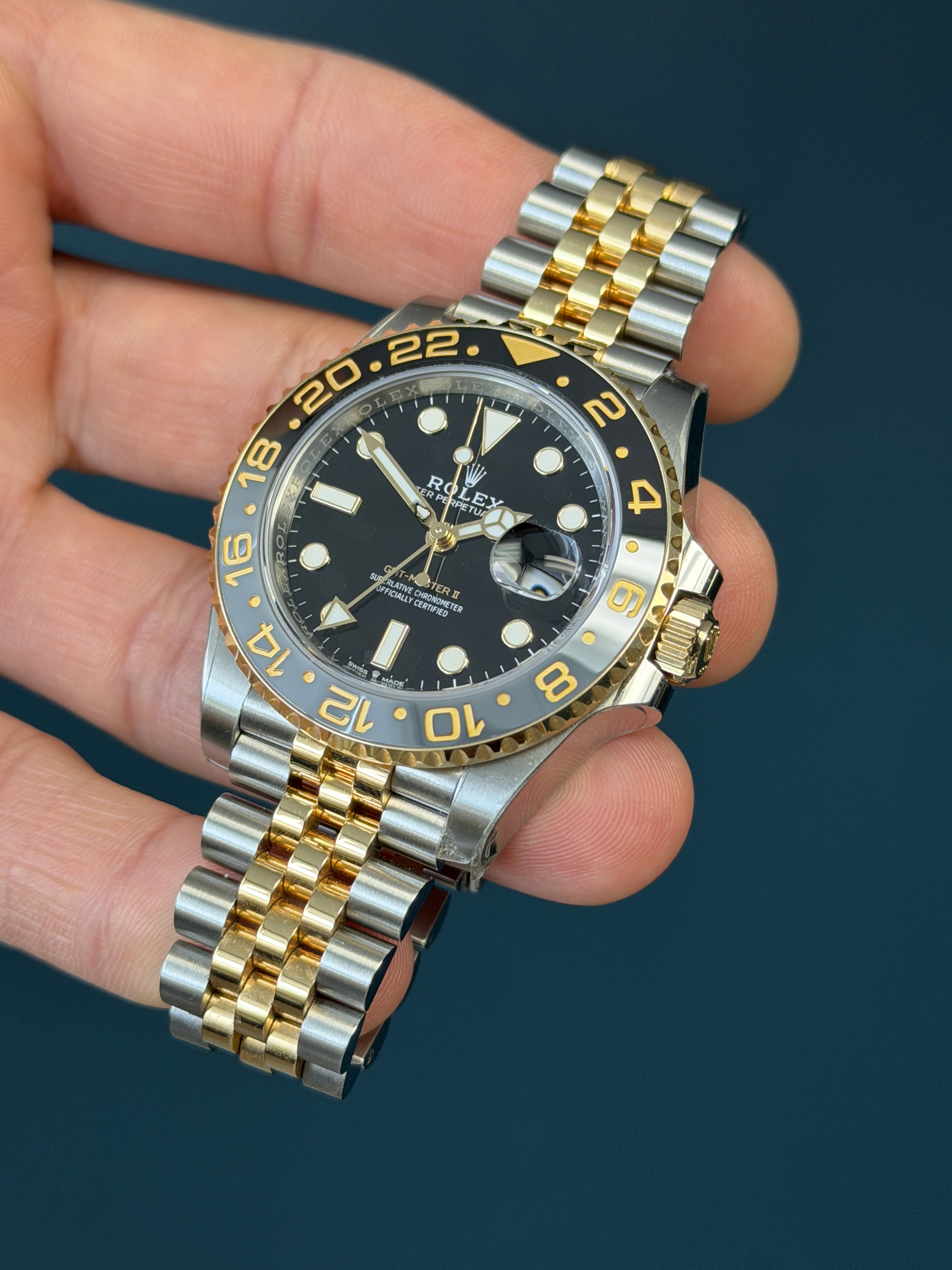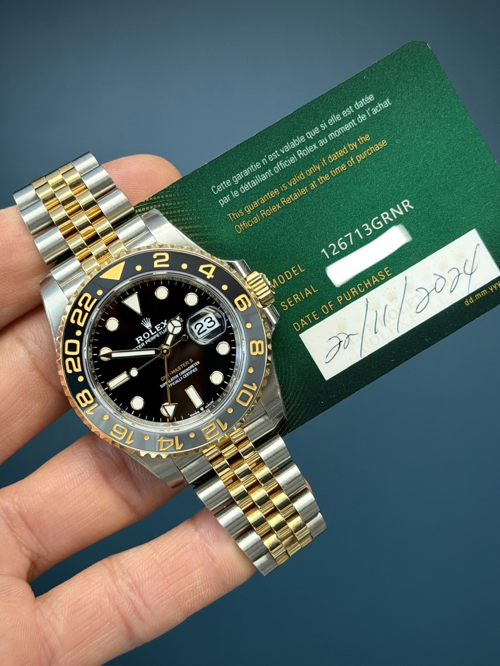 The Rolex GMT-Master II reference 126713GRNR is a refined two-tone travel watch combining stainless steel and 18k yellow gold in a modern, versatile design. Presented in excellent condition and complete with its original card, it offers strong collector appeal and everyday wearability.