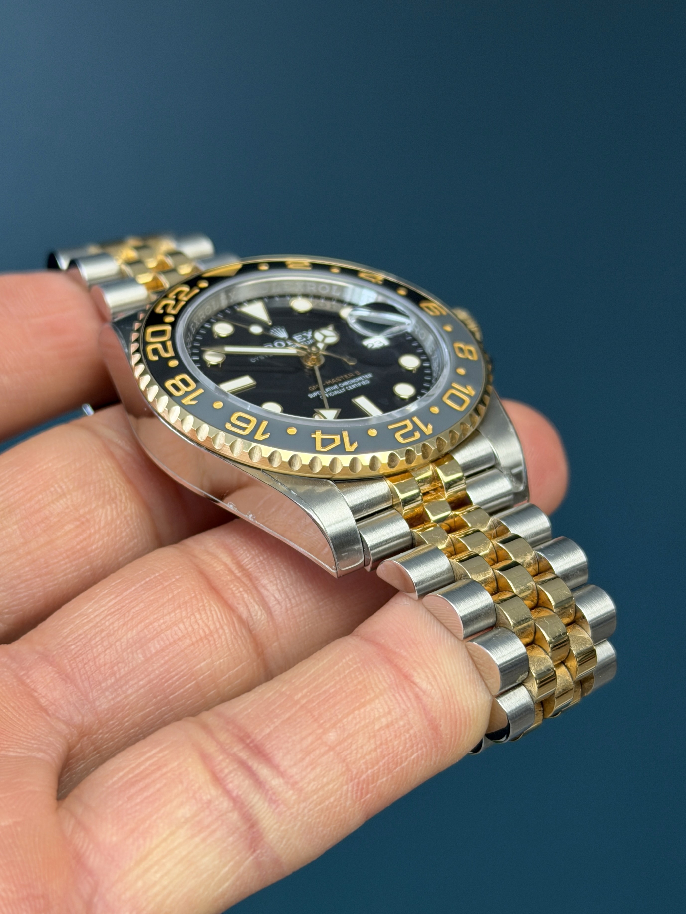 The 40mm Oyster case is paired with a distinctive grey and black Cerachrom bezel, allowing easy tracking of a second time zone via the iconic GMT function. The black dial features gold-accented hands and markers filled with Chromalight for excellent low-light visibility.