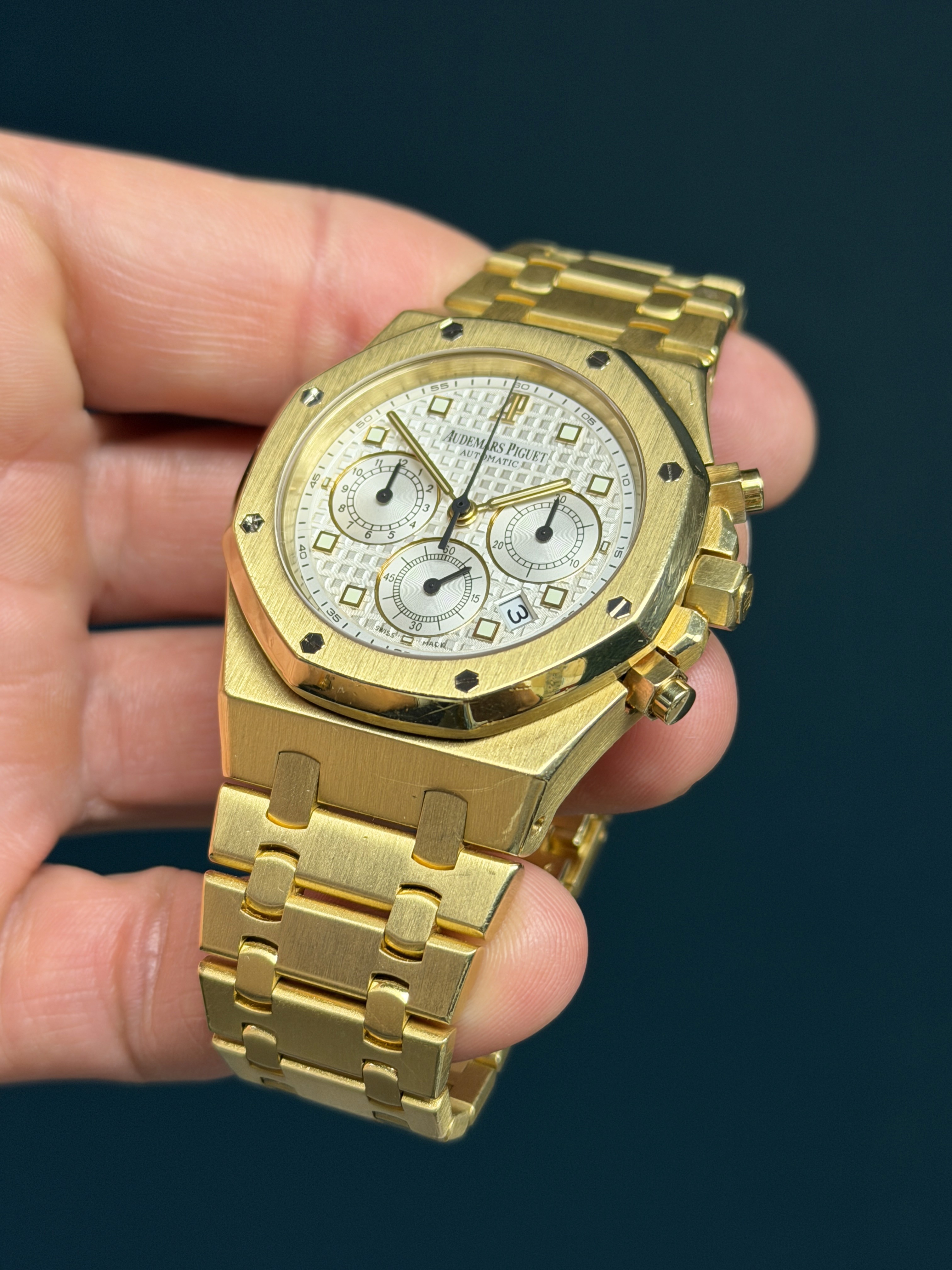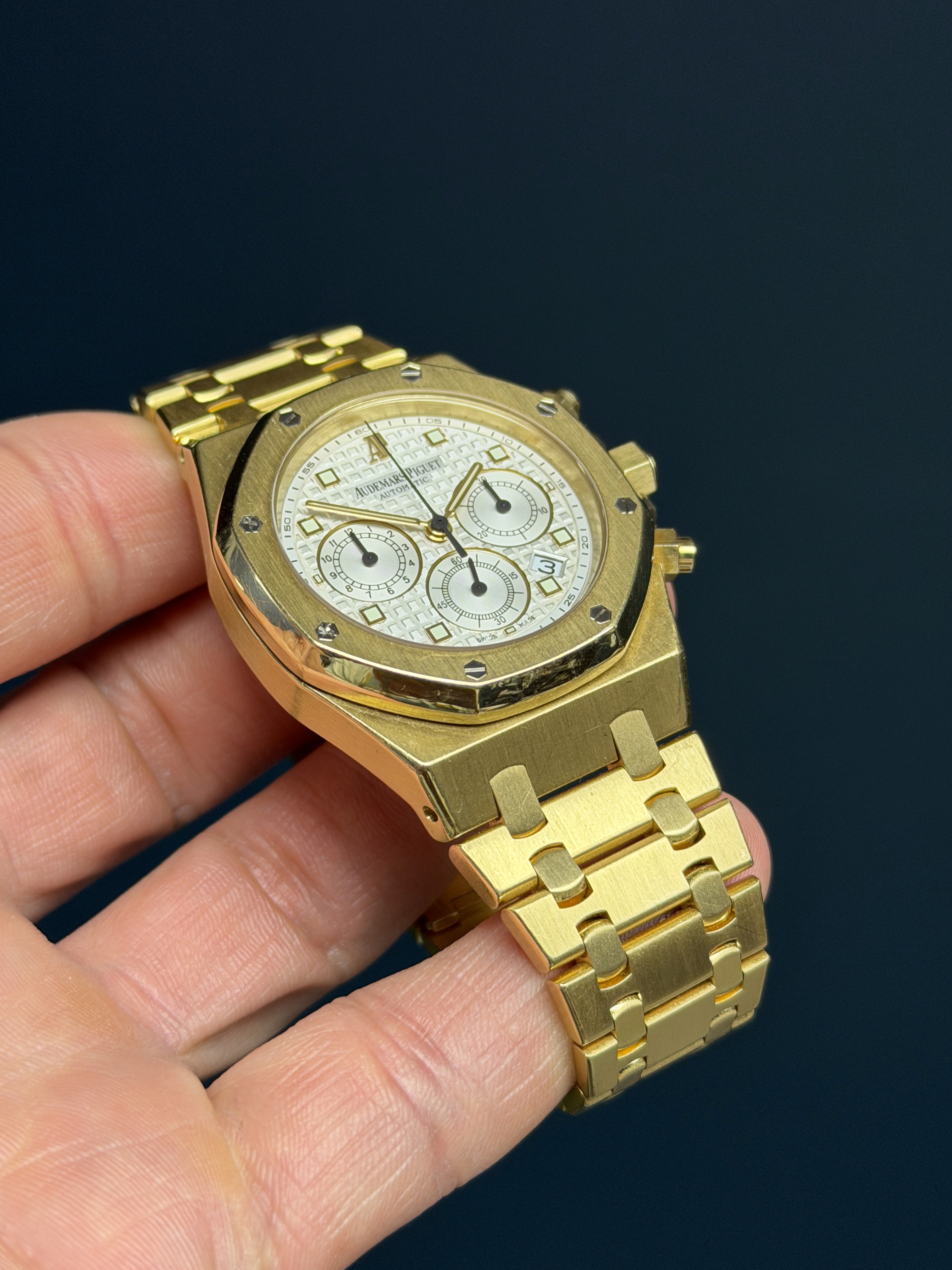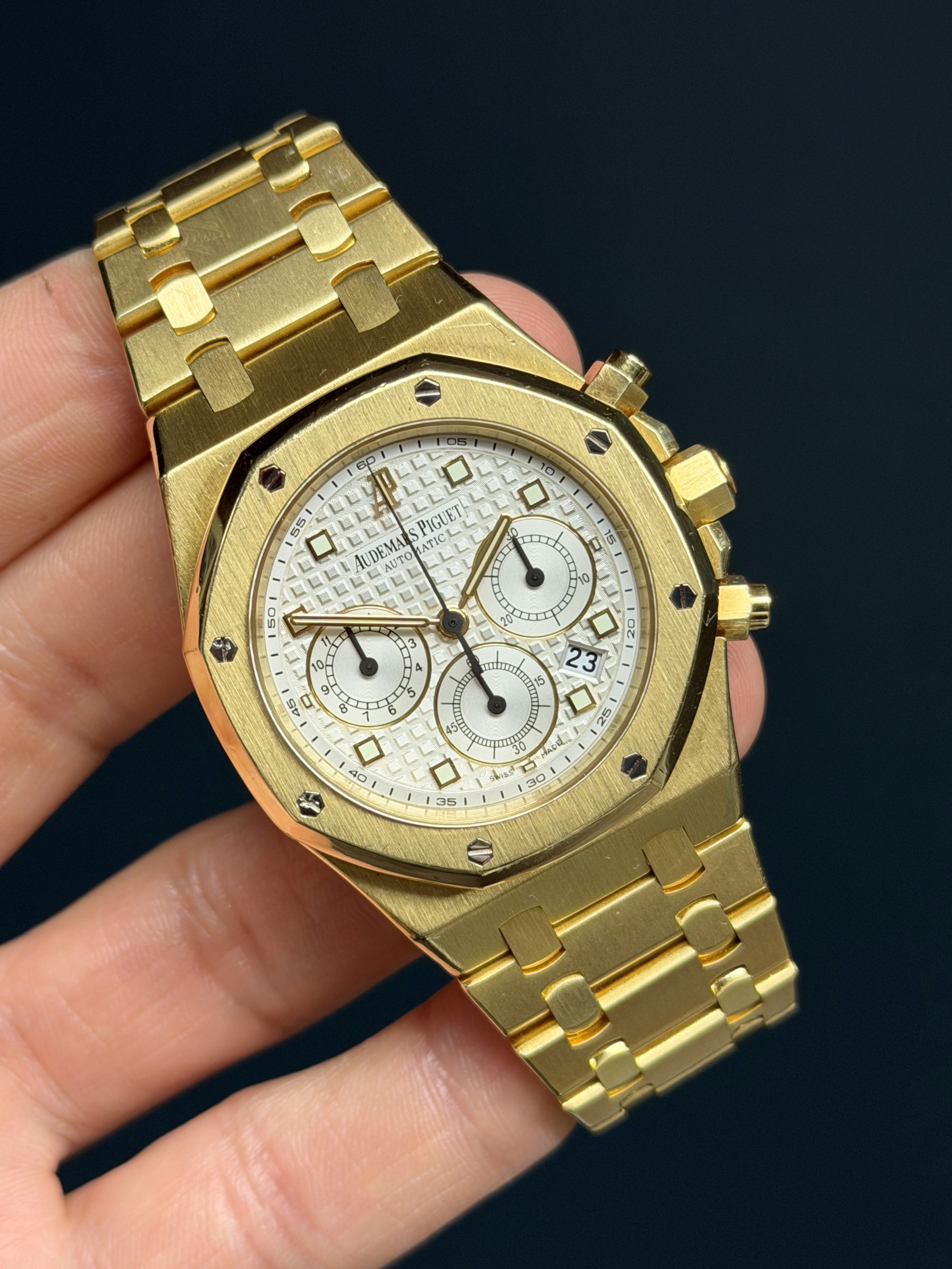 The Audemars Piguet Royal Oak Chronograph Reference 25960BA, affectionately known as the “Kasparov,” is a standout within the Royal Oak lineage. Crafted entirely in 18k yellow gold, this bold 39mm chronograph embodies the perfect fusion of sporty functionality and refined luxury. Nicknamed after chess grandmaster Garry Kasparov—who famously wore this model—the watch features the iconic "Grande Tapisserie" dial in white, with three gold-rimmed sub-dials, applied gold hour markers, and lumed hands for superb legibility. Its integrated bracelet, also in yellow gold, gives it that unmistakable Royal Oak silhouette, while the screw-down crown and pushers maintain its robust feel. Powered by the automatic caliber 2385, this watch delivers reliable chronograph performance with an elegant, timeless aesthetic. Revered by collectors, the 25960BA “Kasparov” is a rare and important reference that blends AP’s pioneering design language with enduring sophistication.