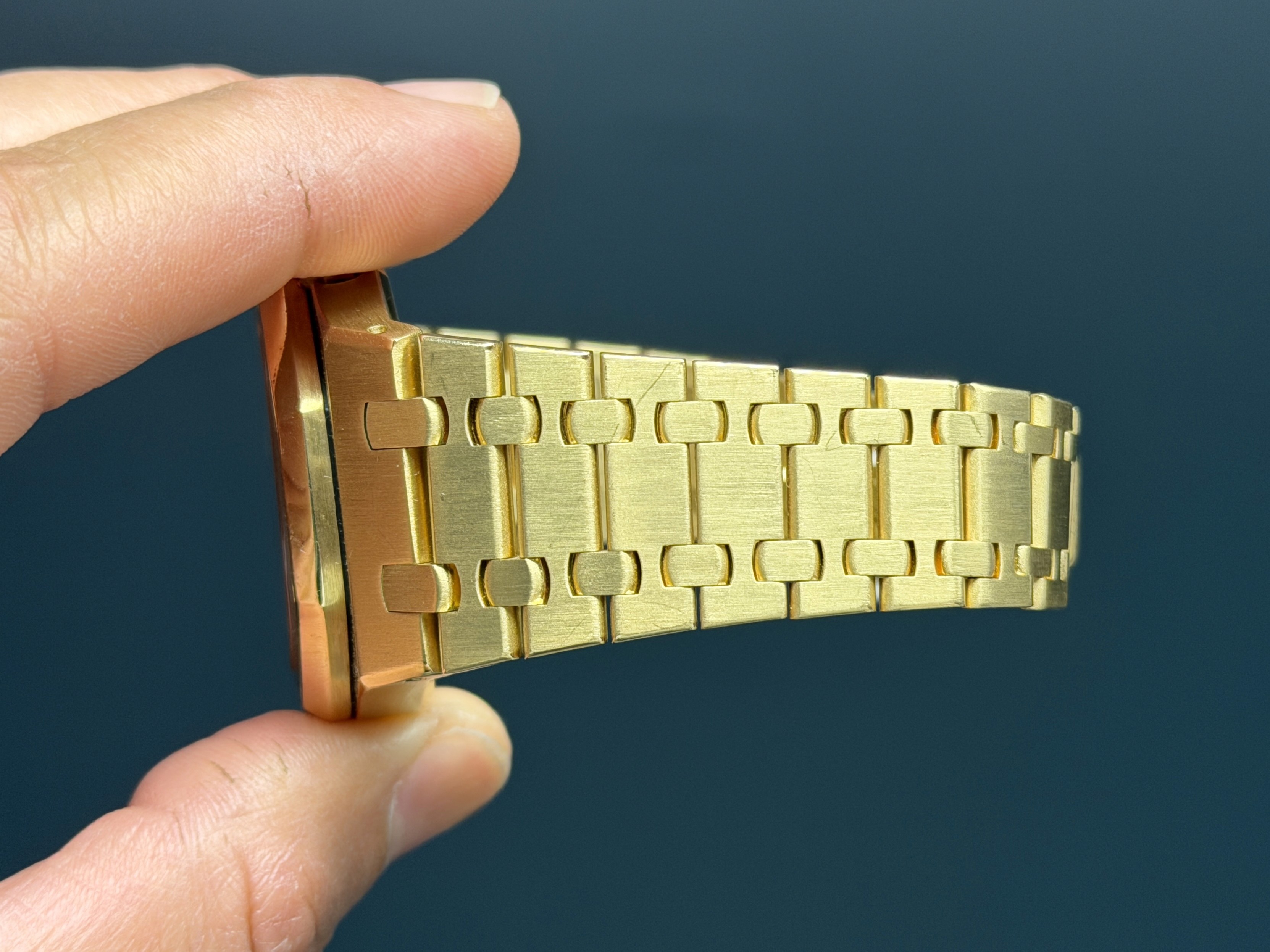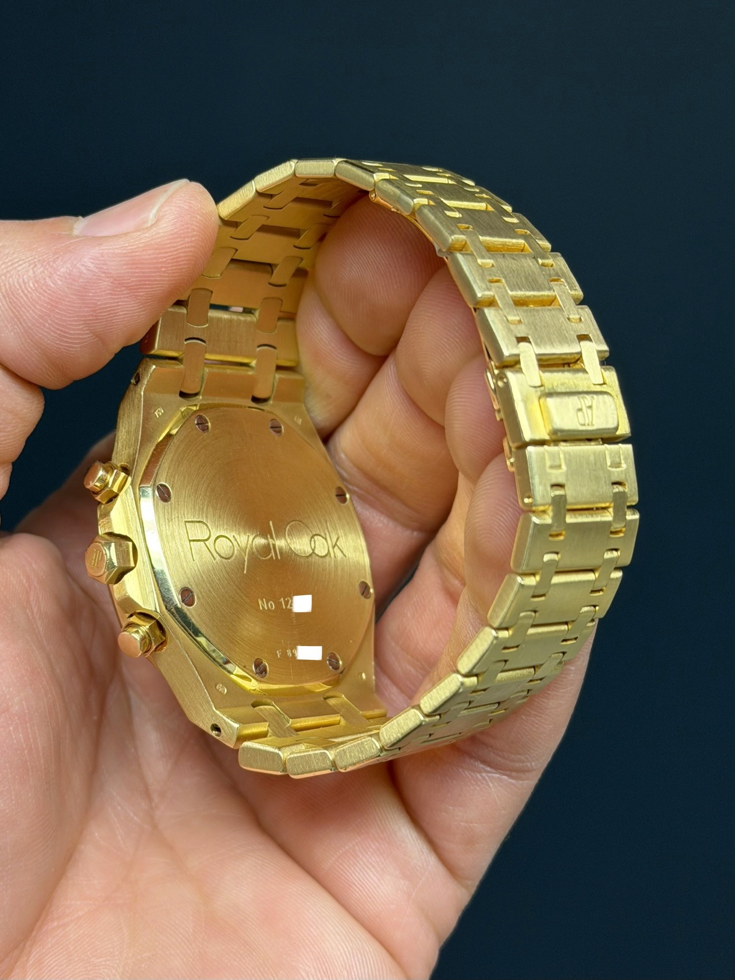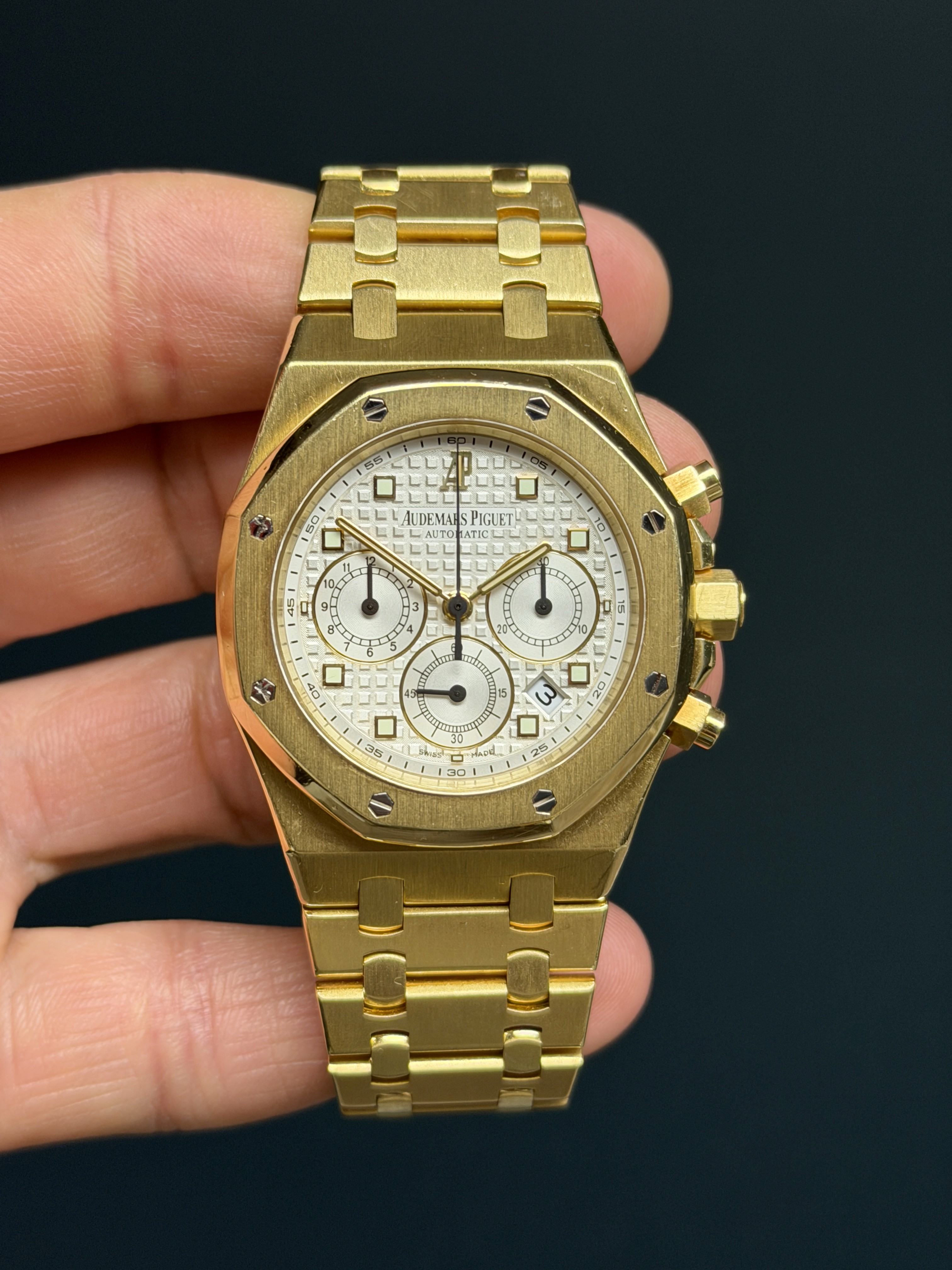 The Audemars Piguet Royal Oak Chronograph Reference 25960BA, affectionately known as the “Kasparov,” is a standout within the Royal Oak lineage. Crafted entirely in 18k yellow gold, this bold 39mm chronograph embodies the perfect fusion of sporty functionality and refined luxury. Nicknamed after chess grandmaster Garry Kasparov—who famously wore this model—the watch features the iconic "Grande Tapisserie" dial in white, with three gold-rimmed sub-dials, applied gold hour markers, and lumed hands for superb legibility. Its integrated bracelet, also in yellow gold, gives it that unmistakable Royal Oak silhouette, while the screw-down crown and pushers maintain its robust feel. Powered by the automatic caliber 2385, this watch delivers reliable chronograph performance with an elegant, timeless aesthetic. Revered by collectors, the 25960BA “Kasparov” is a rare and important reference that blends AP’s pioneering design language with enduring sophistication.