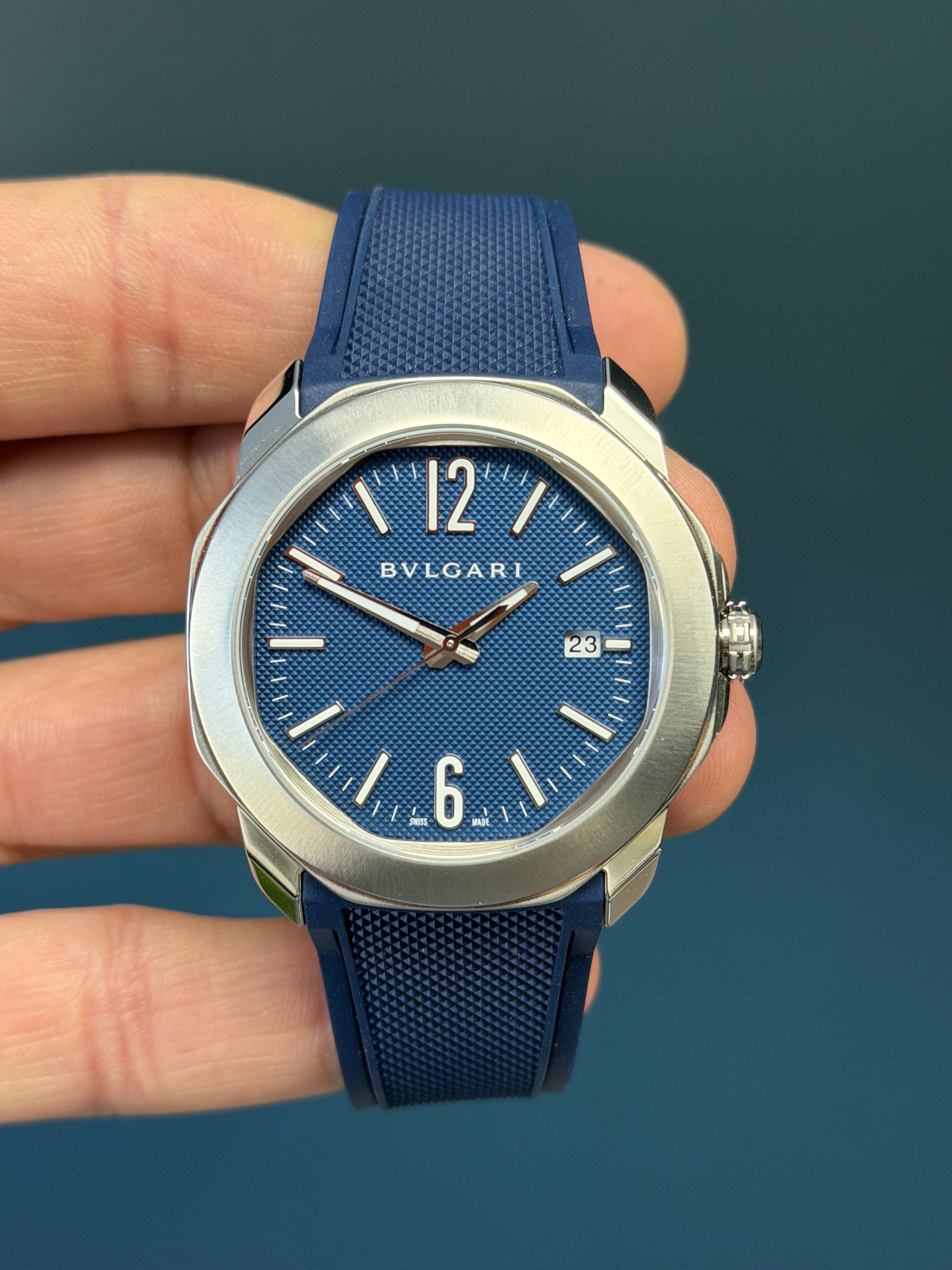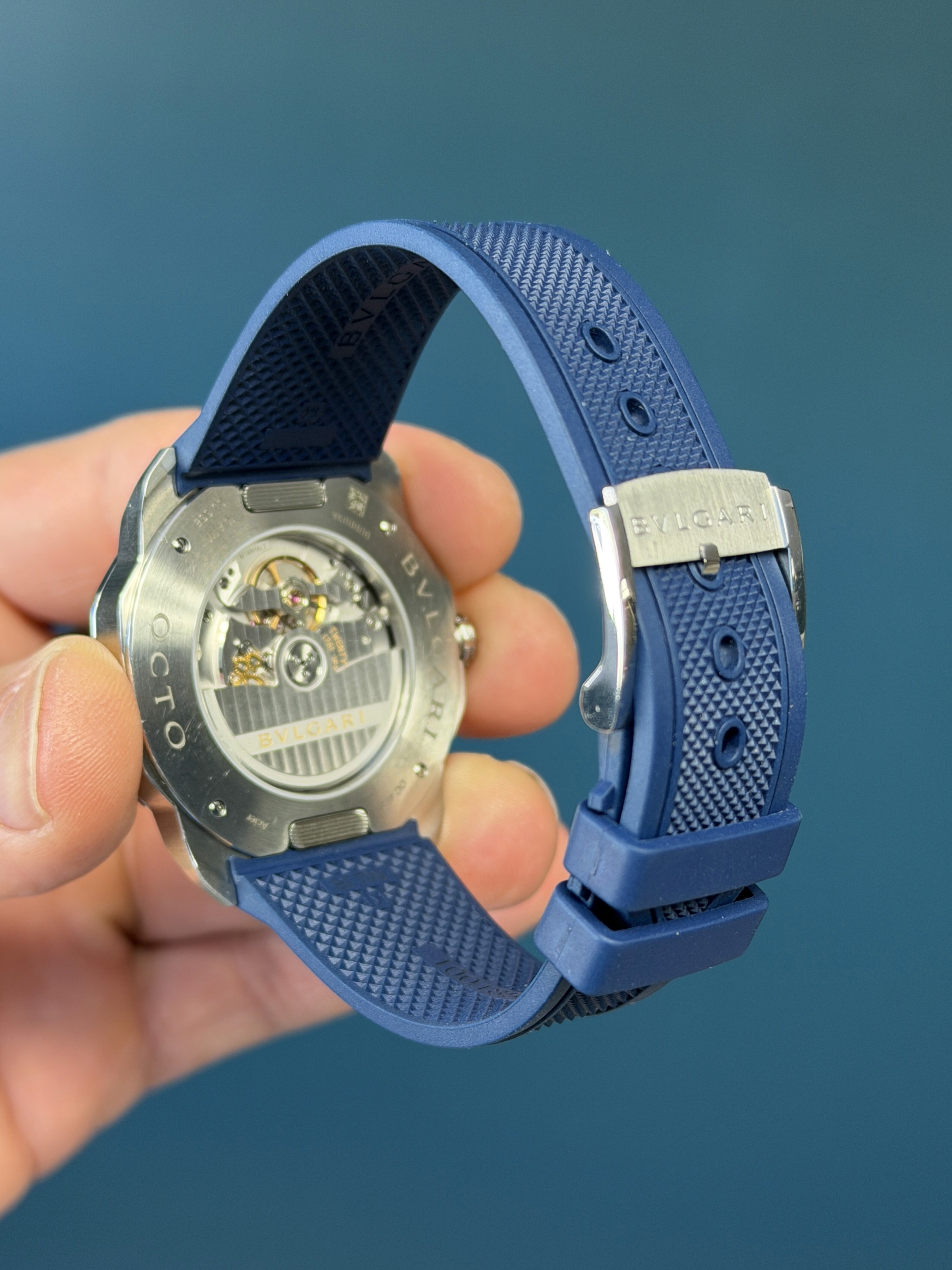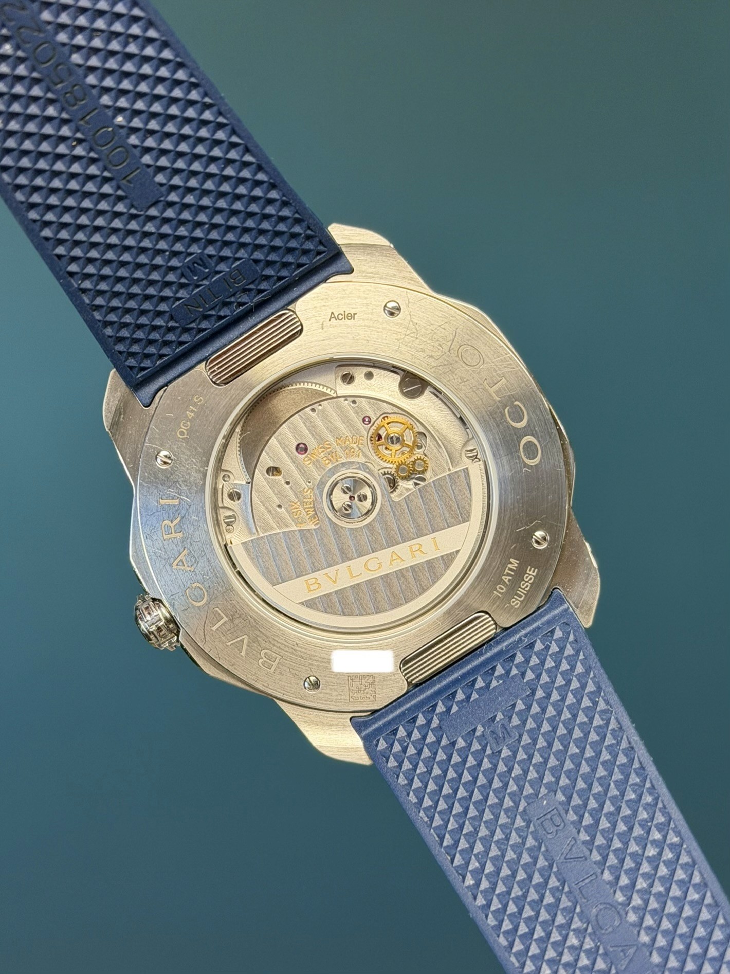 Powering the watch is a reliable automatic Swiss movement, delivering smooth operation and dependable performance. Paired with Bvlgari’s distinctive blue rubber strap, the OC 41 S offers both comfort and a sporty, modern edge, making it equally at home in casual or active settings.