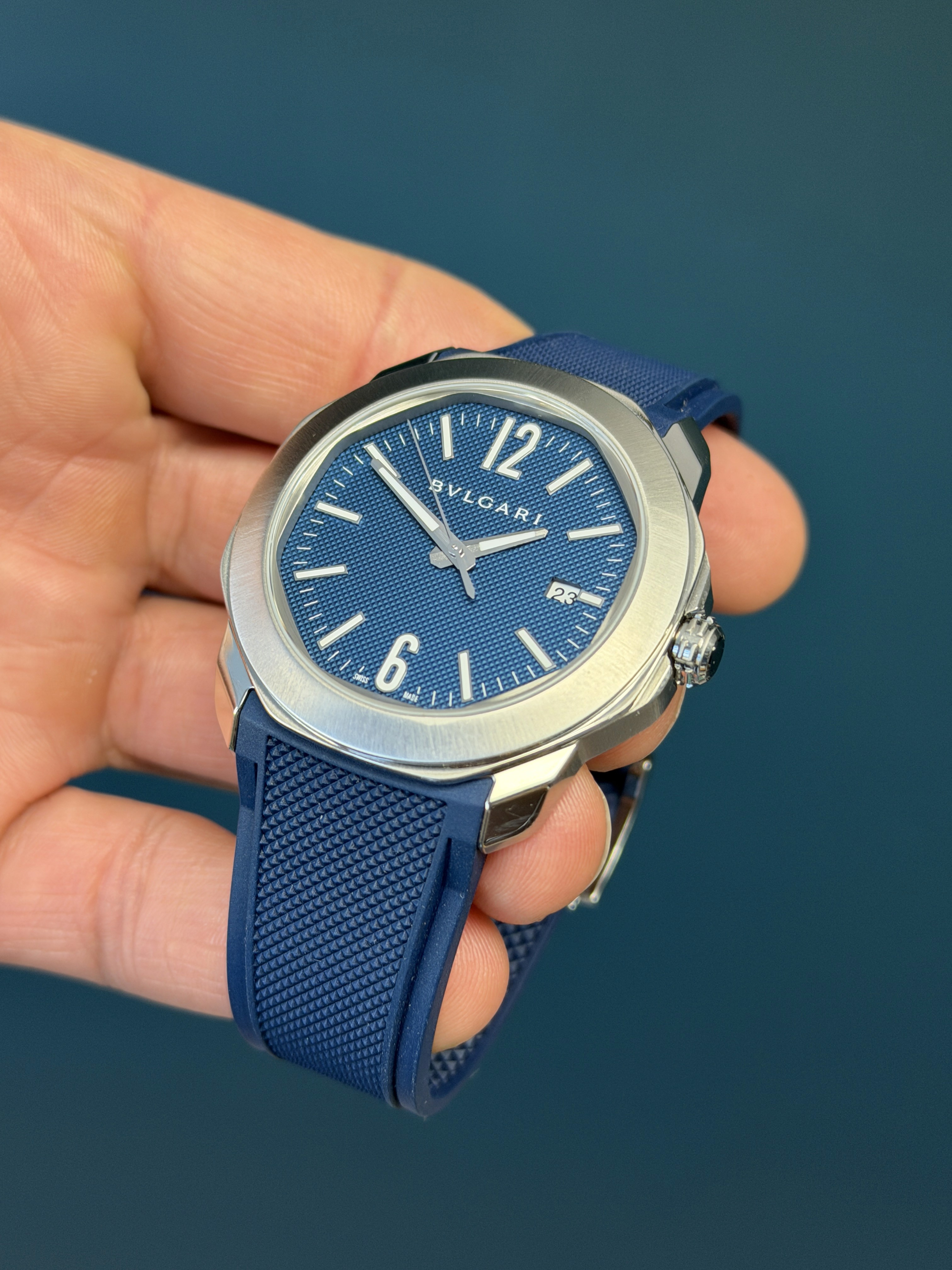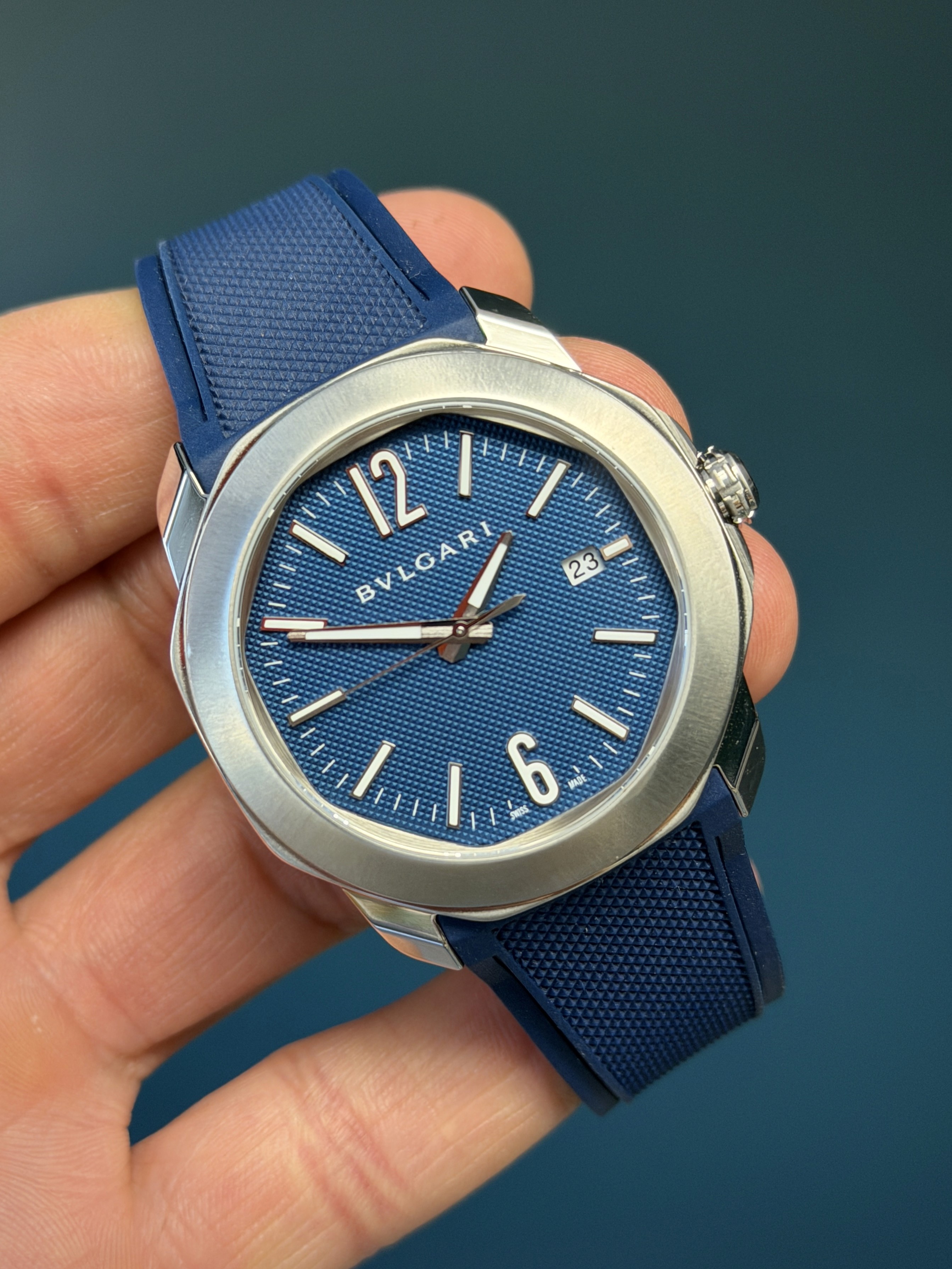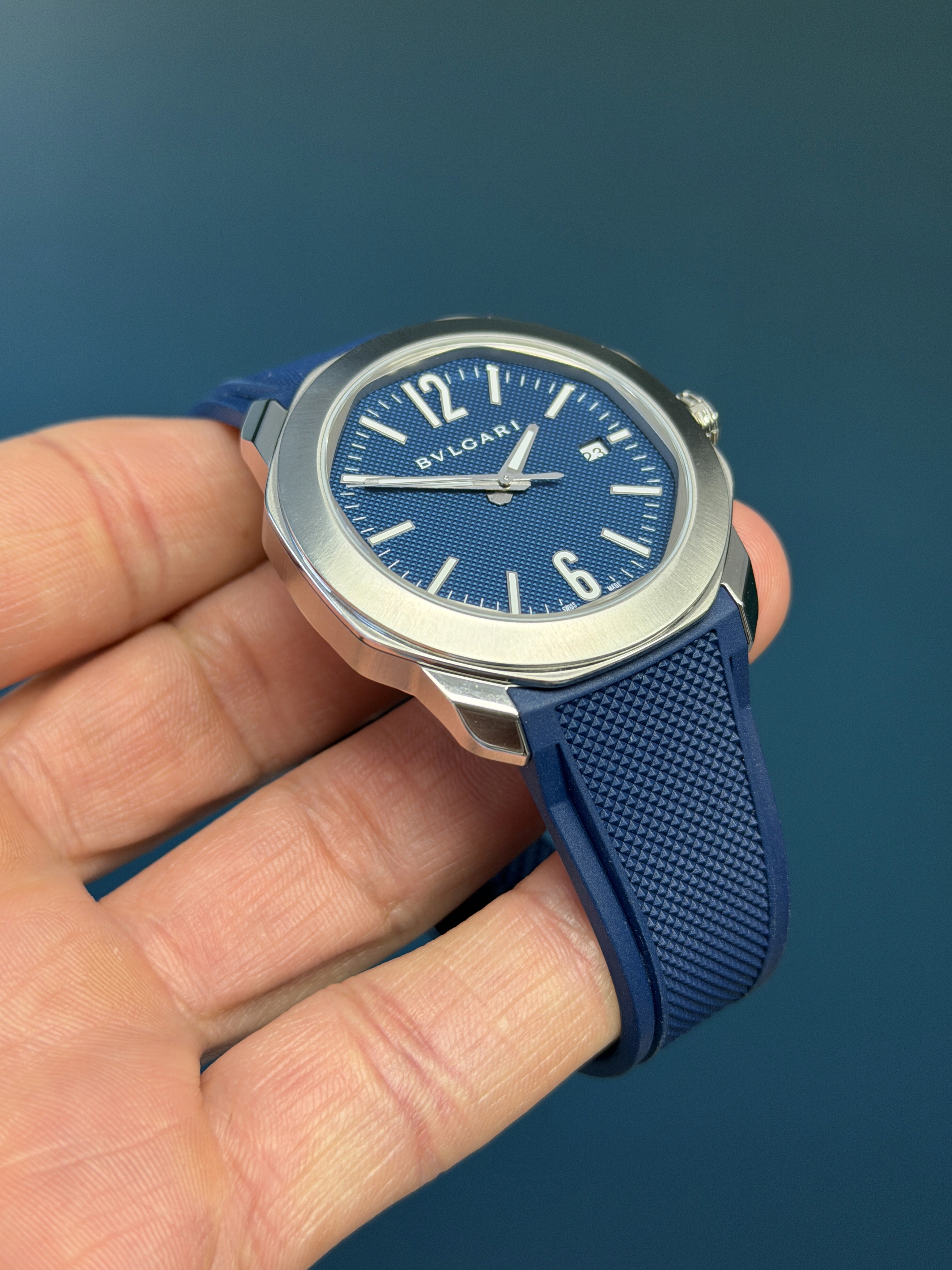 Powering the watch is a reliable automatic Swiss movement, delivering smooth operation and dependable performance. Paired with Bvlgari’s distinctive blue rubber strap, the OC 41 S offers both comfort and a sporty, modern edge, making it equally at home in casual or active settings.
