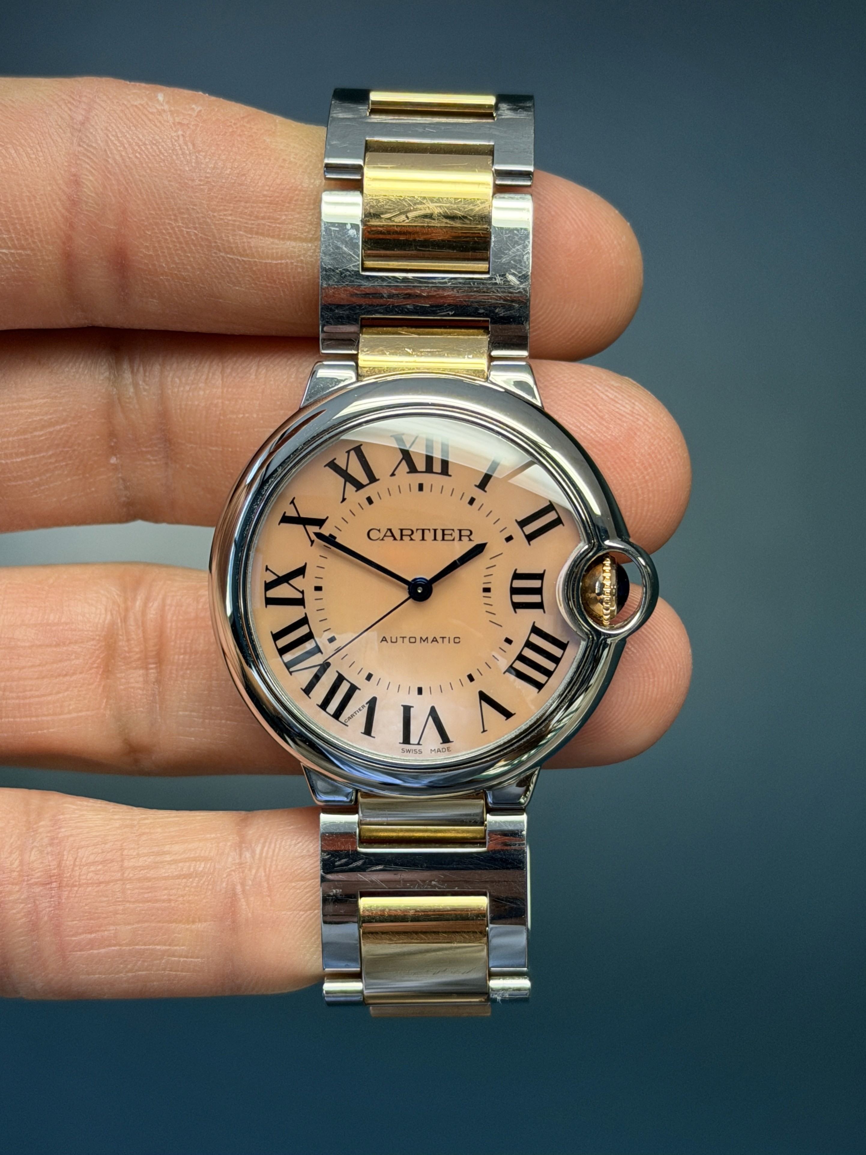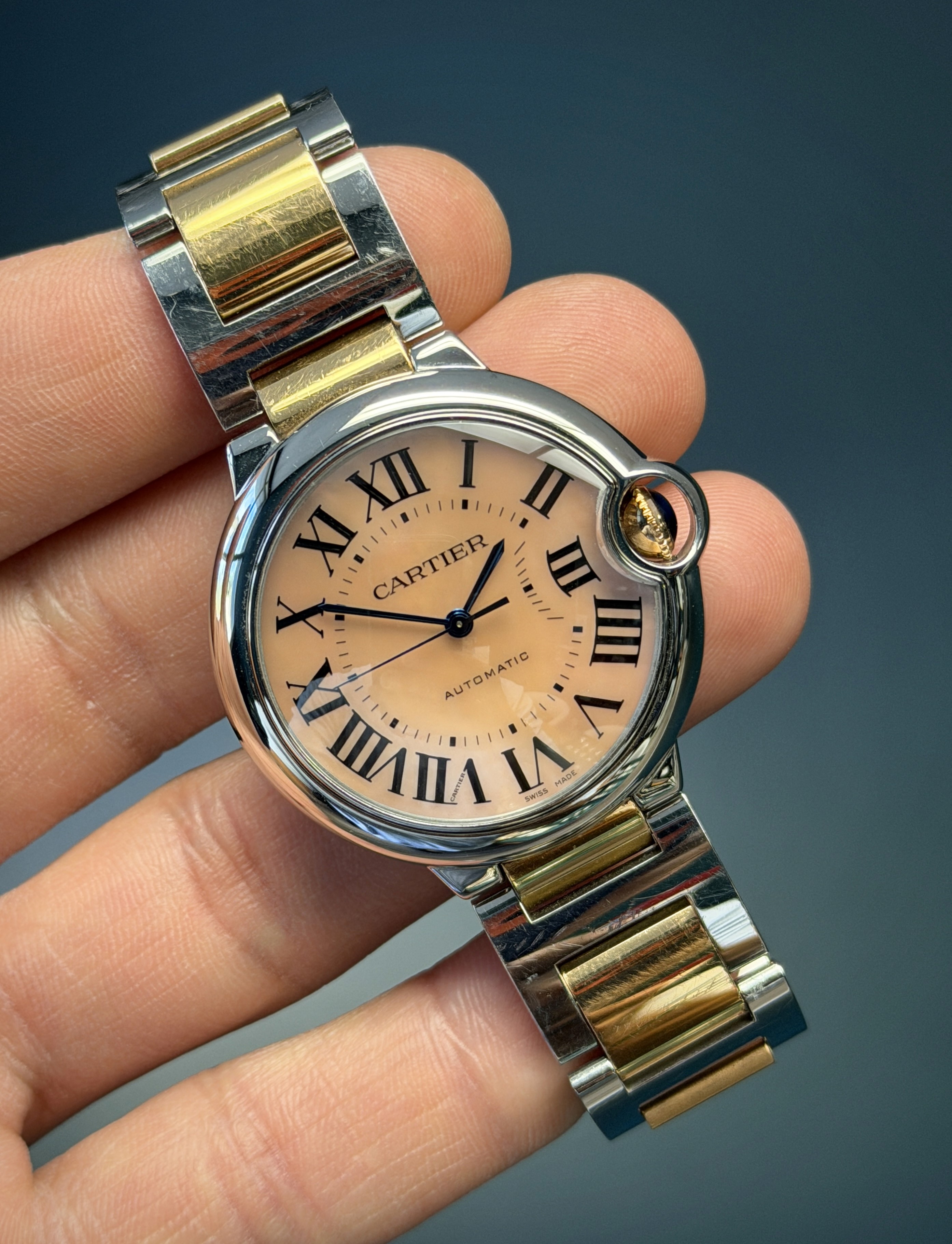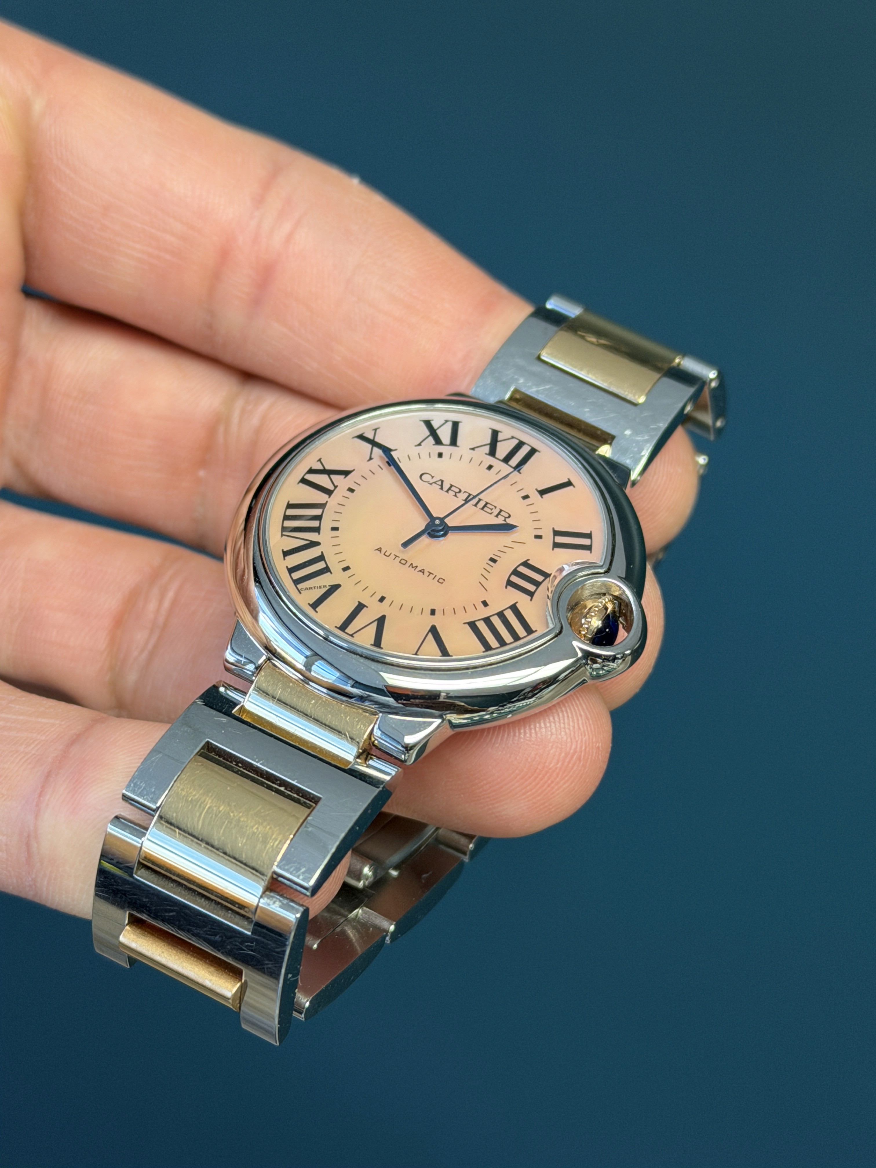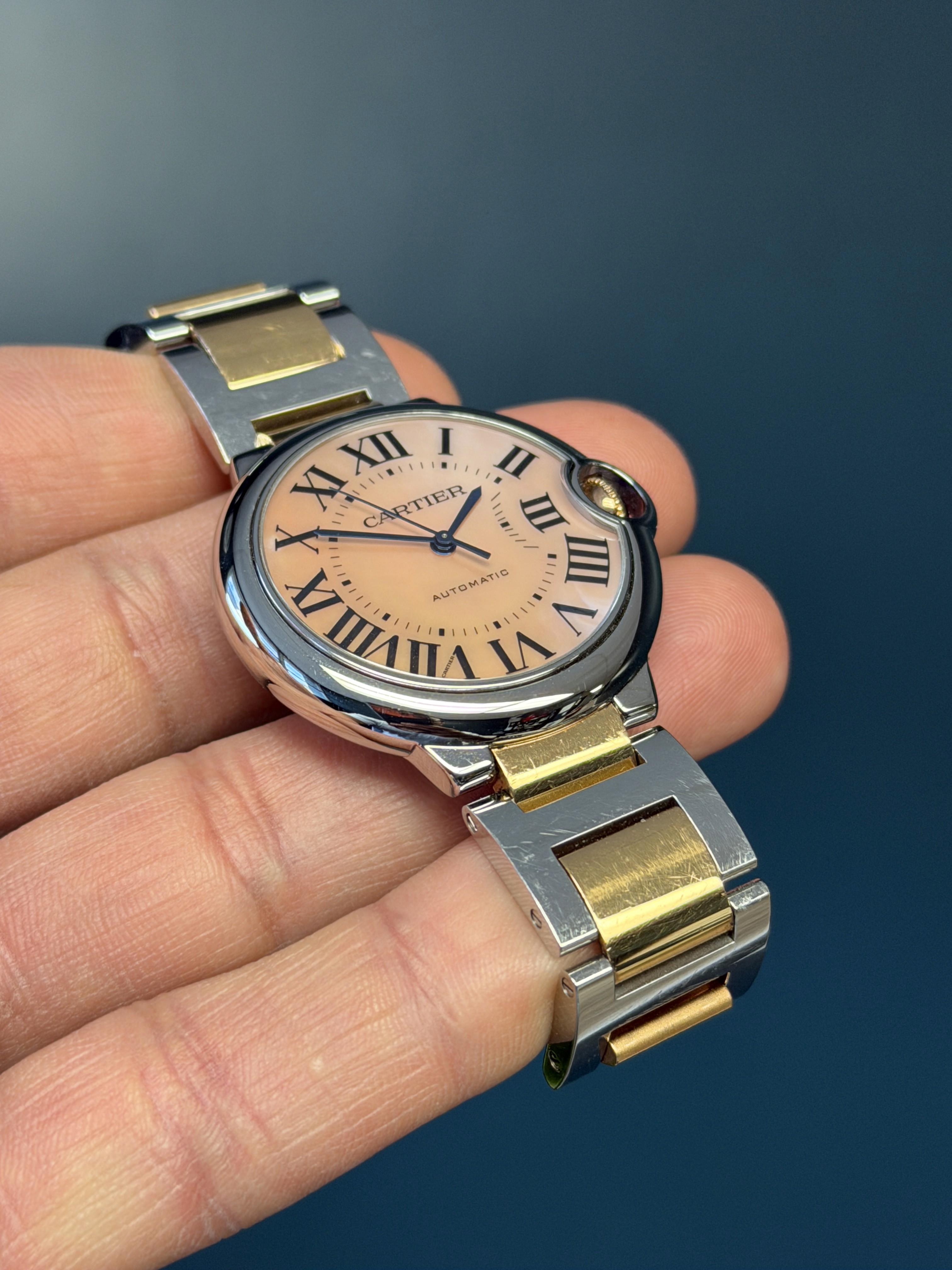 The Cartier Ballon Bleu Reference 3284 (W6920033) is a stunning fusion of elegance and contemporary craftsmanship. This exquisite timepiece showcases a luxurious two-tone design, combining 18k rose gold and stainless steel for a refined aesthetic. The signature rounded case, is accentuated by Cartier’s signature fluted crown set with a blue cabochon spinel. What truly sets this model apart is its factory Mother of Pearl dial, which elevates the watch’s sophistication with beautiful colored tones on the silvered guilloché dial. Blued steel hands glide effortlessly over the dial, enhancing its timeless allure. Powered by a precise automatic movement, this watch is as reliable as it is stylish. Perfect for those who appreciate classic Cartier charm with a touch of luxury, the Ballon Bleu 3284 is an exquisite statement piece. The bracelet on this example has a total of 10 links and shows no stretch.