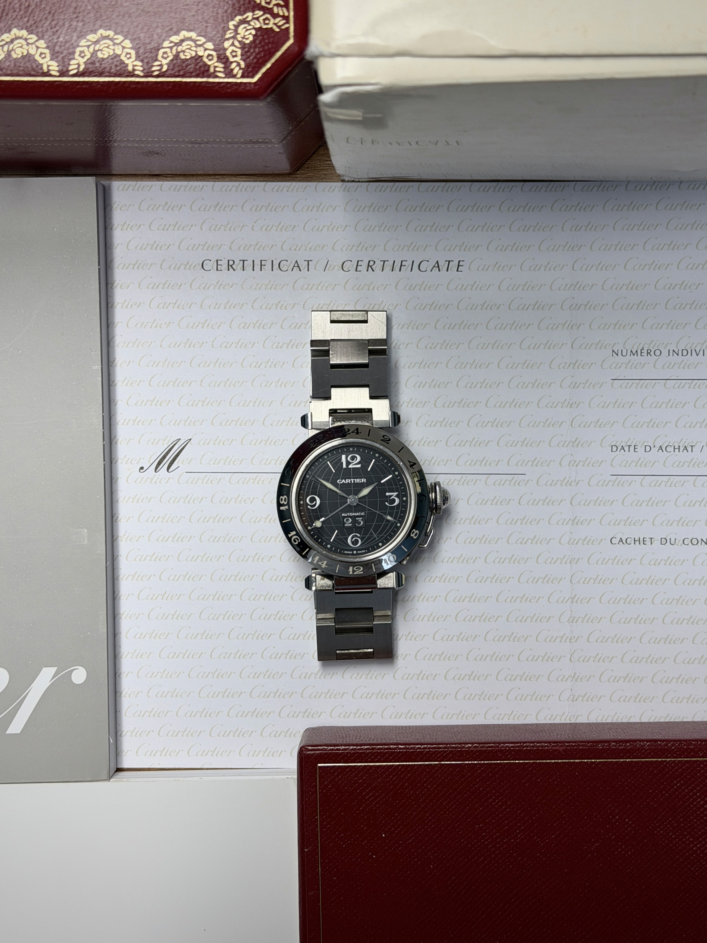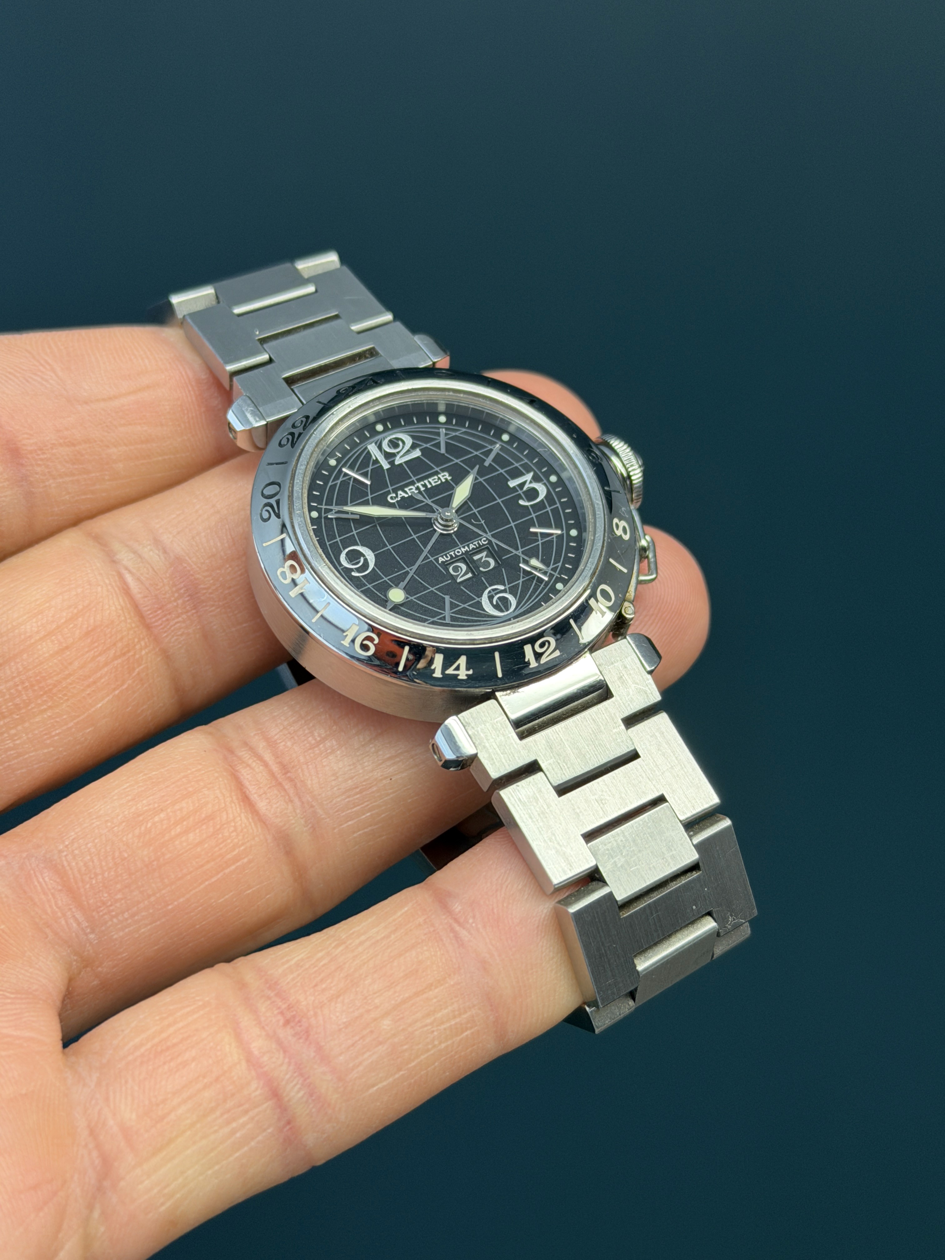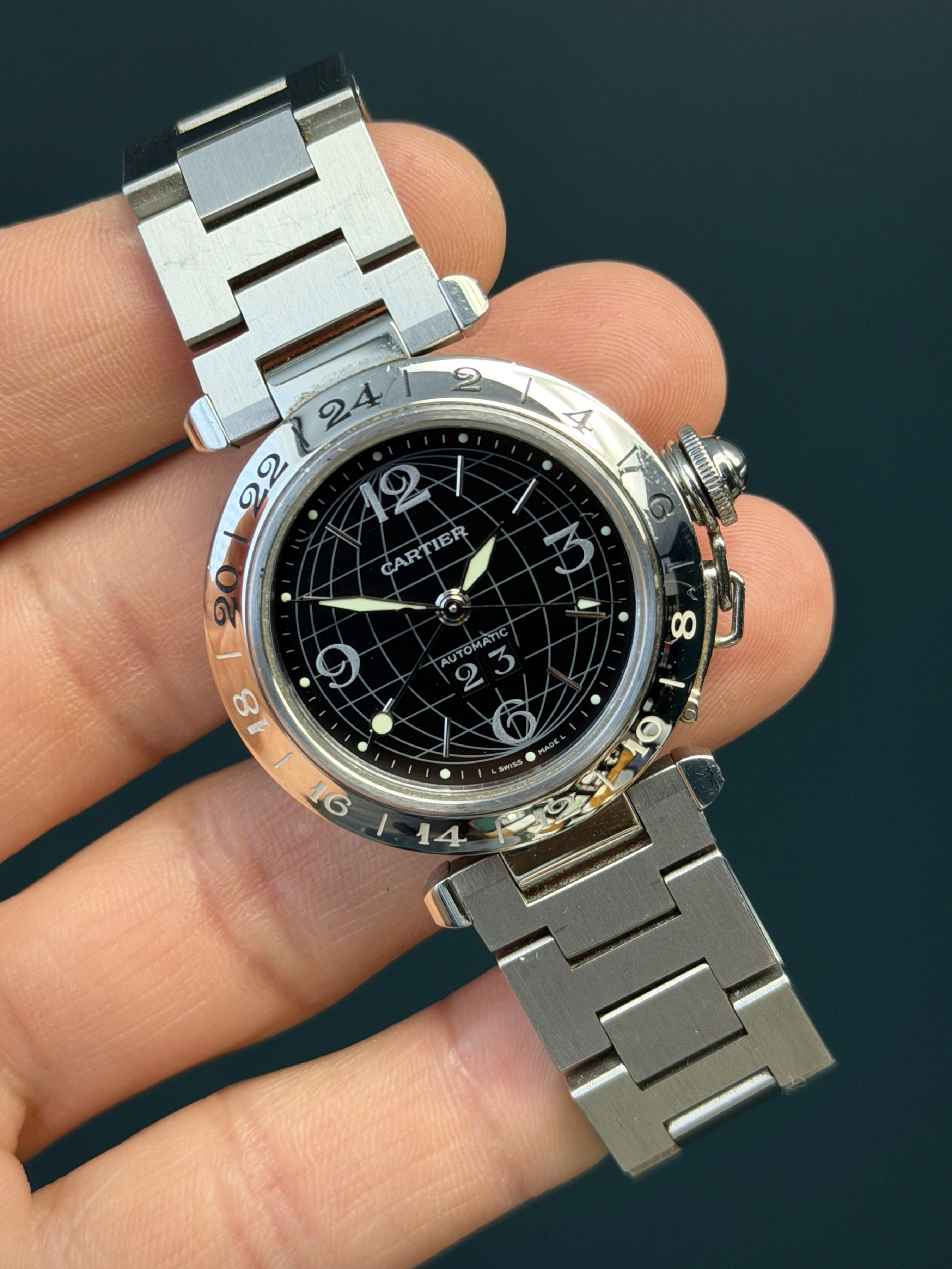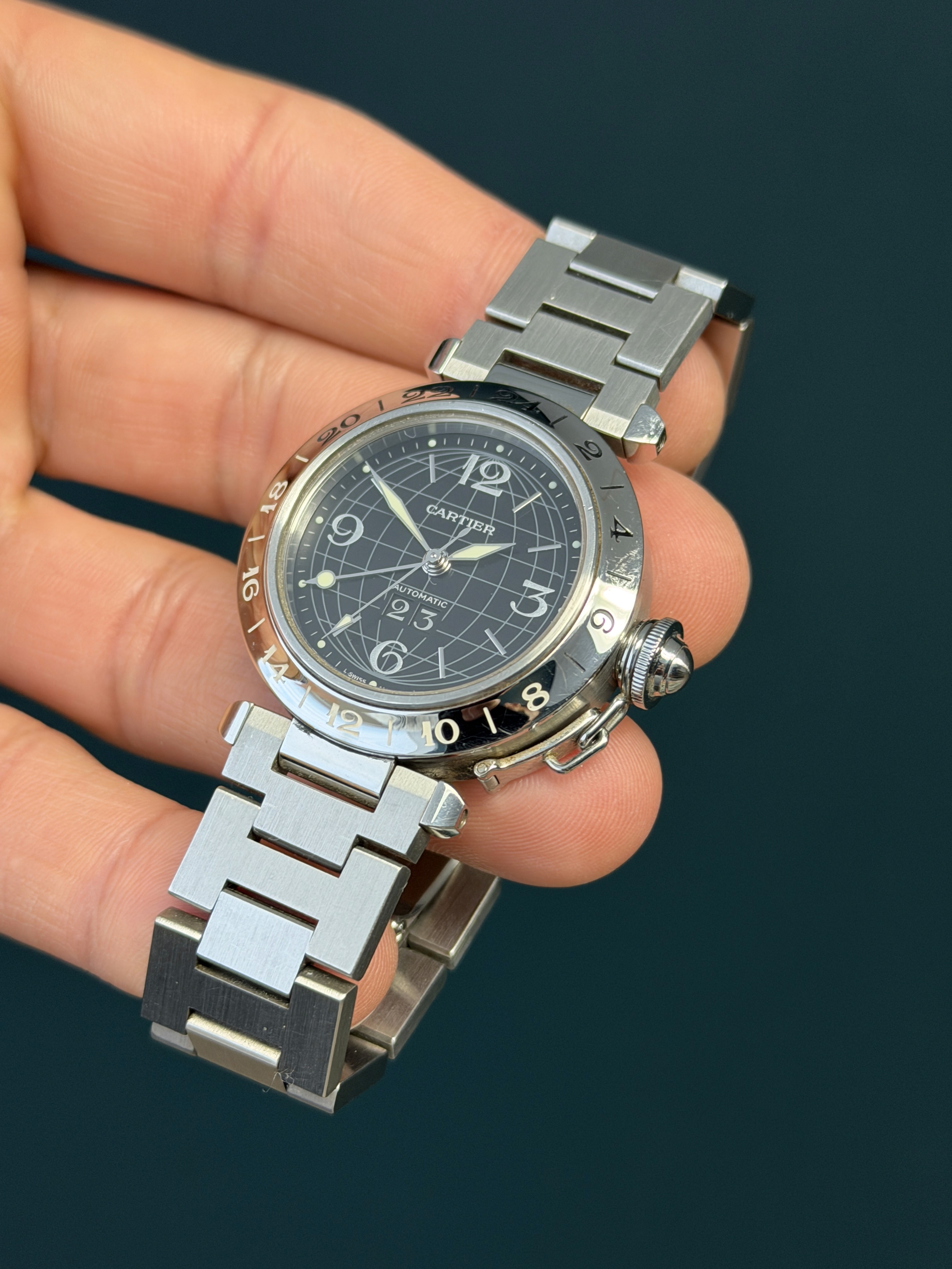 This full complete set includes the original box, papers, and accessories, underscoring its pristine provenance. Powered by a reliable automatic movement, the watch also features a date display at the 4 o’clock position. The timepiece is mounted on a polished stainless steel bracelet, providing both durability and elegance. The Cartier Pasha GMT Reference 2550 combines timeless style and practical complications, making it a standout addition to any collection. This set comes to us with open date papers, a long bracelet with 7 removable links and in excellent preowned condition!