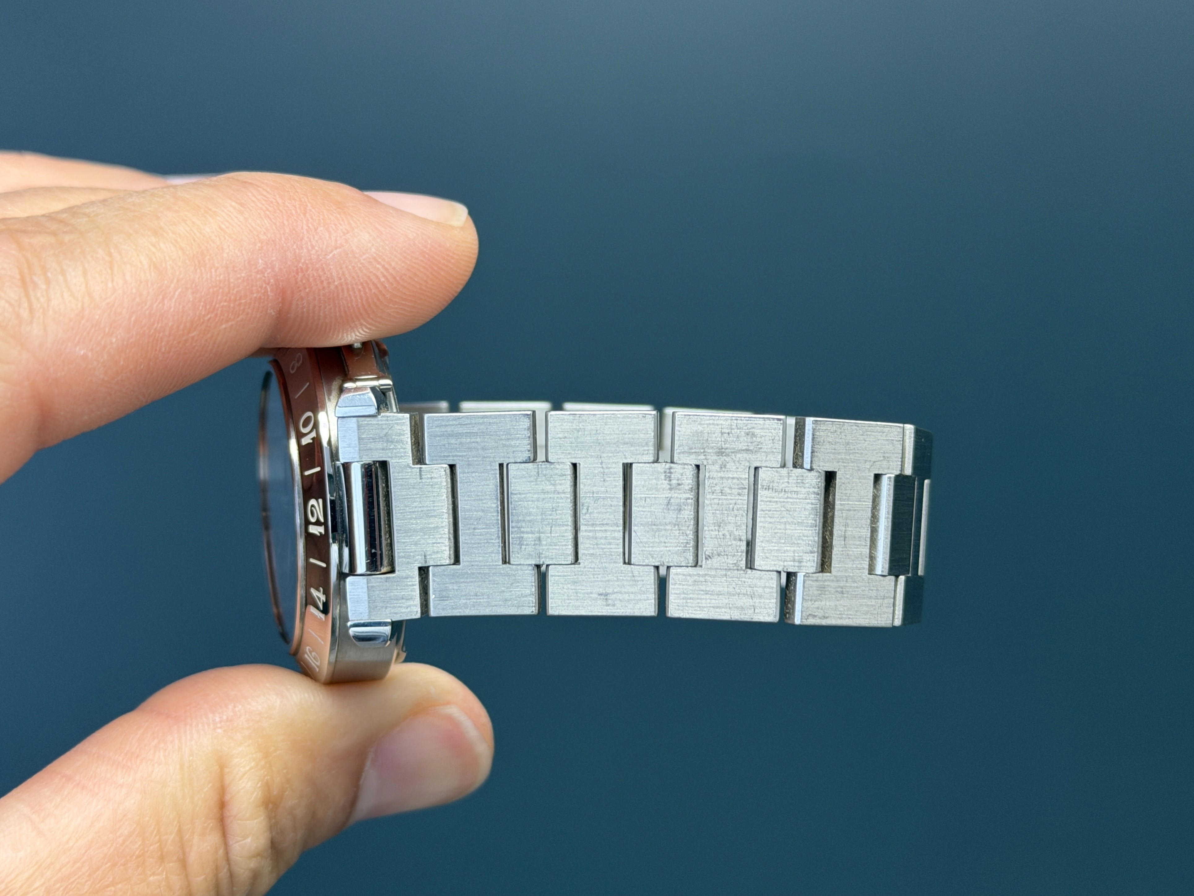Its striking black grid dial showcases Arabic numerals, luminous diamond-shaped hands, and a date aperture at 6 o’clock, all protected by a scratch-resistant sapphire crystal. The automatic self-winding movement powers the GMT complication, allowing the wearer to track a second time zone—an ideal feature for travelers and collectors alike.