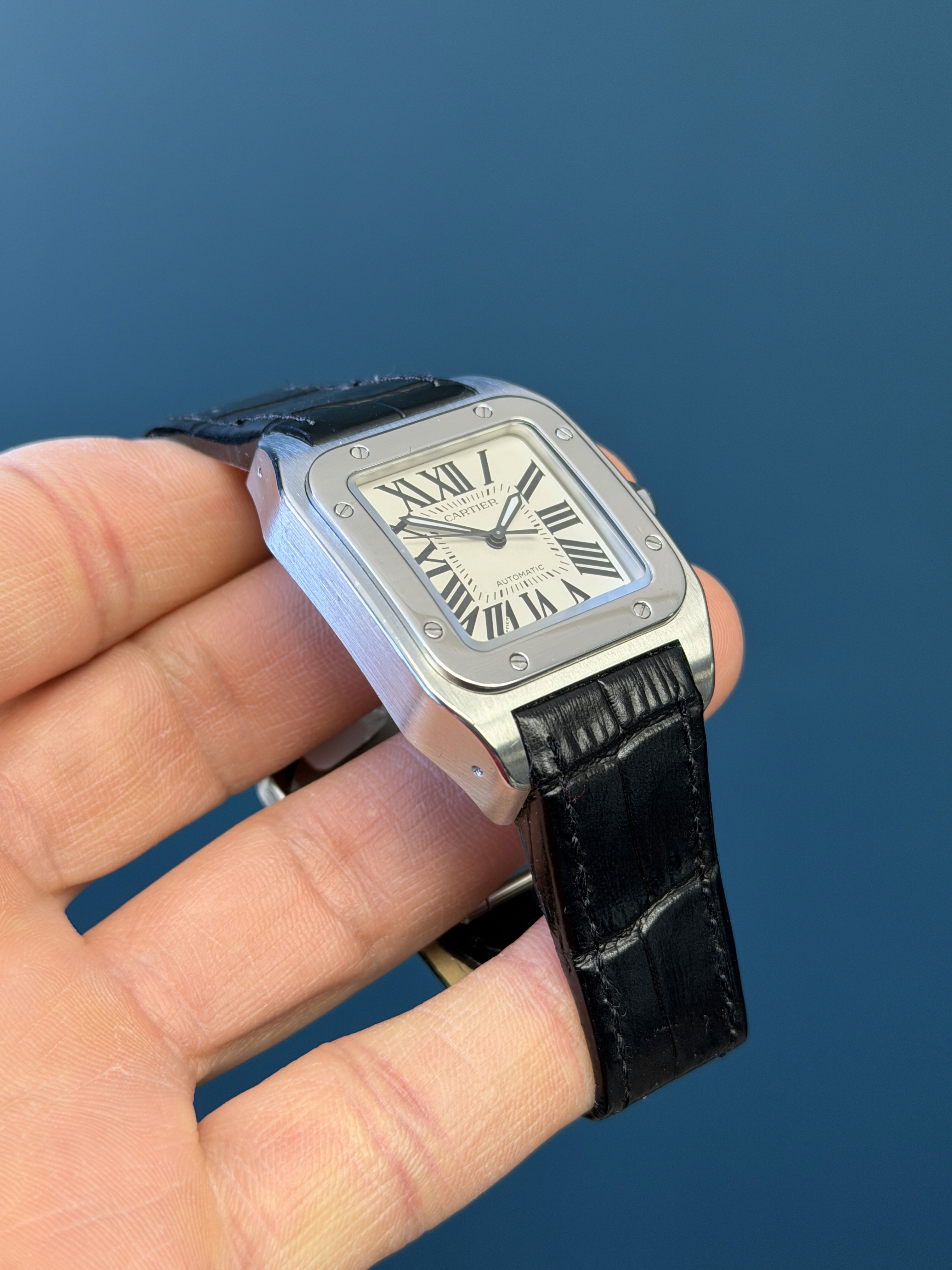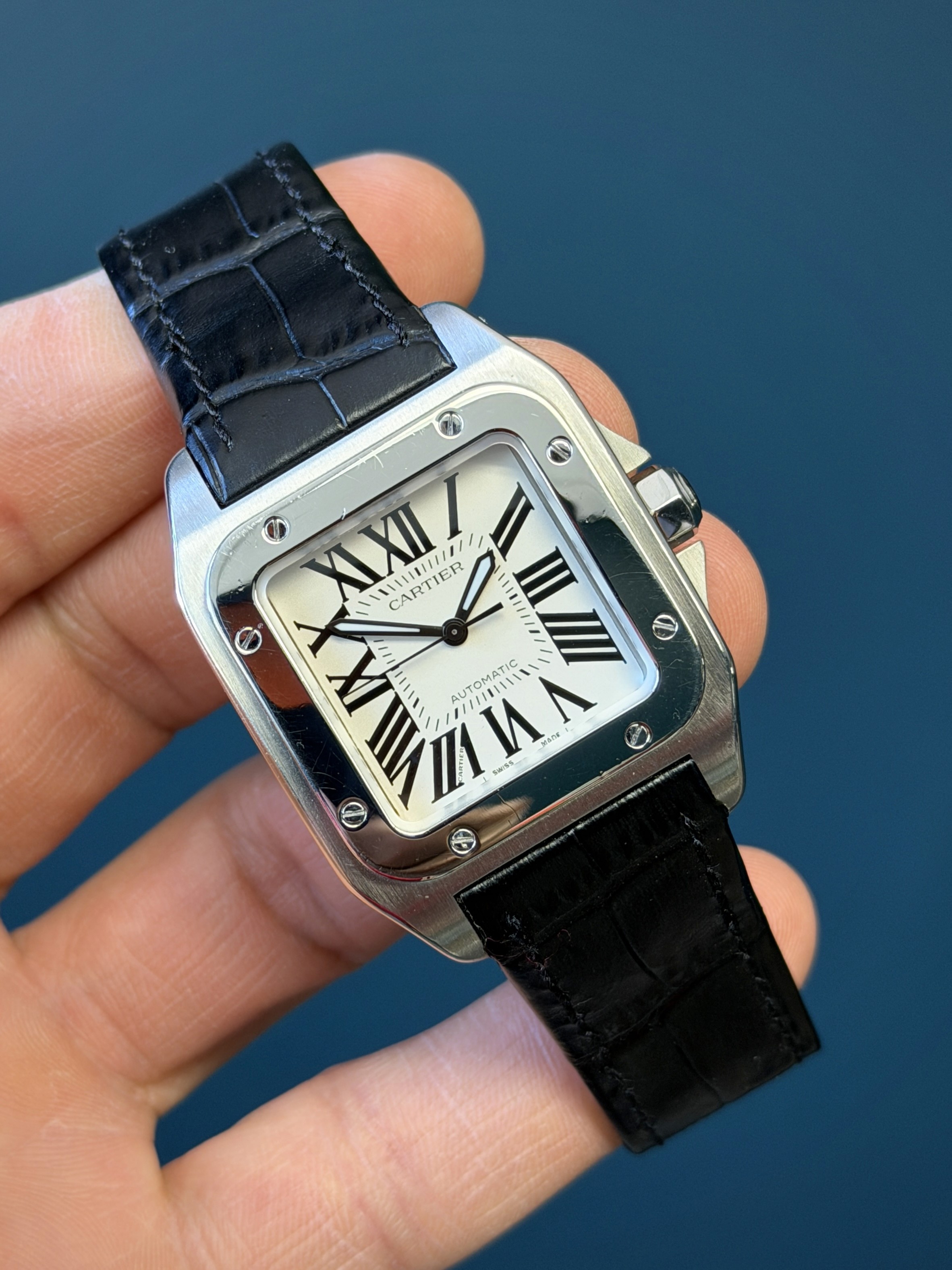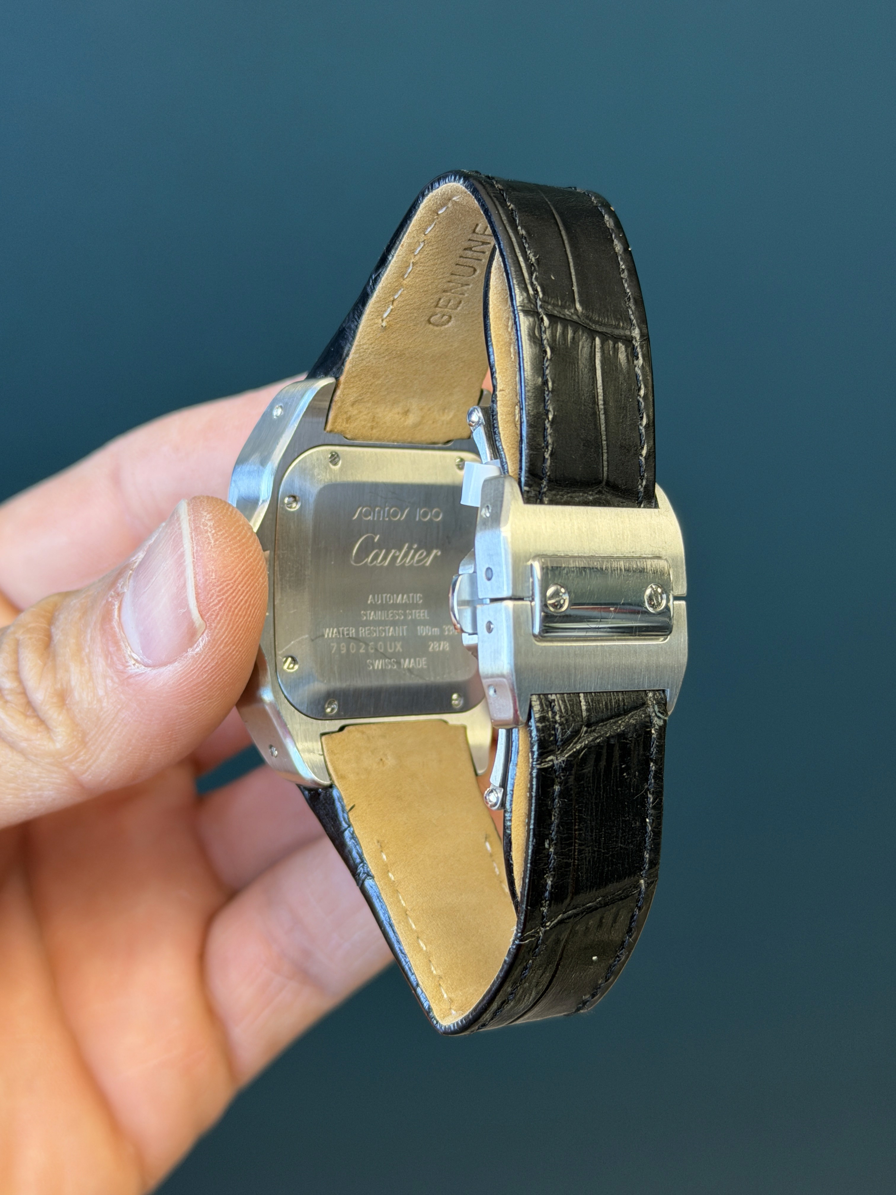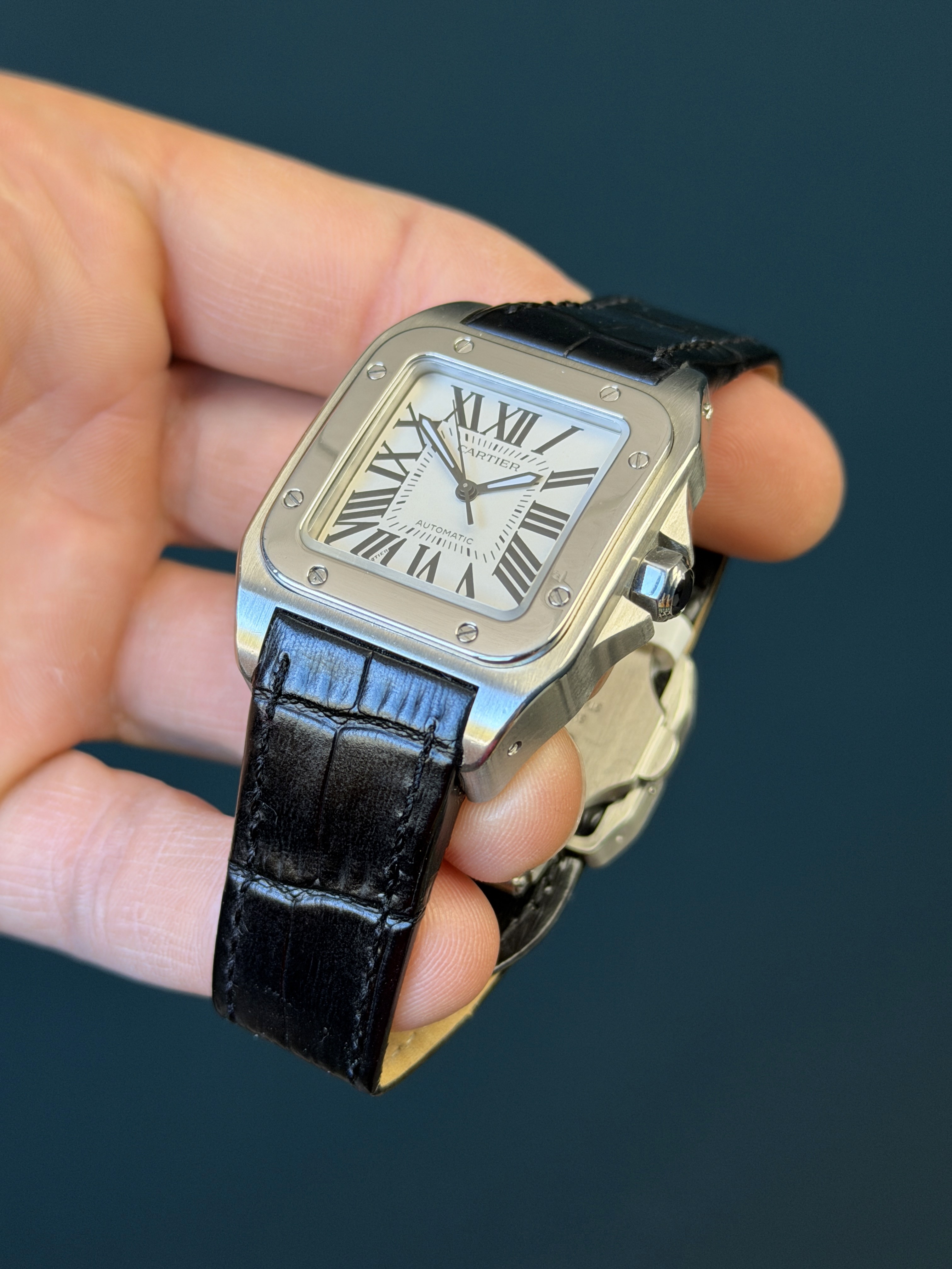 A refined blend of classic design and everyday versatility, the Cartier Santos 100 Ref. 2878 (W20106X8) features a stainless steel square case with iconic exposed screws and a silvered opaline dial framed by bold Roman numerals. Powered by a Swiss automatic Calibre 076 movement, it offers reliable timekeeping in a compact 33 mm midsize case paired with a black alligator leather strap and deployment clasp. With scratch-resistant sapphire crystal, a faceted spinel-set crown, and 100 m water resistance, this Santos 100 delivers Cartier’s signature luxury and heritage in a stylish, wearable everyday automatic timepiece.