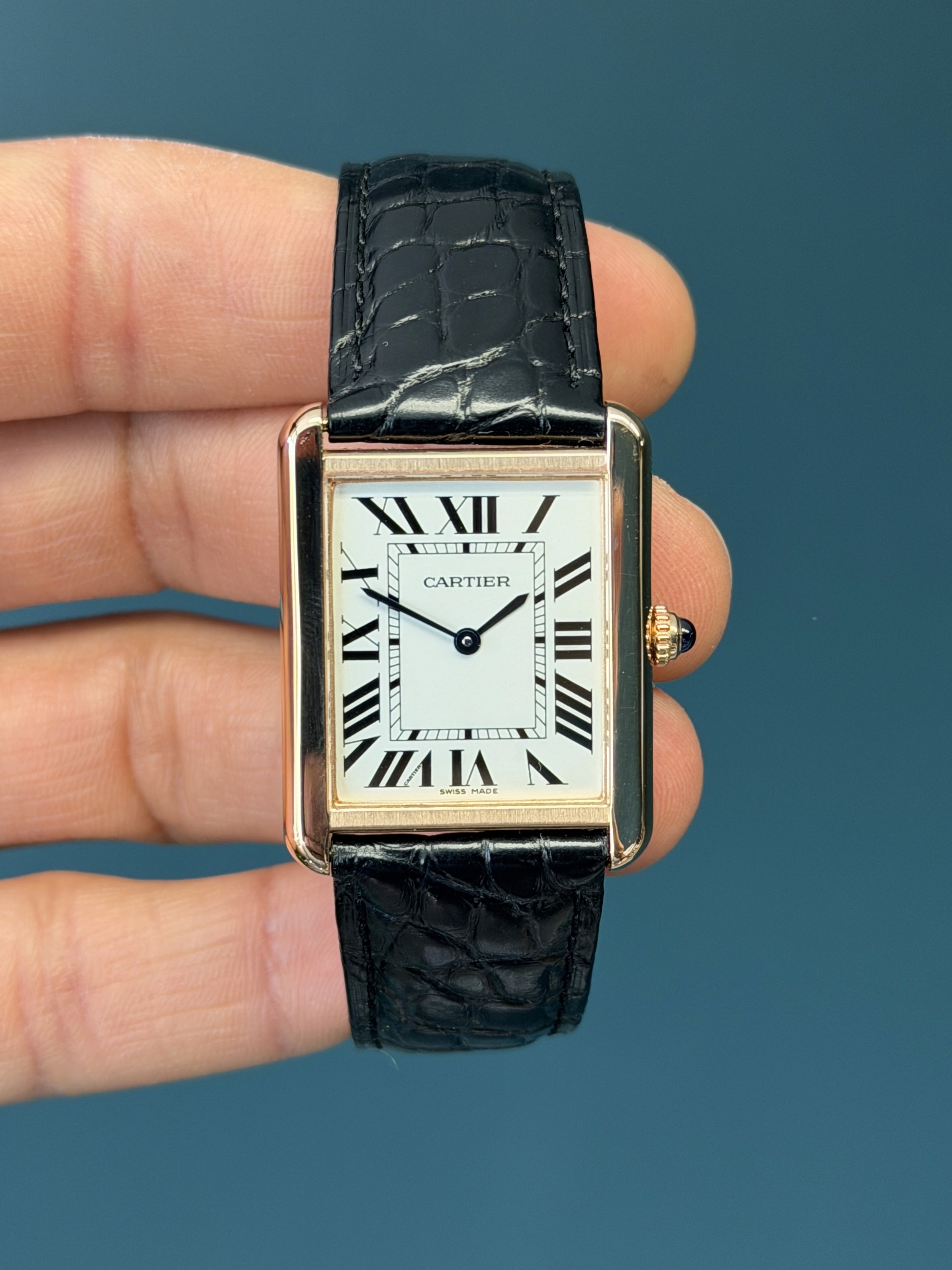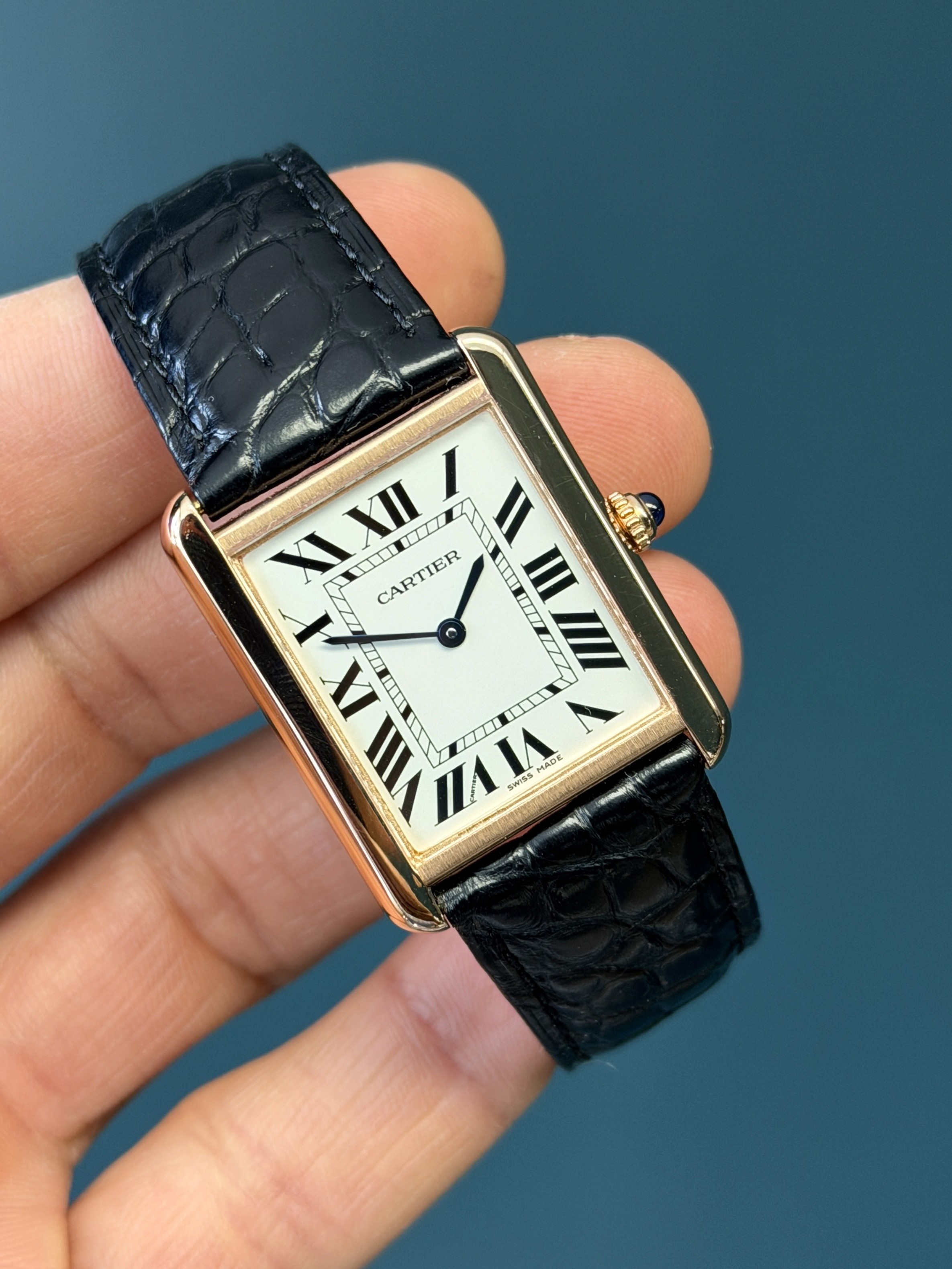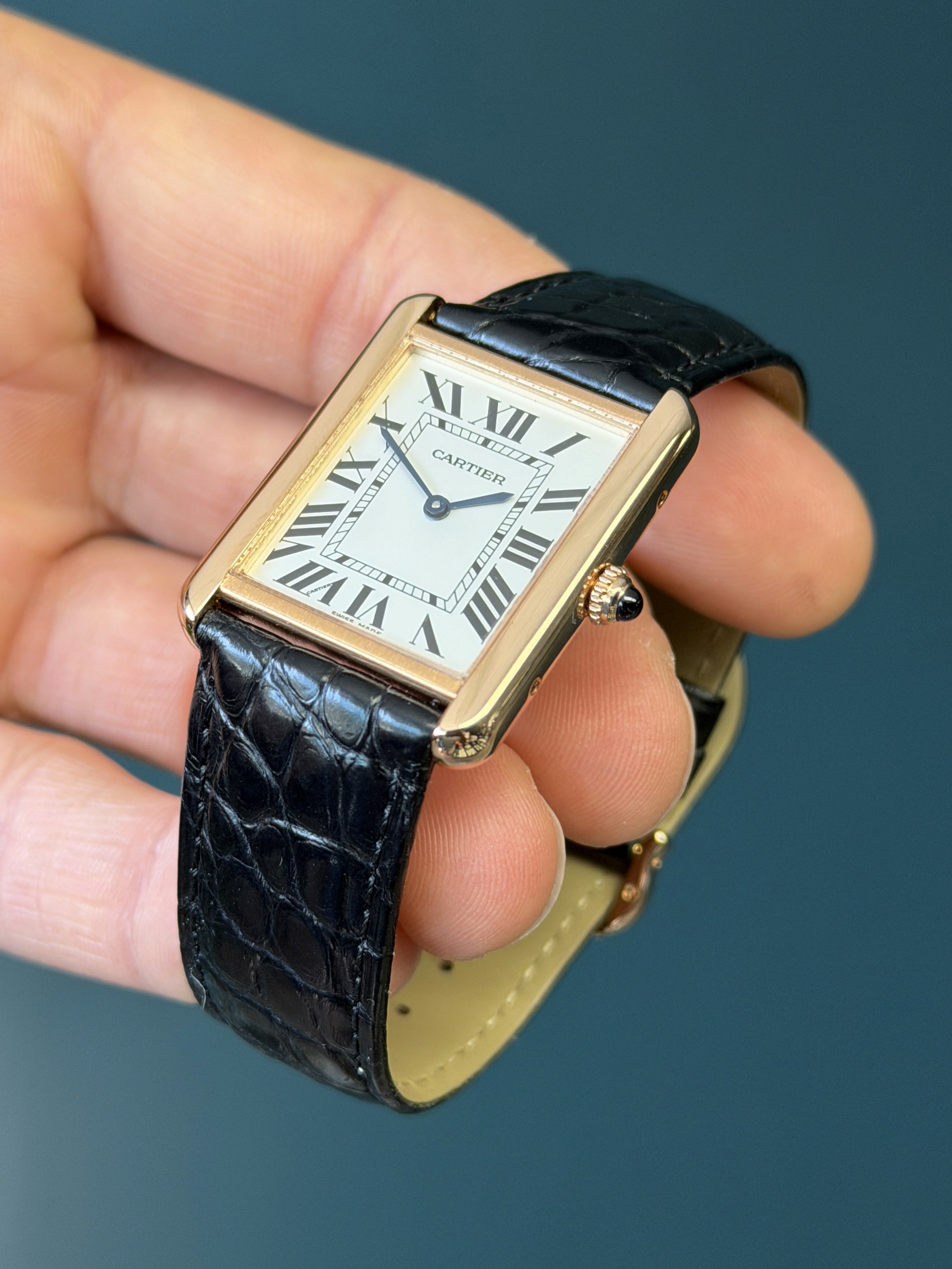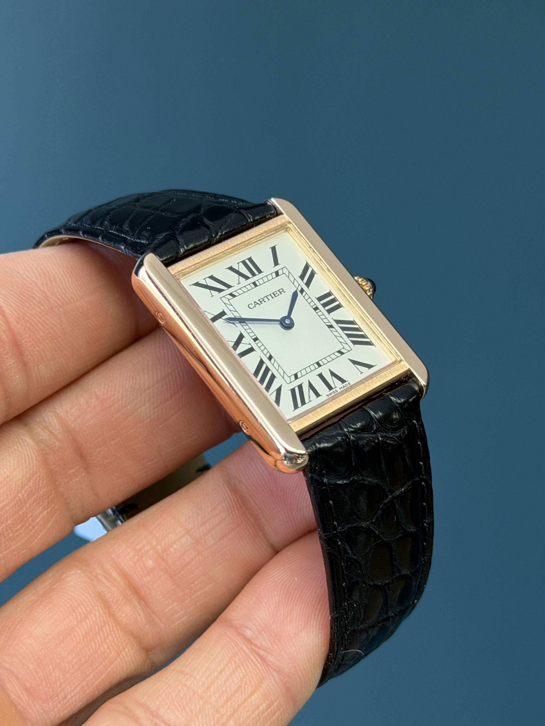 Powered by a reliable quartz movement, the watch delivers effortless precision and low-maintenance convenience. The classic silvered opaline dial features bold Roman numeral hour markers, a chemin-de-fer minute track, and blued steel sword hands—signature elements that reinforce the Tank’s iconic aesthetic. A sapphire crystal protects the dial, while the beaded crown is set with Cartier’s distinctive cabochon, adding a subtle touch of sophistication.