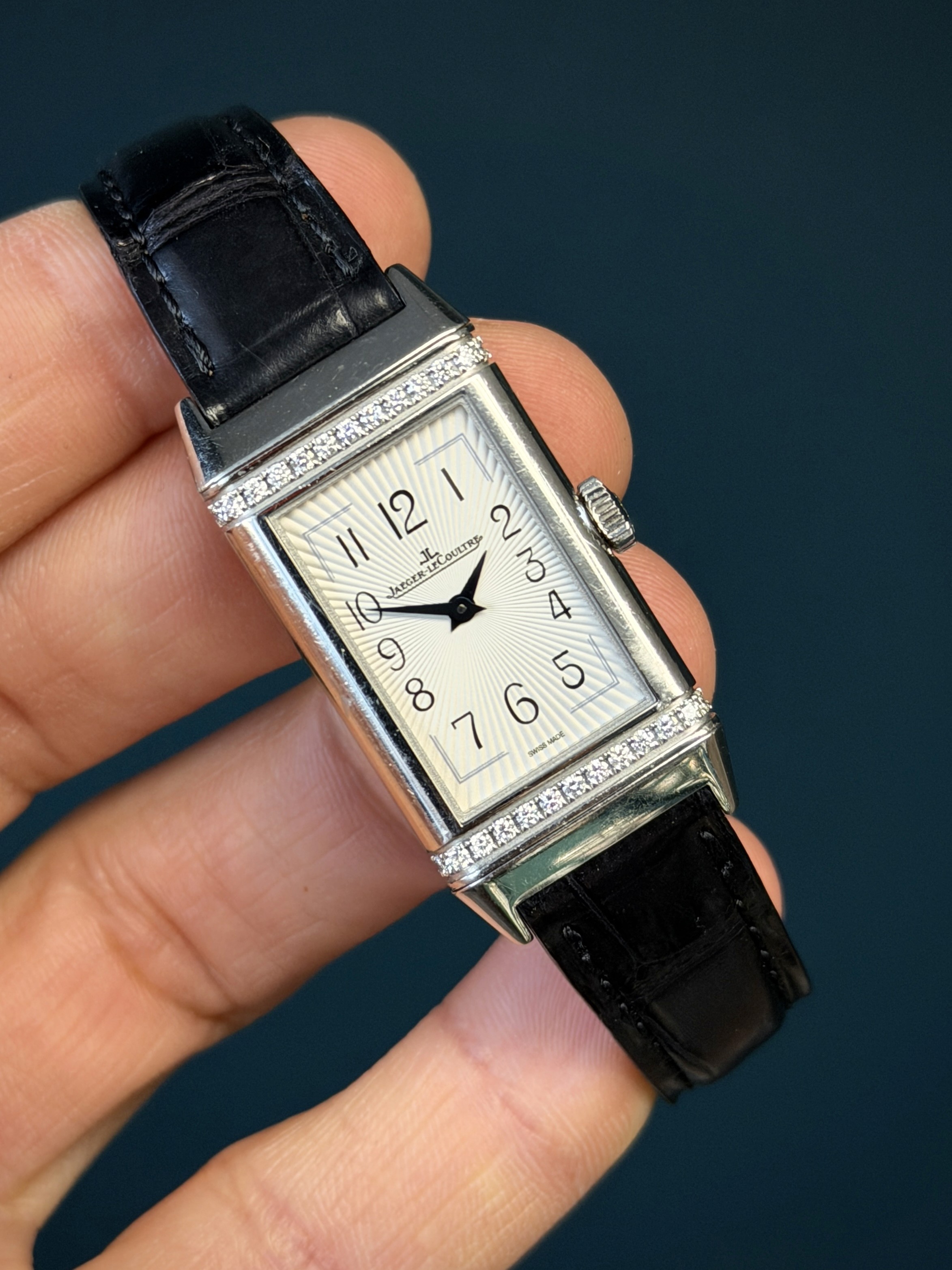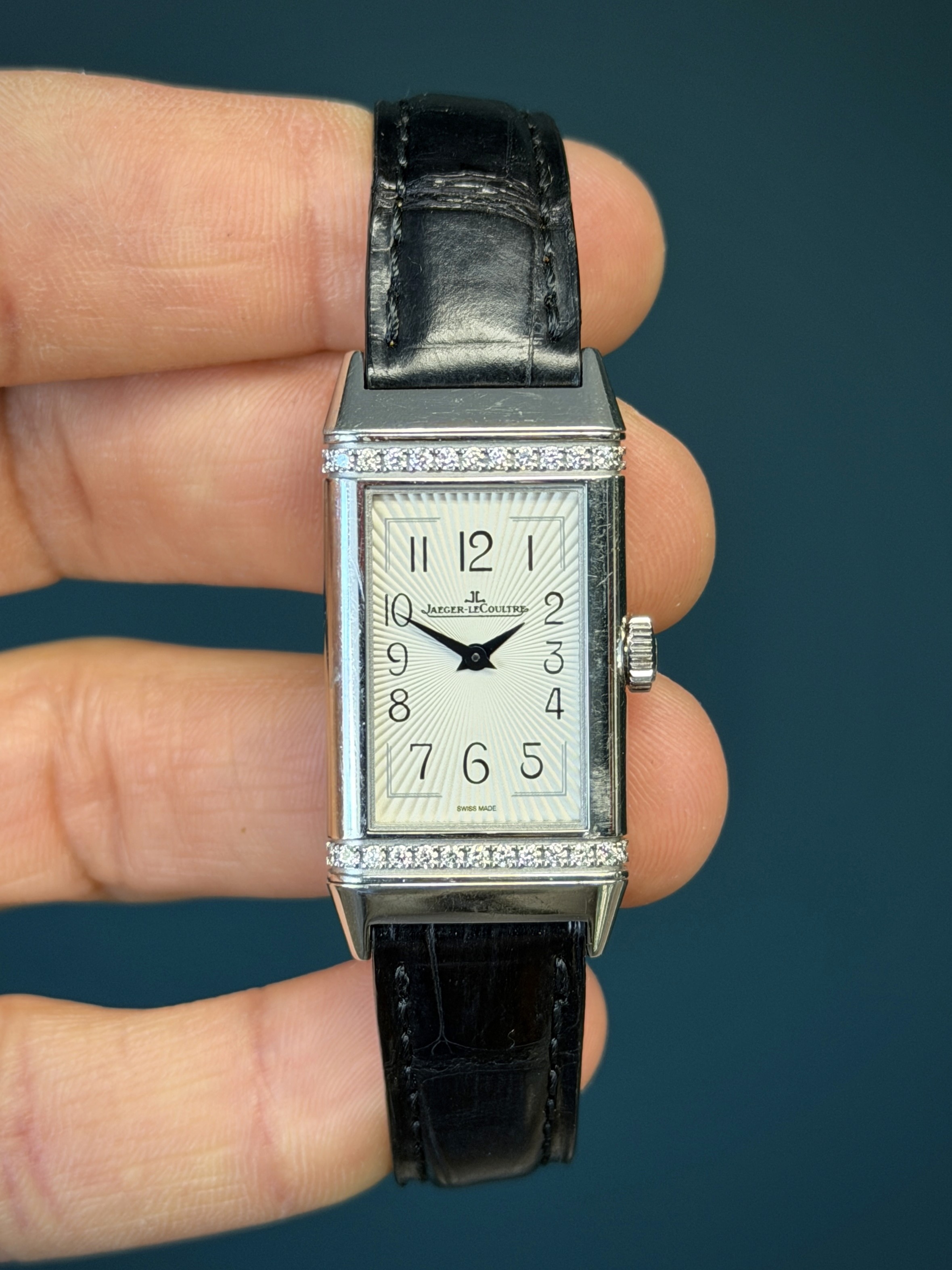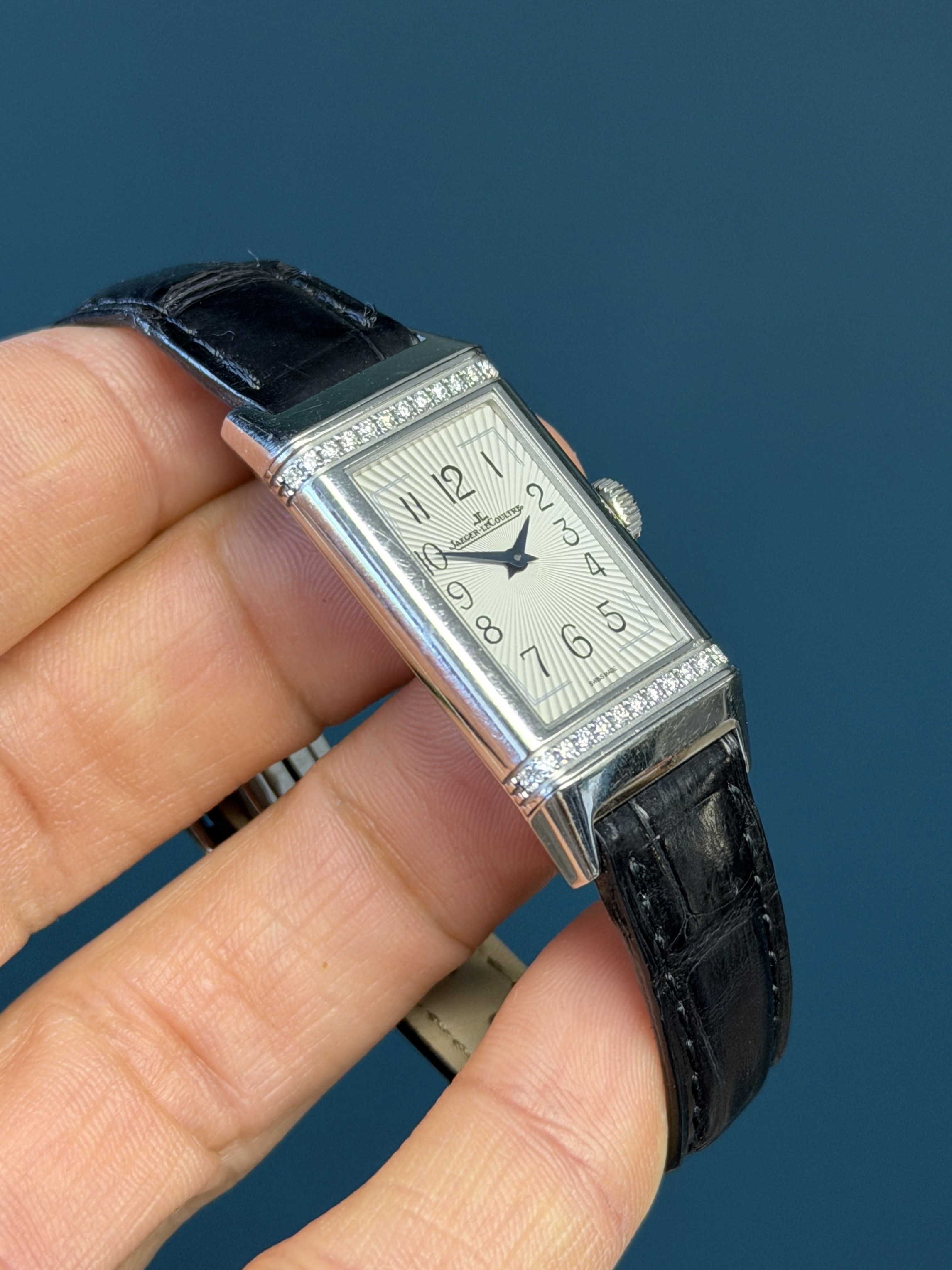 A sophisticated interpretation of an icon, the Jaeger-LeCoultre Reverso reference 201.8.47 / Q3288420 pairs timeless Art Deco design with refined luxury. The reversible rectangular case—hallmark of the Reverso line—is crafted in stainless steel and enhanced by a factory-set diamond bezel, adding a subtle brilliance without compromising its classic character.