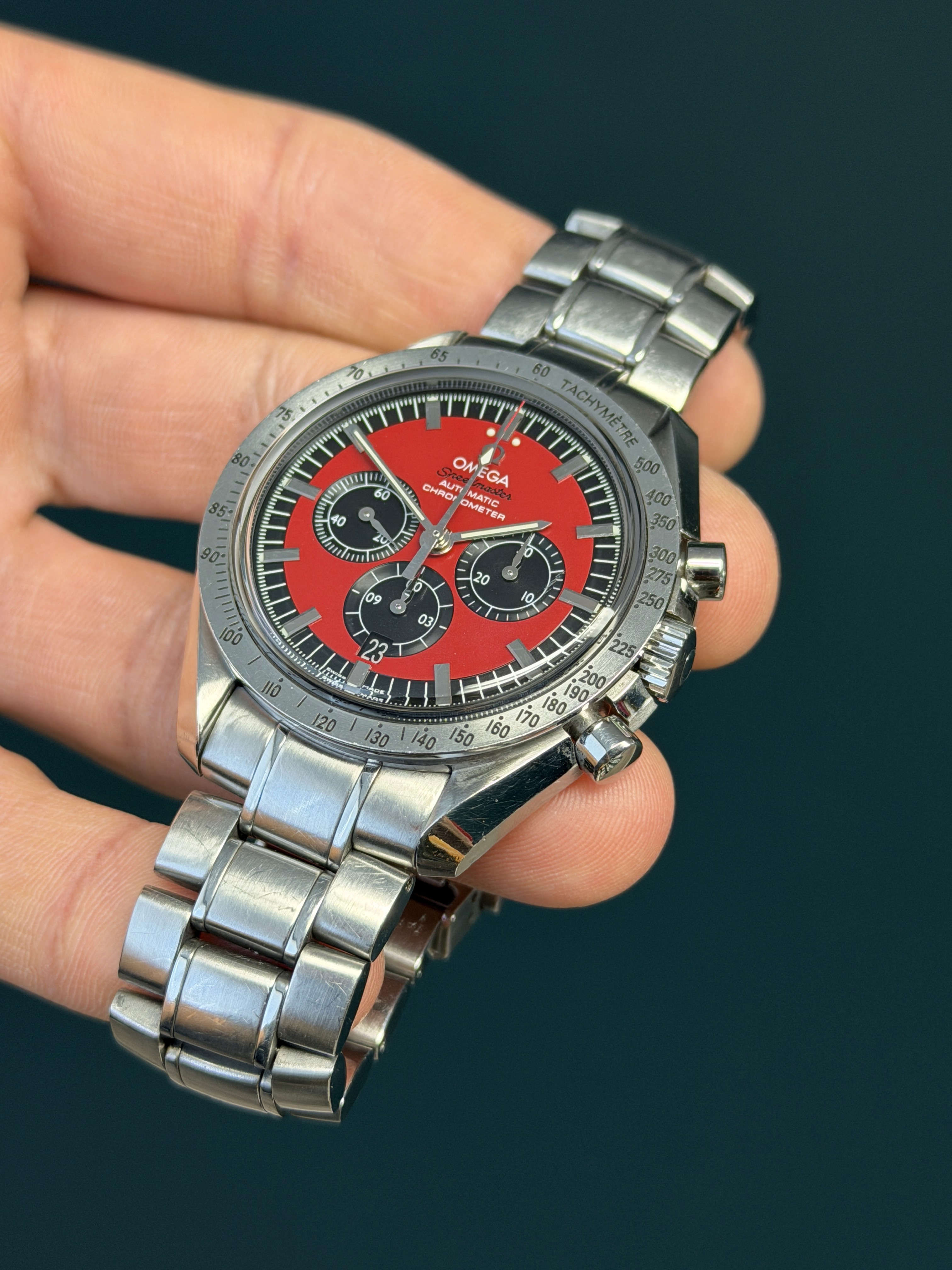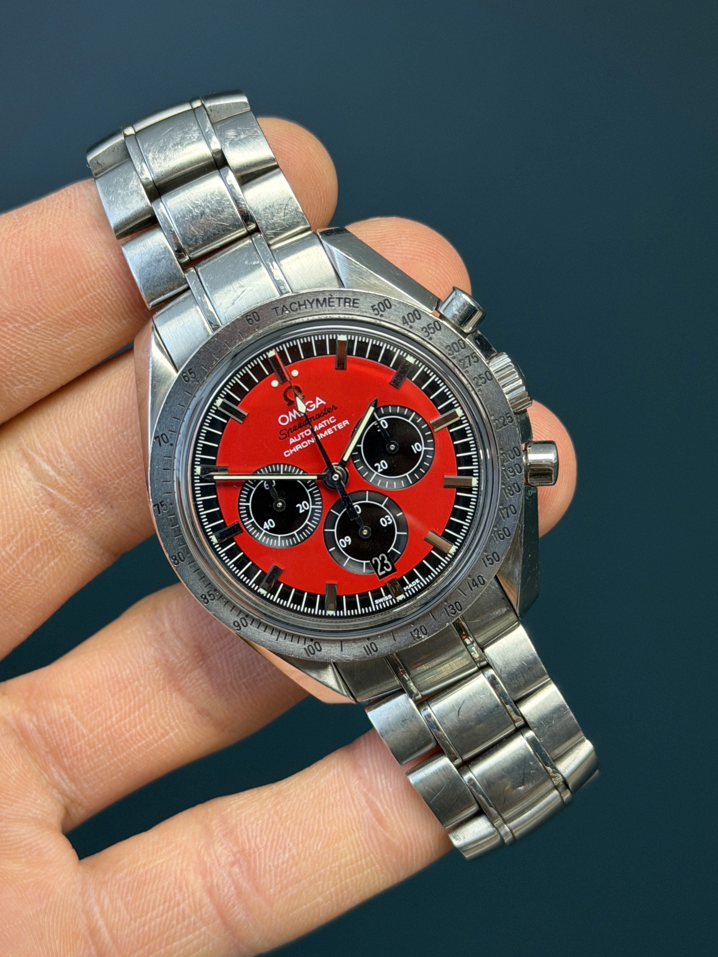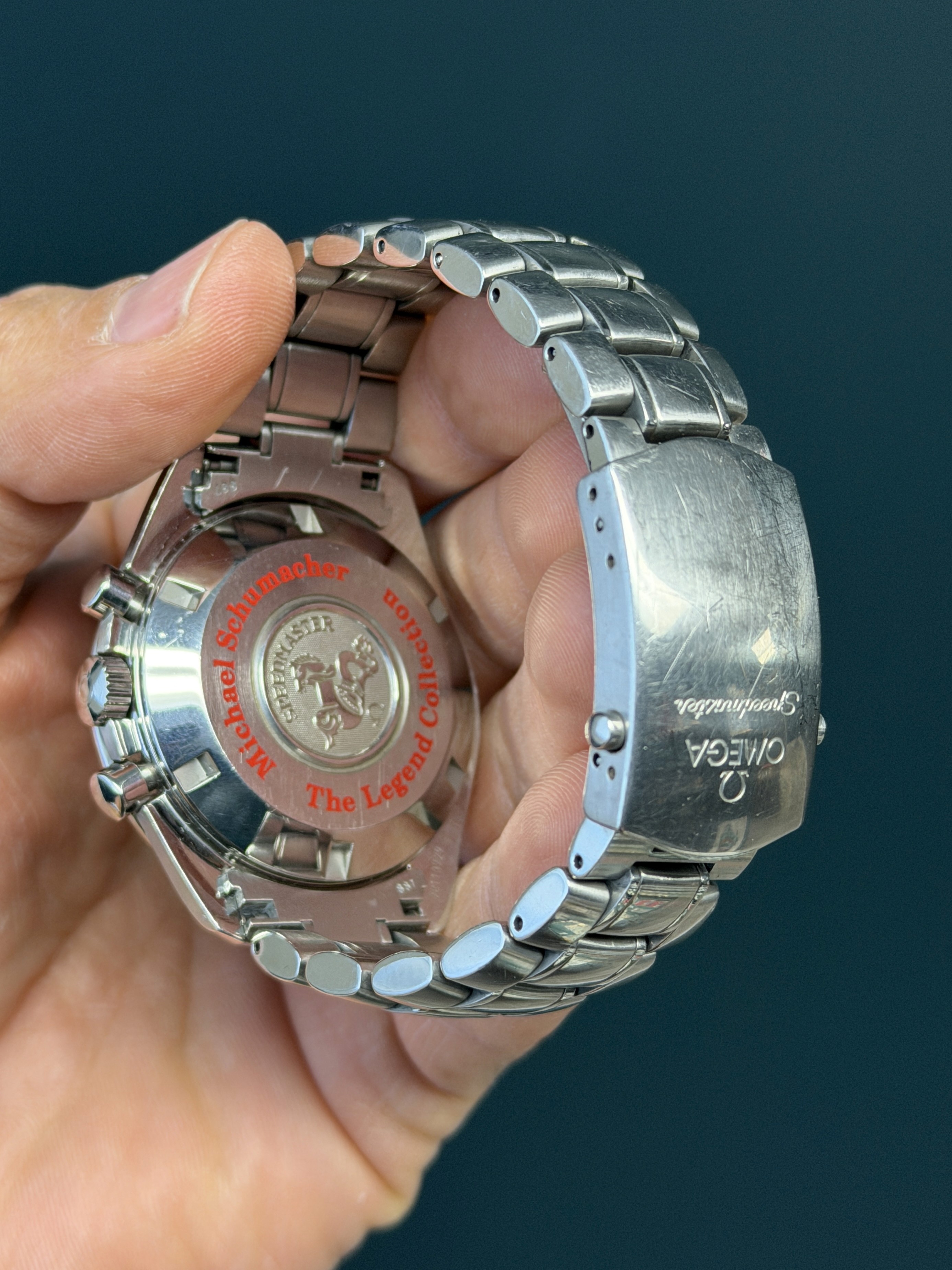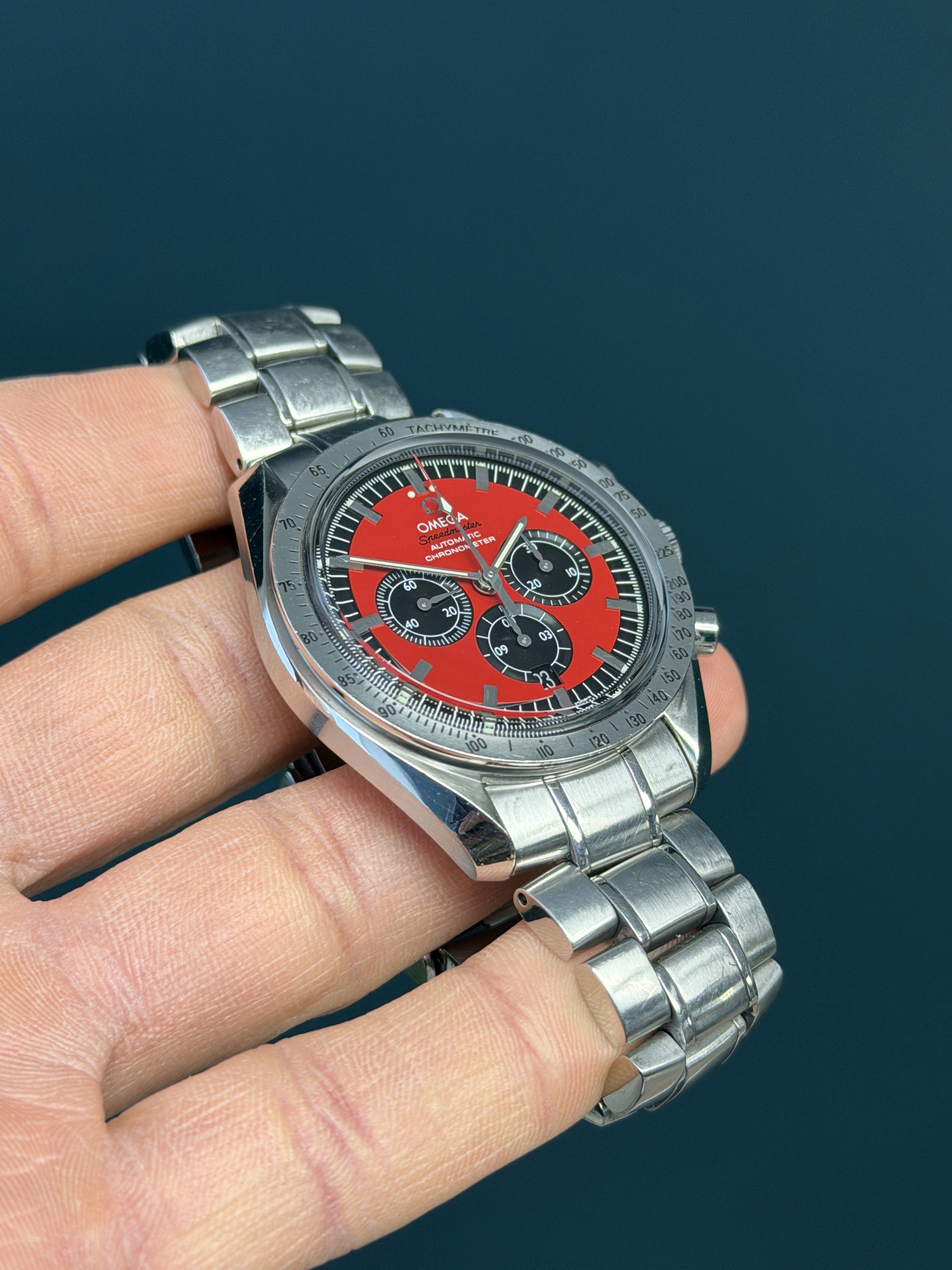 Produced in the mid-2000s and now discontinued, the Speedmaster Schumacher 3506.61 has become an increasingly sought-after model among enthusiasts, appreciated for its unique colorway and direct connection to racing history.