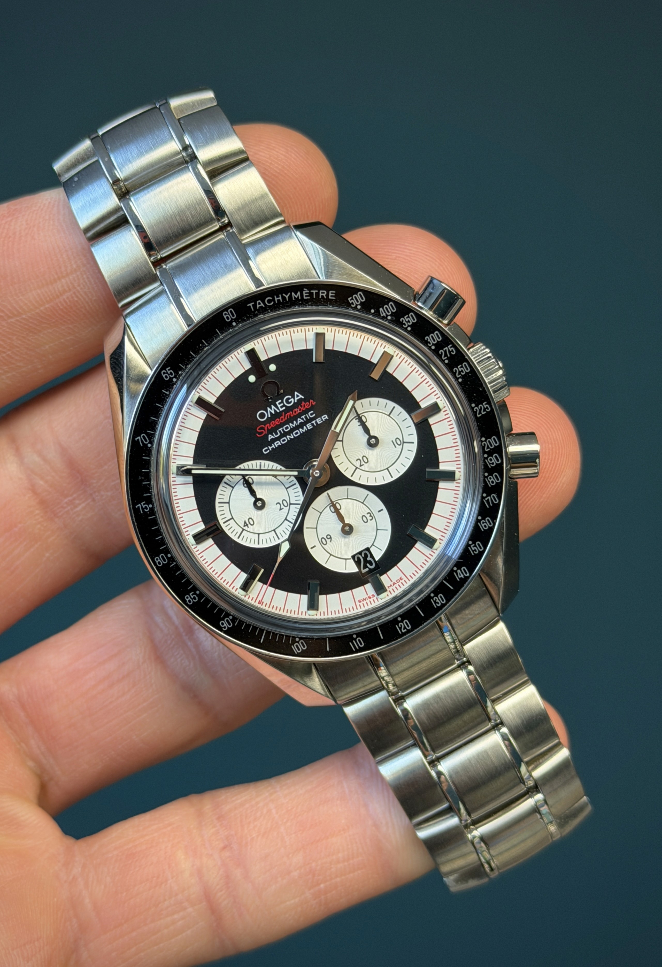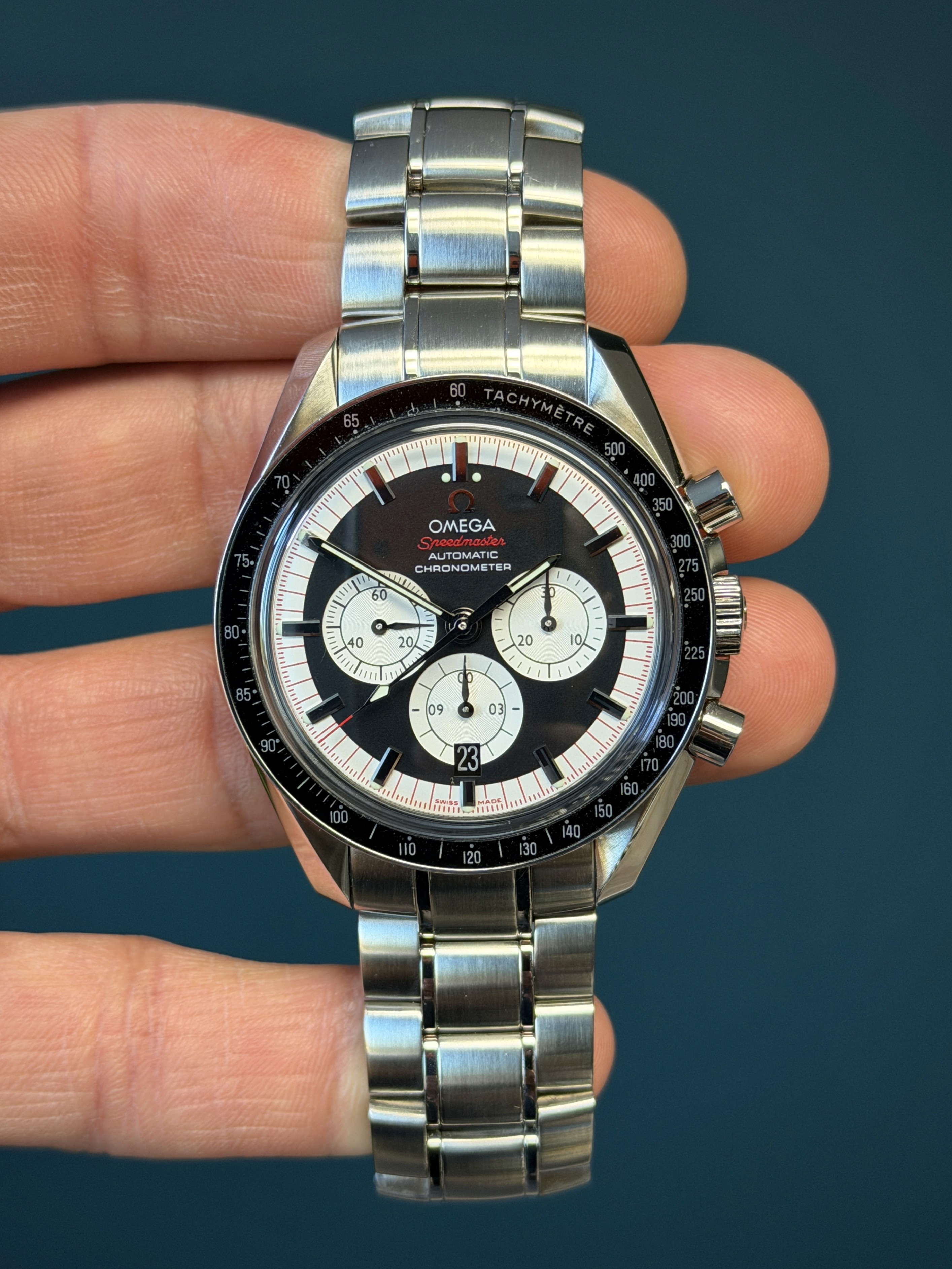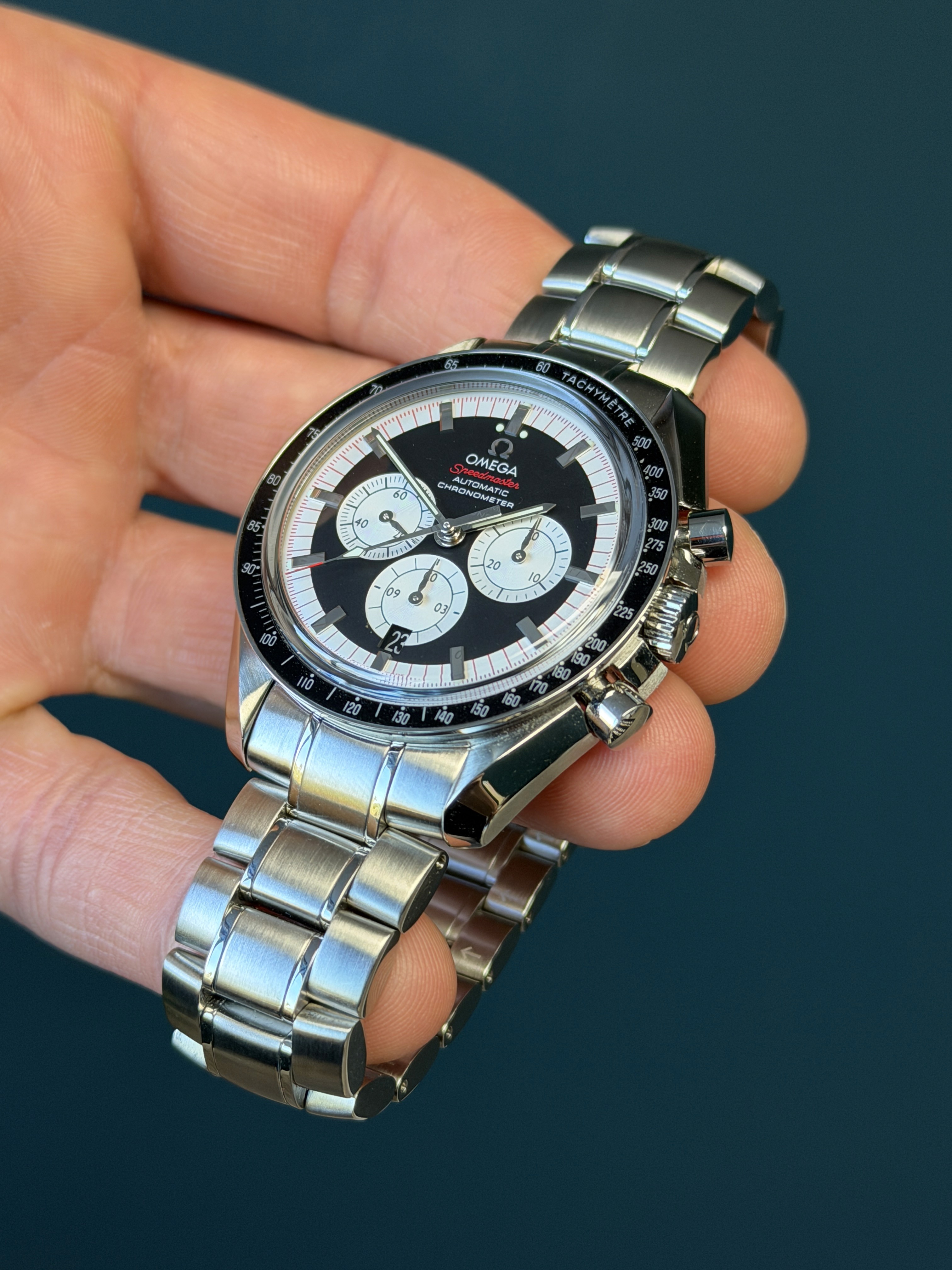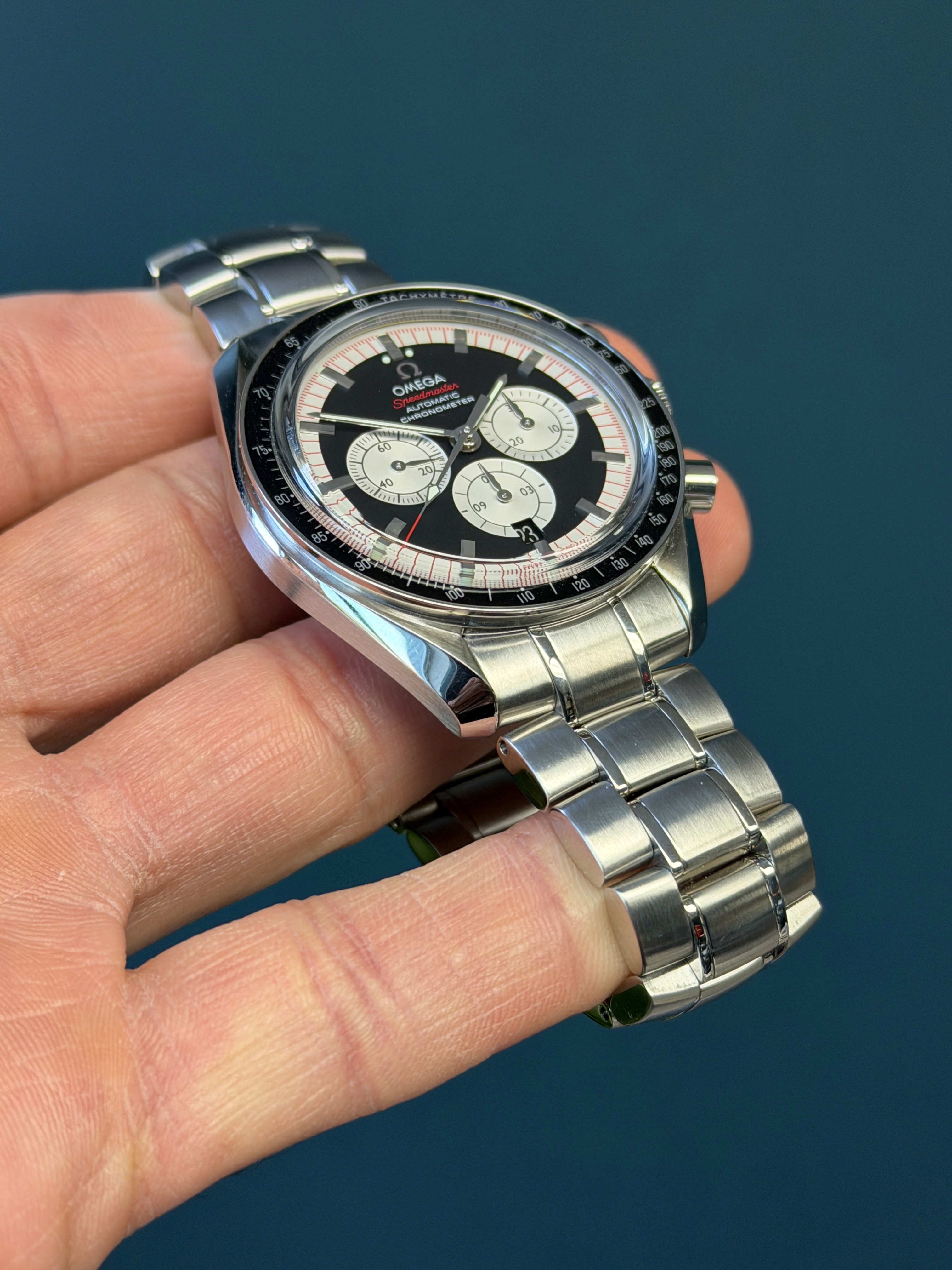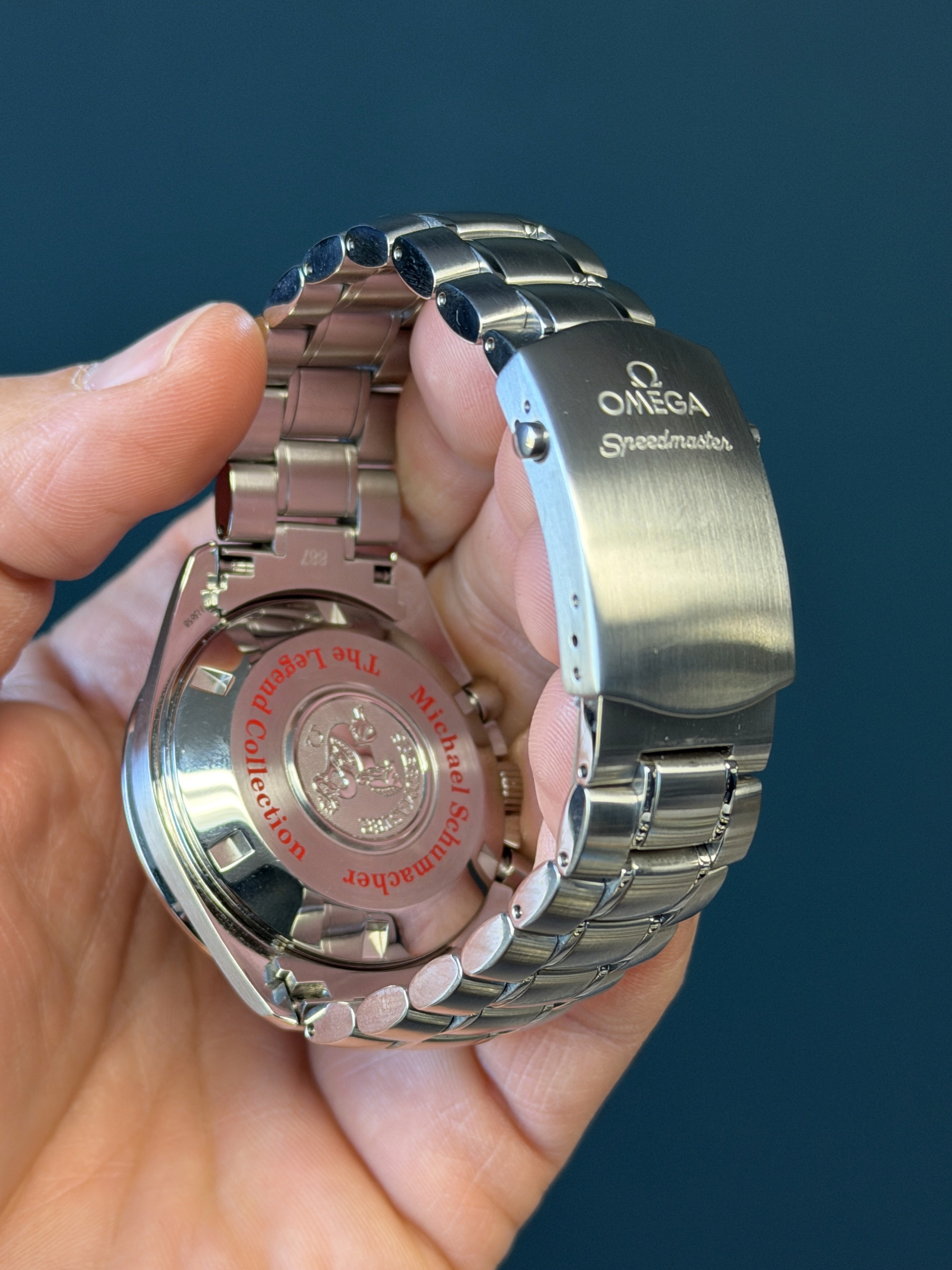 The Omega Speedmaster Michael Schumacher Legends Collection Ref. 3507.51 is a bold and sporty chronograph that celebrates the brand’s connection to motorsport legend Michael Schumacher. Featuring a 42 mm stainless steel case with a black tachymeter bezel and integrated steel bracelet, this automatic chronograph houses Omega’s reliable Calibre 3301 with column-wheel control and a date function. Its striking black “reverse panda” dial with chronograph sub-dials offers excellent legibility, while the screw-in caseback marked “Michael Schumacher – The Legend Collection” adds distinctive character. With 100 m water resistance and classic Speedmaster performance, this reference blends racing heritage with everyday versatility.