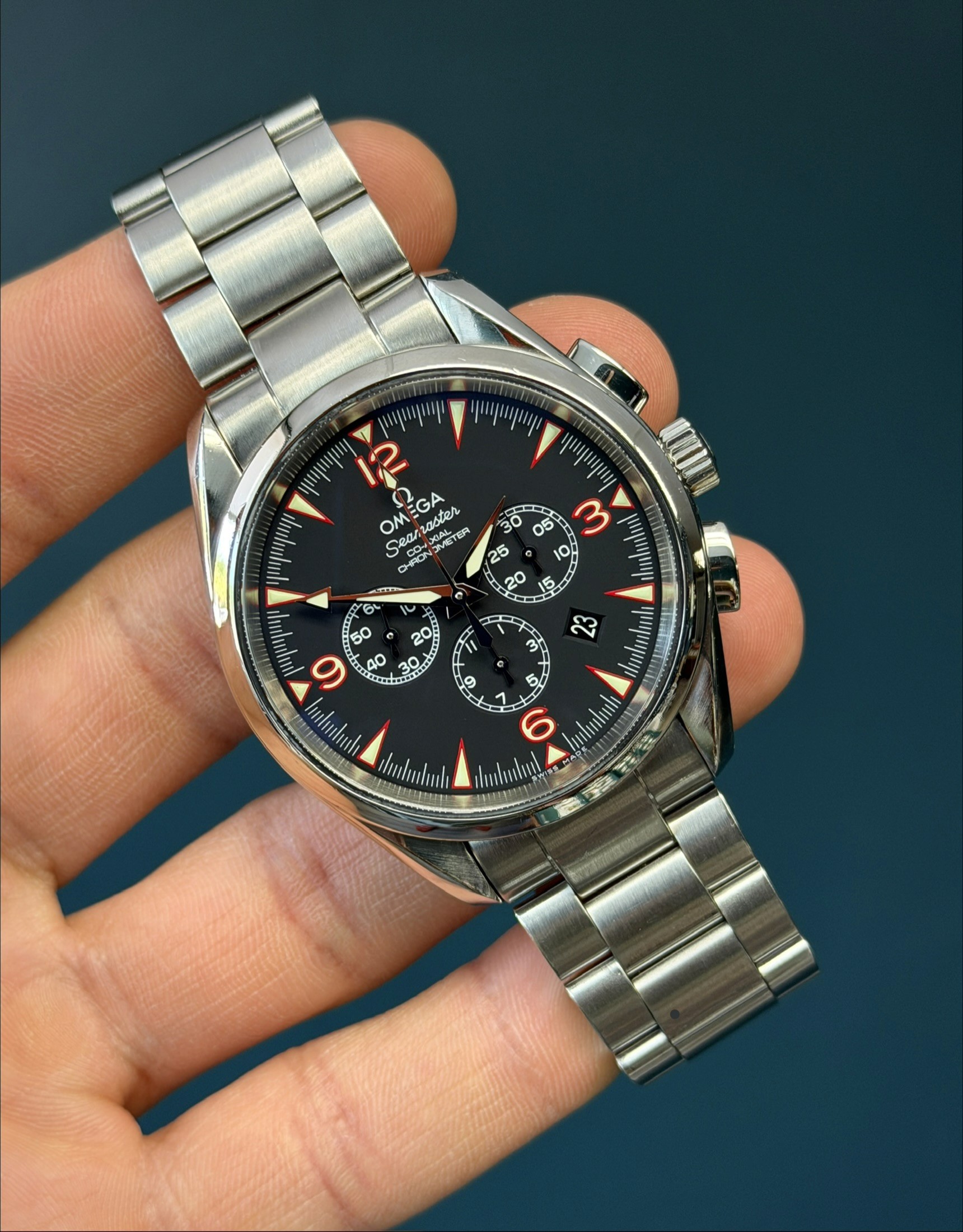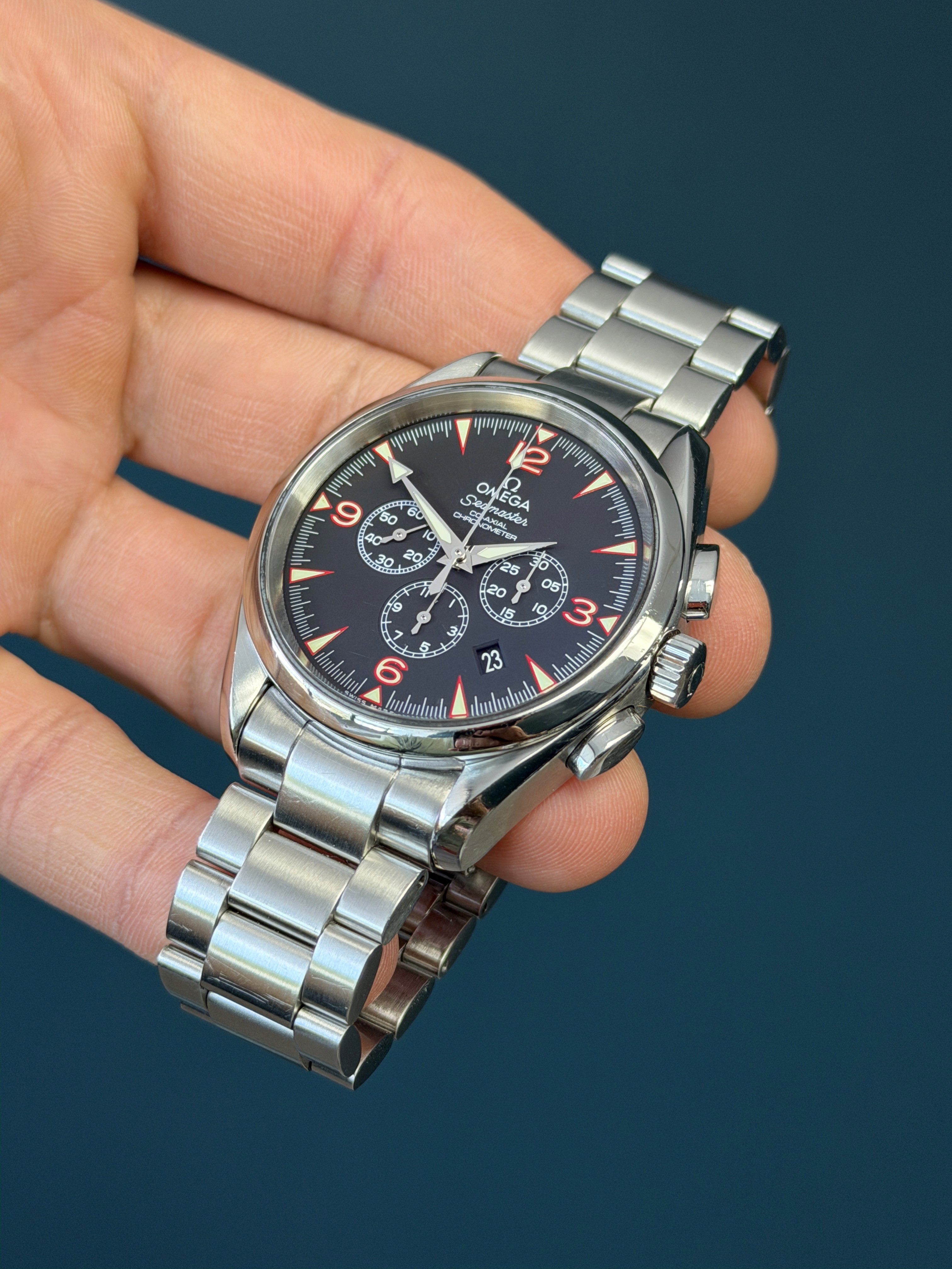 Housed in a robust 42.2mm stainless steel case, the watch features a distinctive black dial with chronograph subdials and subtle red accents beneath the luminous markers—an identifying trait of the “China Explorers” series. The dial is signed Seamaster, reflecting its crossover design language, while maintaining strong ties to the Railmaster chronograph lineage. Luminous hands and indices ensure excellent legibility, complemented by a date display for added practicality.