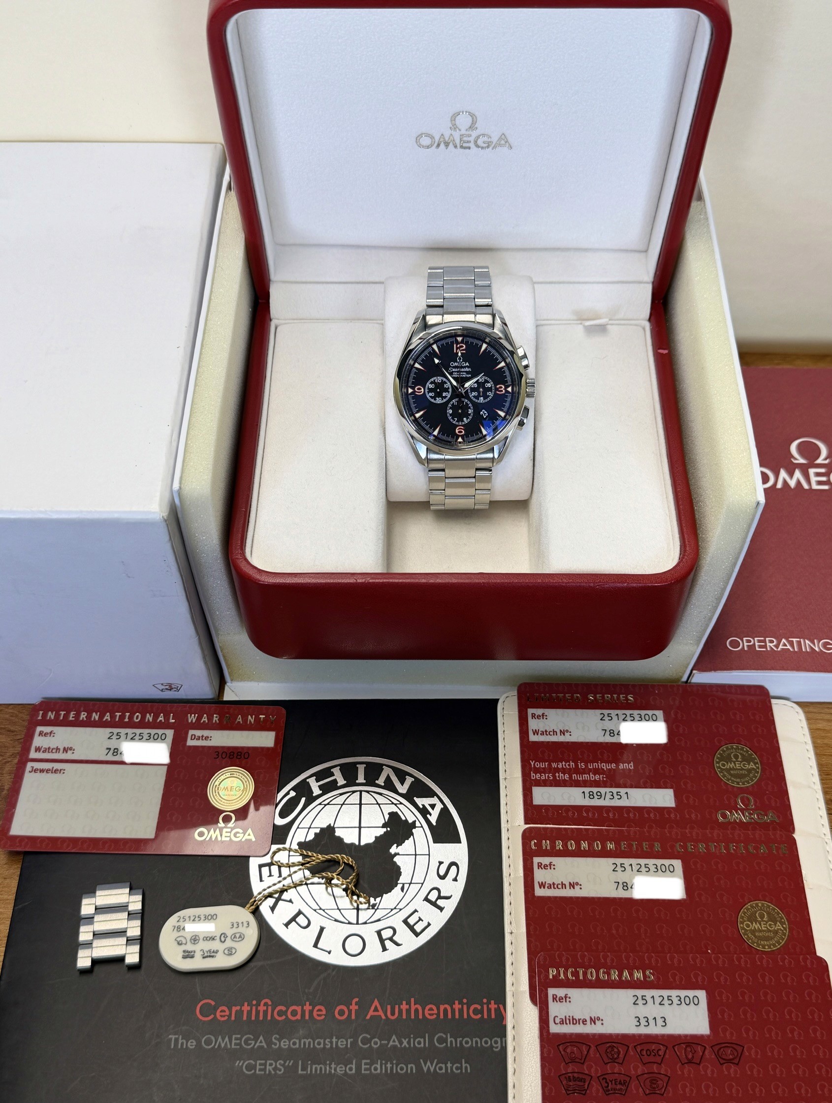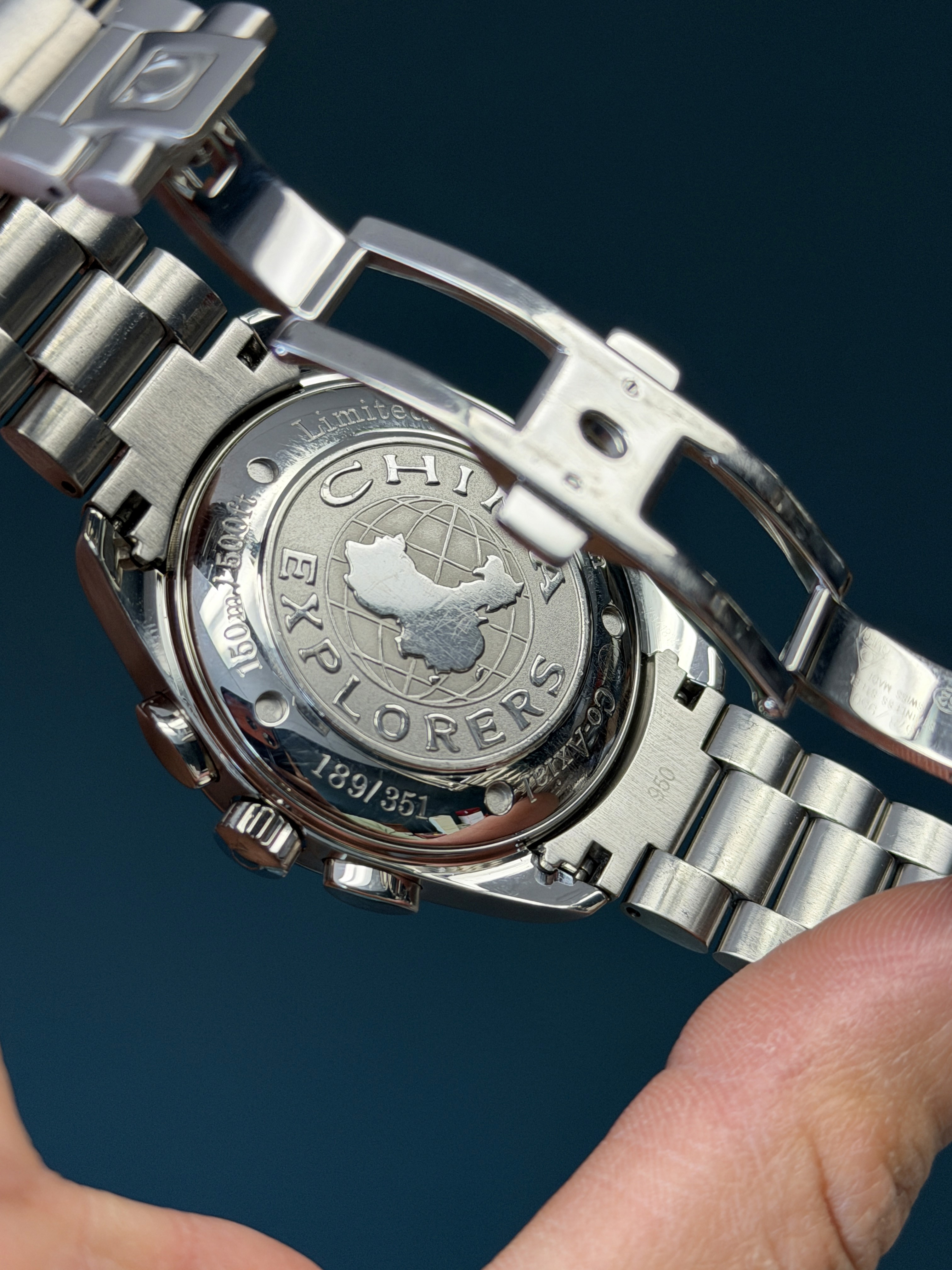 The Omega Seamaster “China Explorers” Limited Edition reference 2512.53 is a rare and highly collectible chronograph that blends technical innovation with a unique historical narrative. Produced in a strictly limited series, this example is individually numbered 189 of 351, underscoring its exclusivity and appeal among discerning collectors.