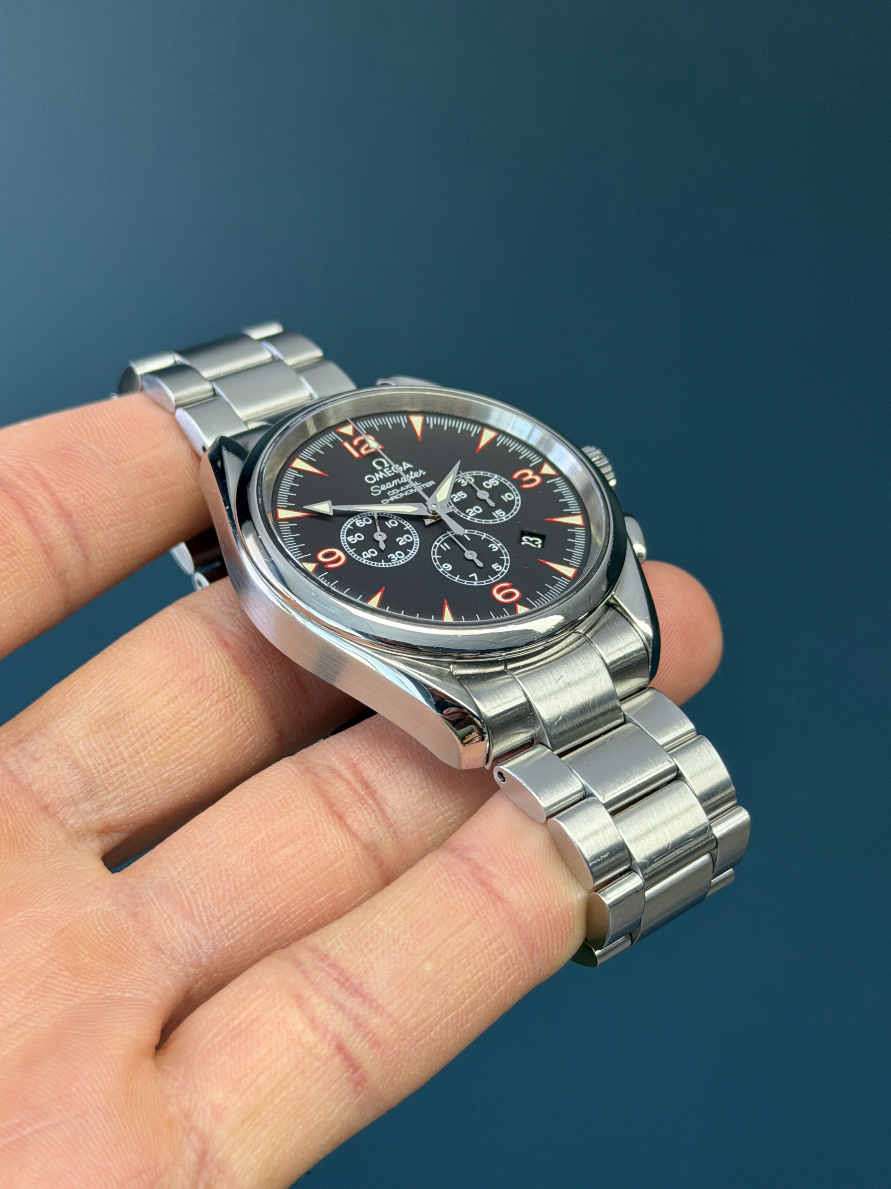 At its core is the Omega Co-Axial caliber 3313 automatic movement, a column-wheel chronograph known for its precision, durability, and approximately 52-hour power reserve. The watch is fitted with a stainless steel bracelet and offers water resistance suitable for everyday wear, combining sport functionality with refined aesthetics.