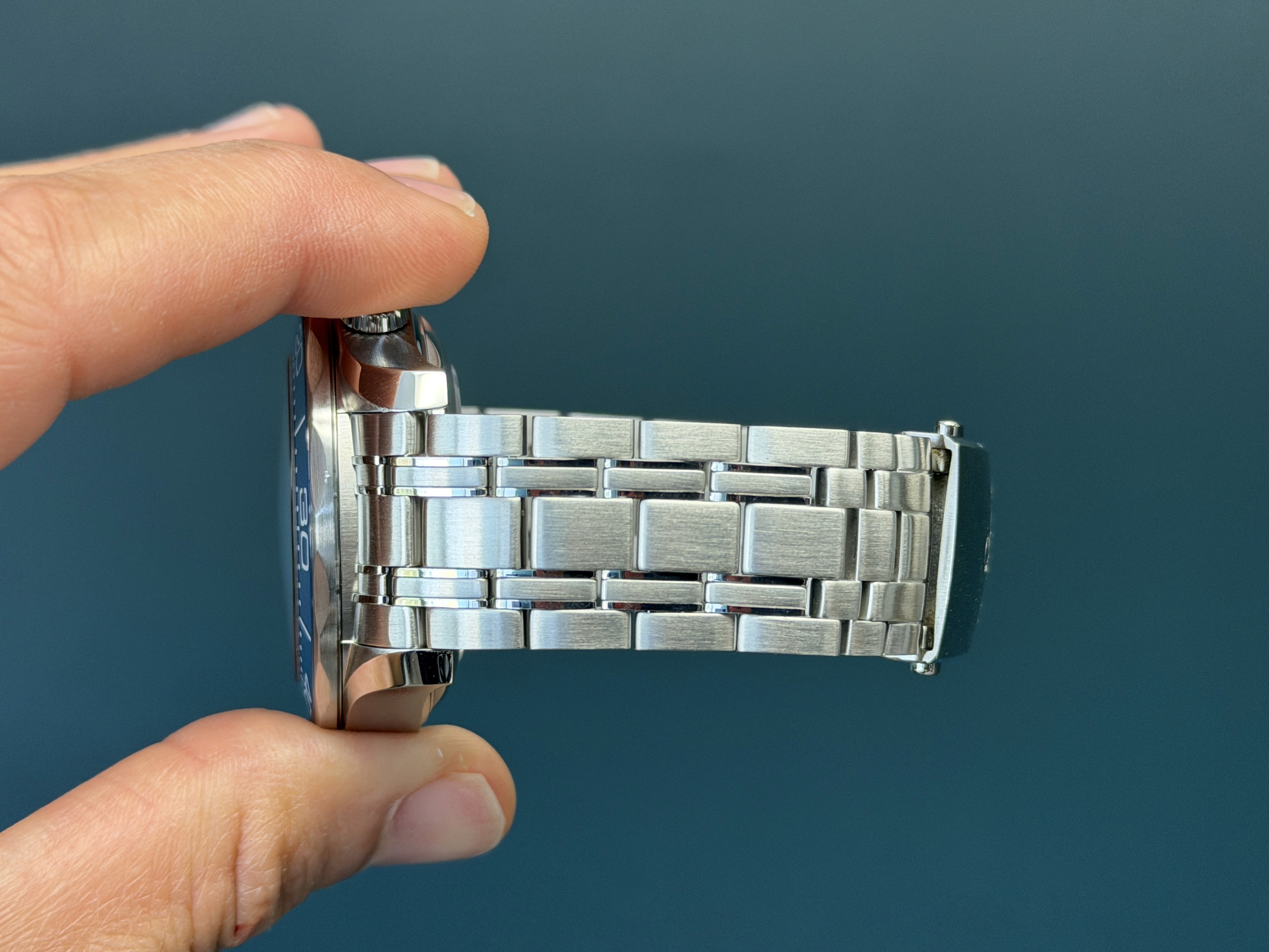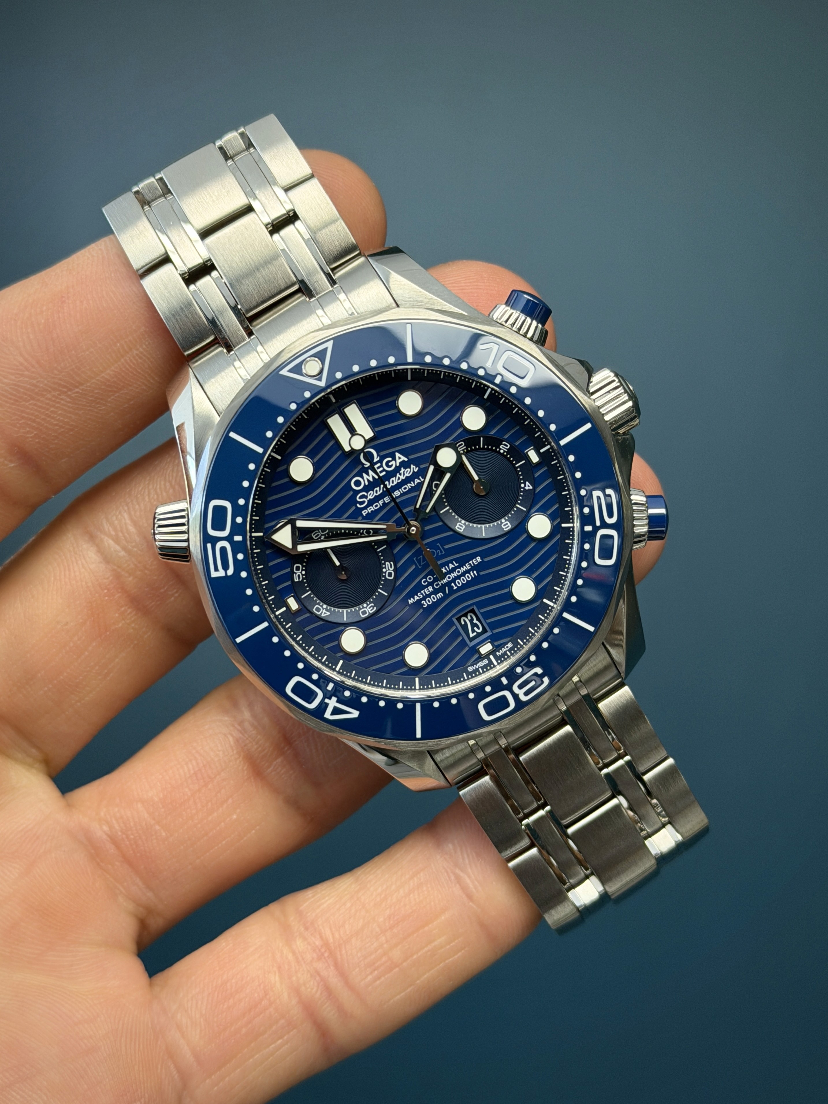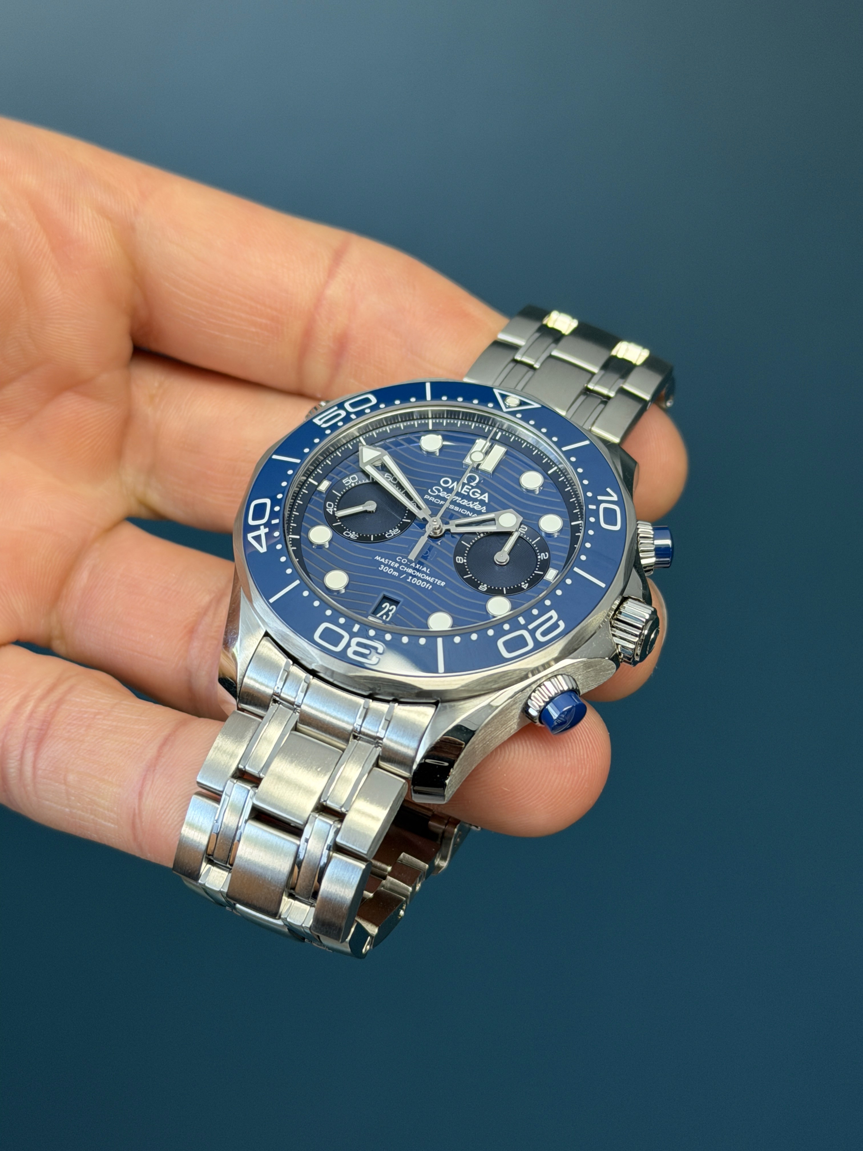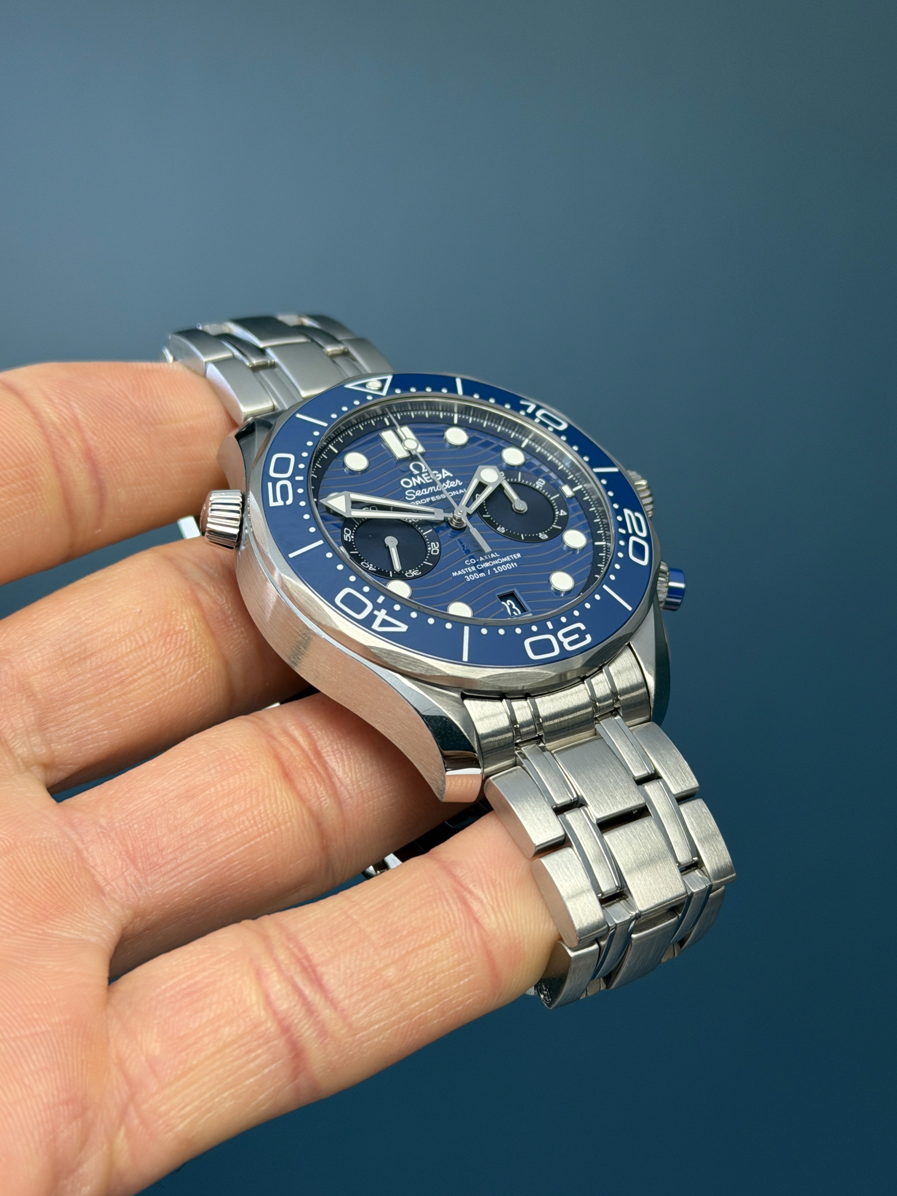 Crafted in stainless steel, the 44mm case is paired with a matching bracelet and features a striking blue ceramic bezel with a white enamel diving scale. The dial showcases Omega’s signature laser-engraved wave pattern in deep blue ceramic, complemented by luminous skeletonized hands and applied hour markers, along with a date aperture at 6 o’clock and dual chronograph subdials for added functionality.