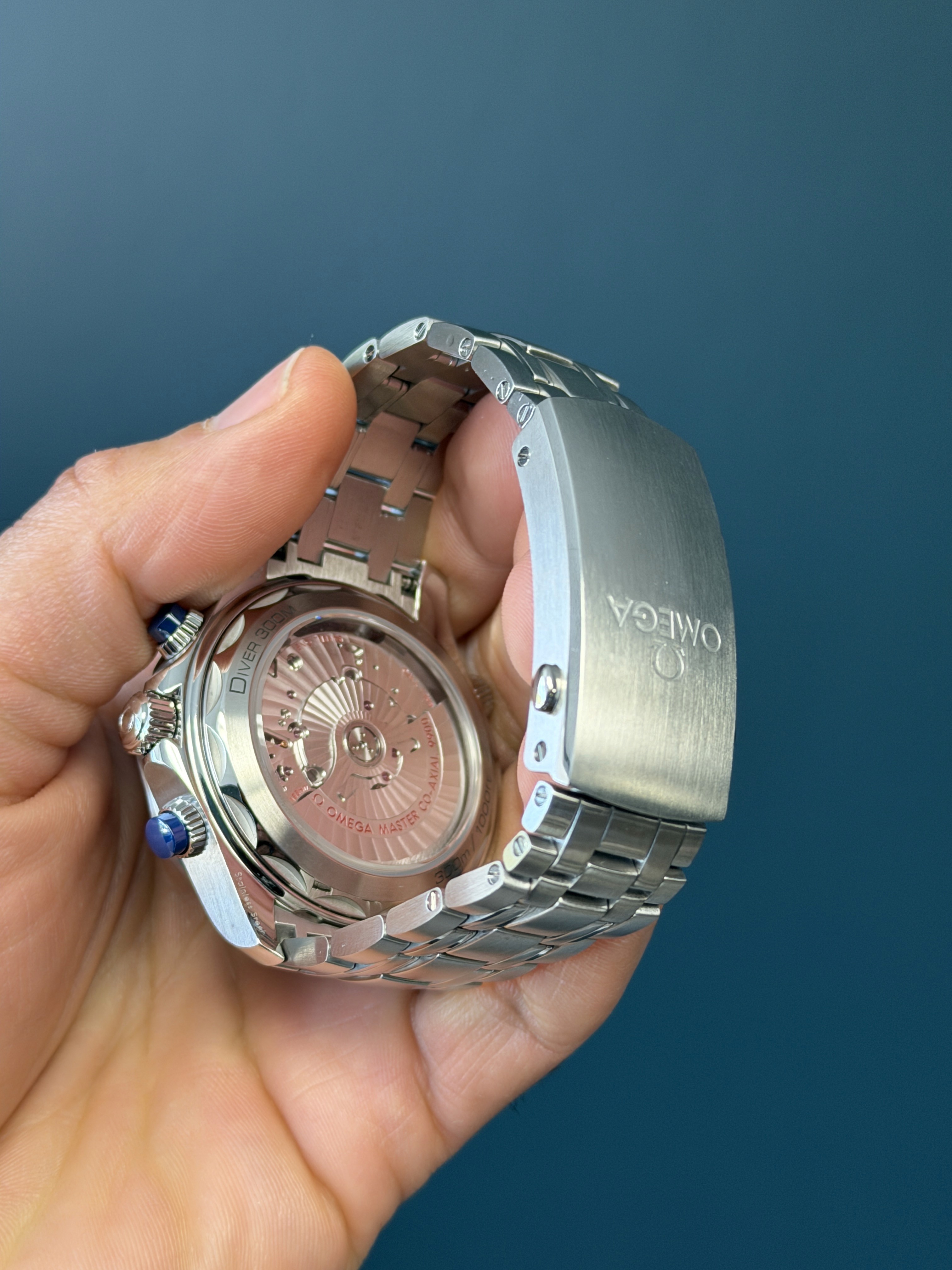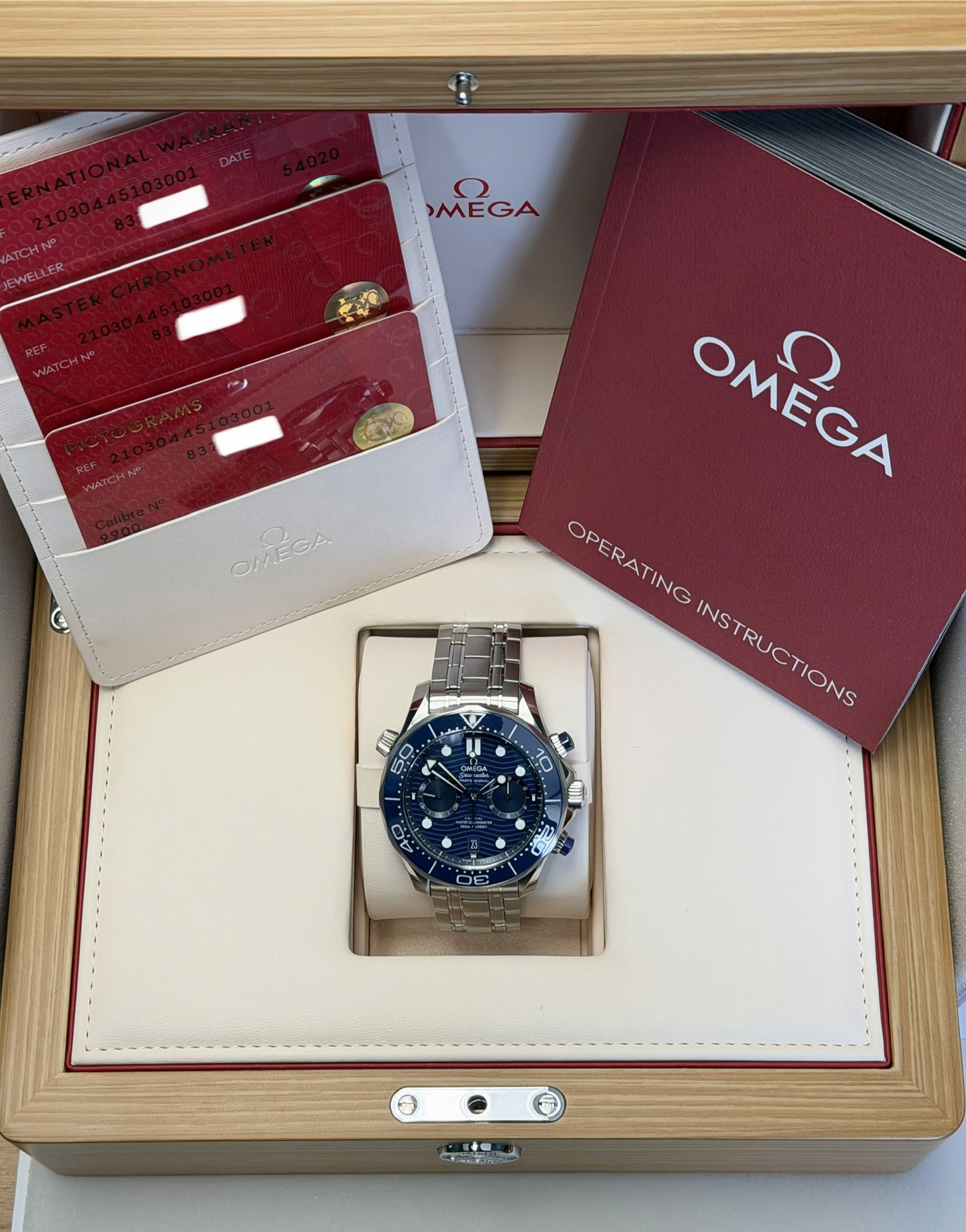 Powering the watch is the Omega Co-Axial Master Chronometer Caliber 9900, offering exceptional precision, anti-magnetic resistance, and an impressive 60-hour power reserve, all visible through the sapphire exhibition caseback. With 300 meters of water resistance and a helium escape valve, this piece is built for serious diving while remaining equally suited for everyday wear.