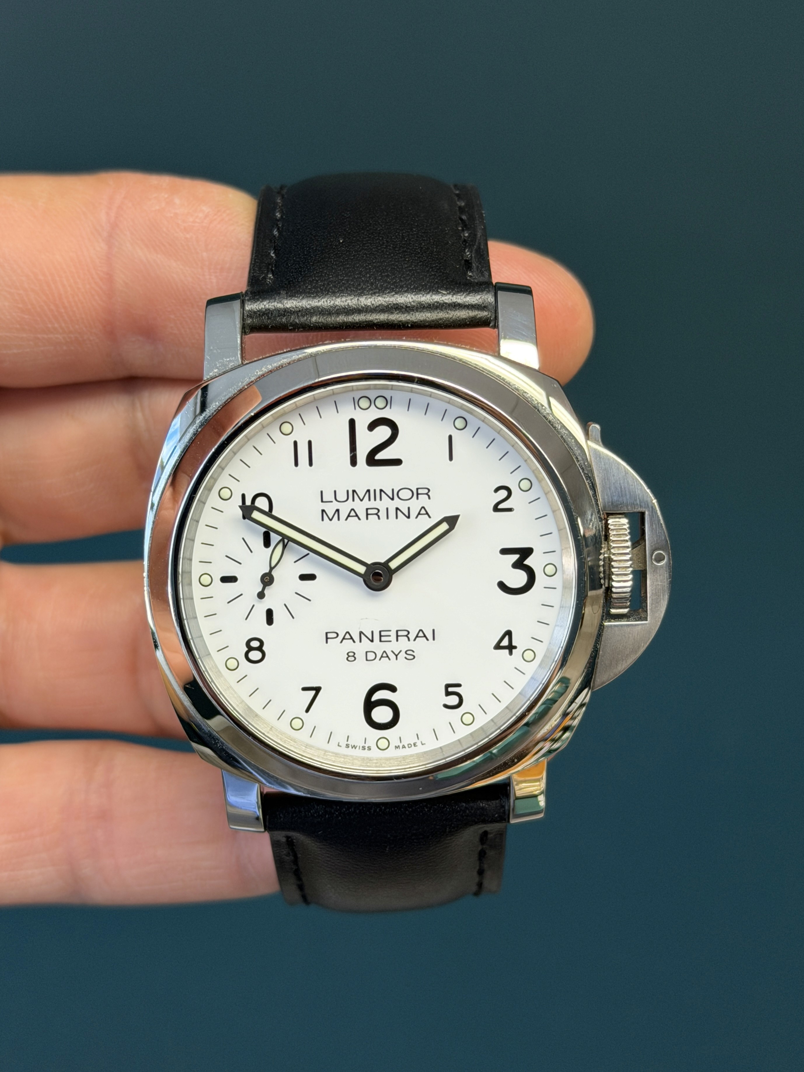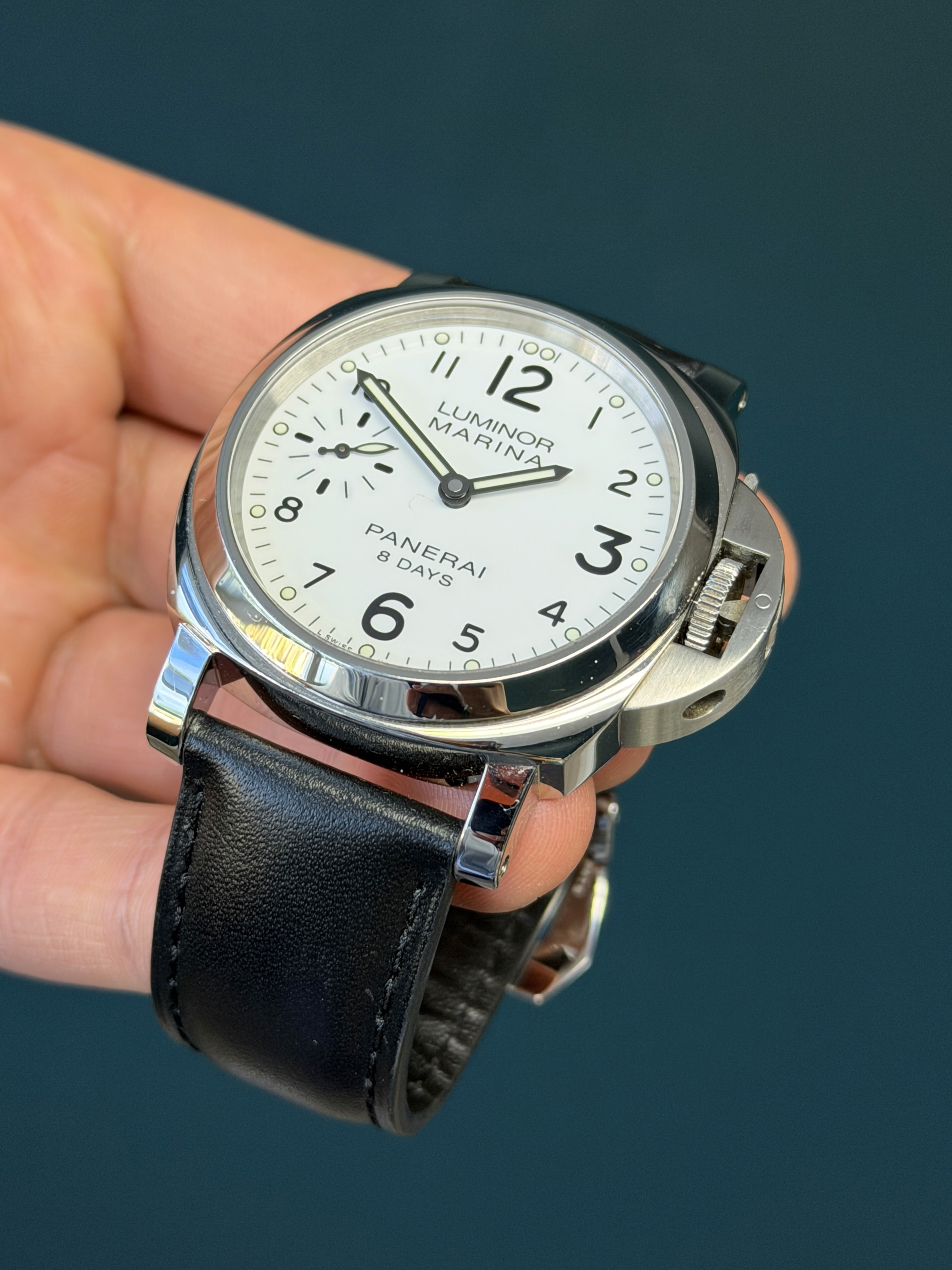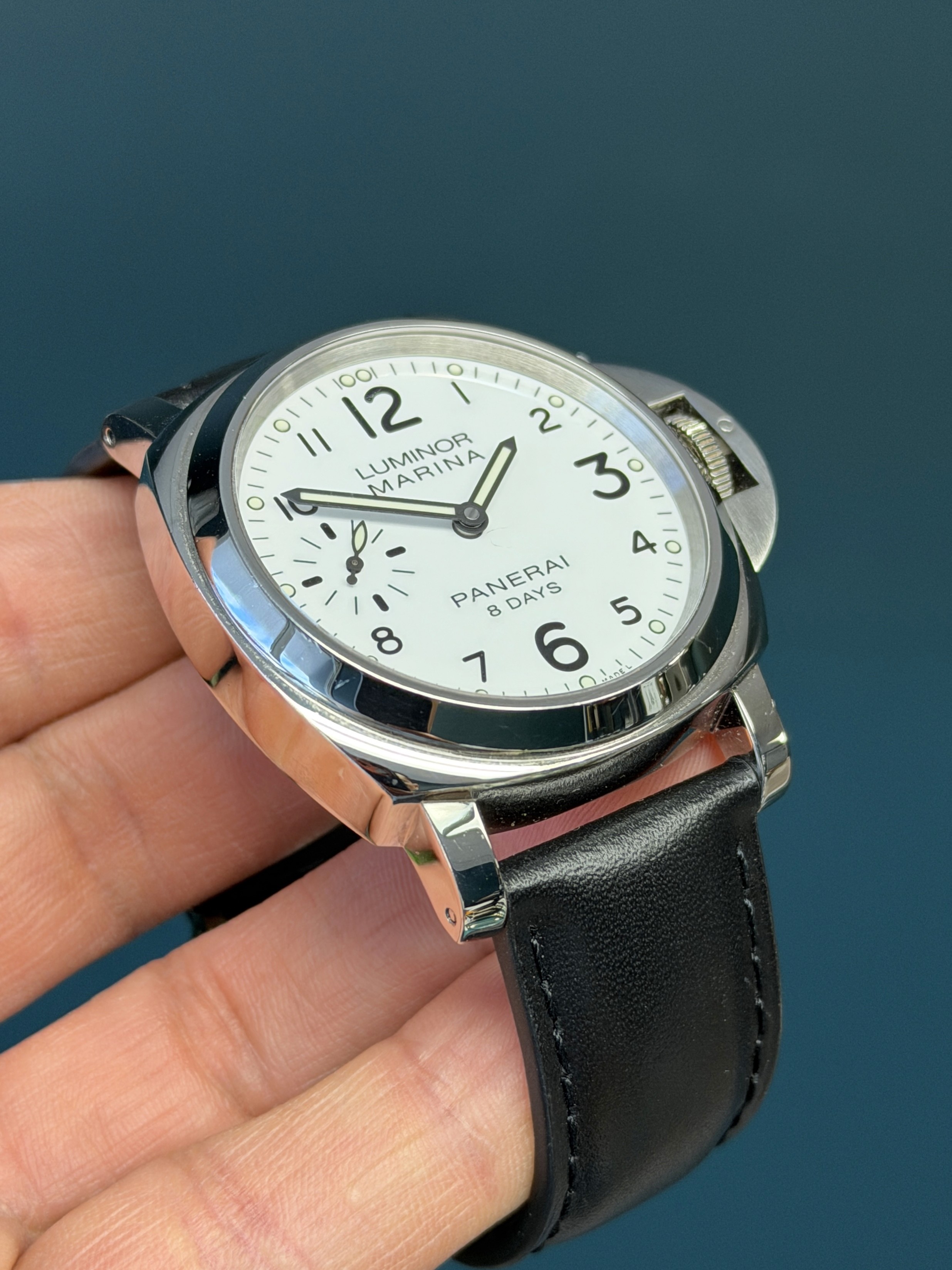 The clean white dial offers exceptional legibility, with bold Arabic numerals and luminous hour markers, a small seconds subdial at 9 o’clock, and a date window at 3 o’clock. Powering the watch is Panerai’s in-house manual-wind P.5000 movement, delivering an impressive 8-day power reserve, a hallmark of the brand’s modern tool-watch heritage.