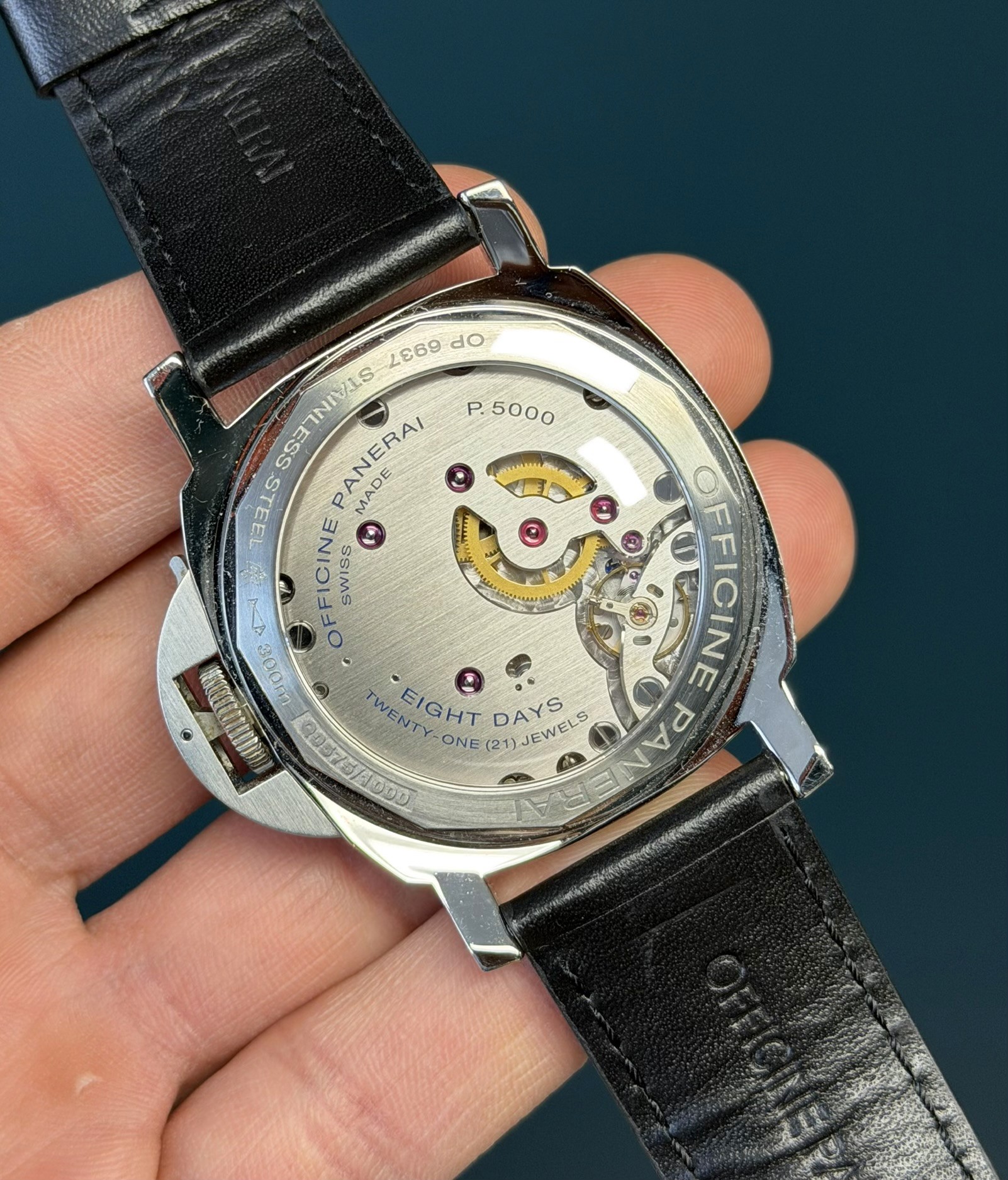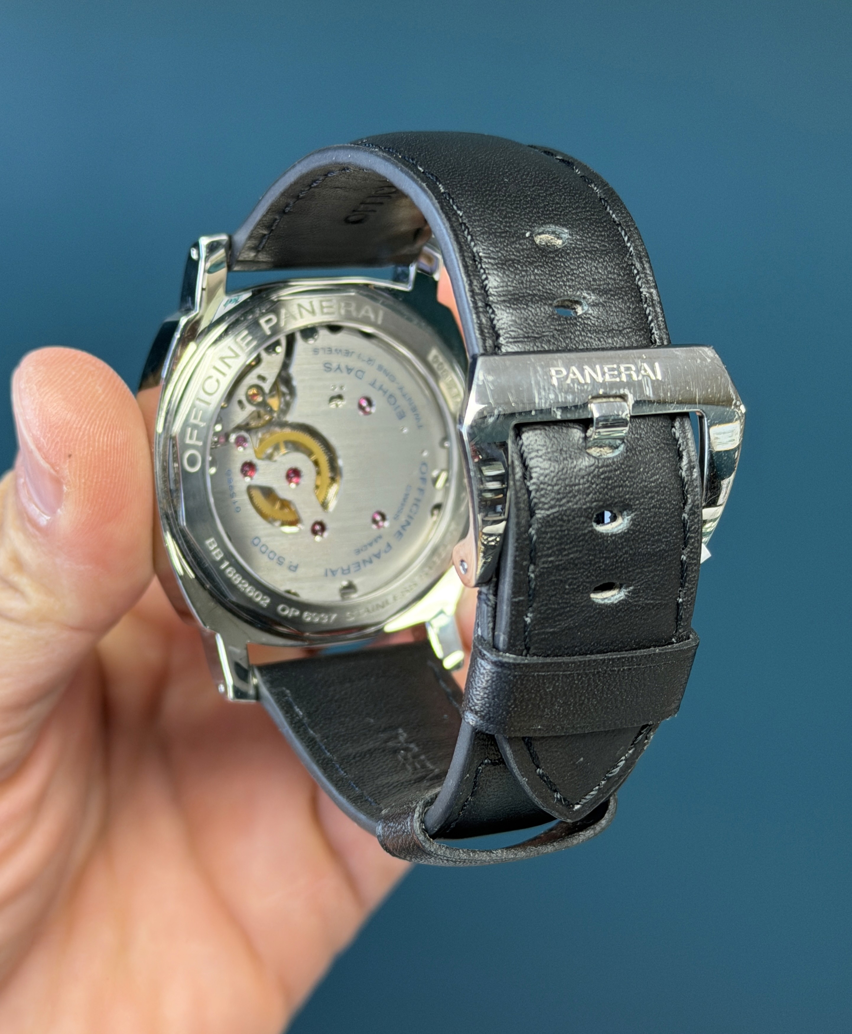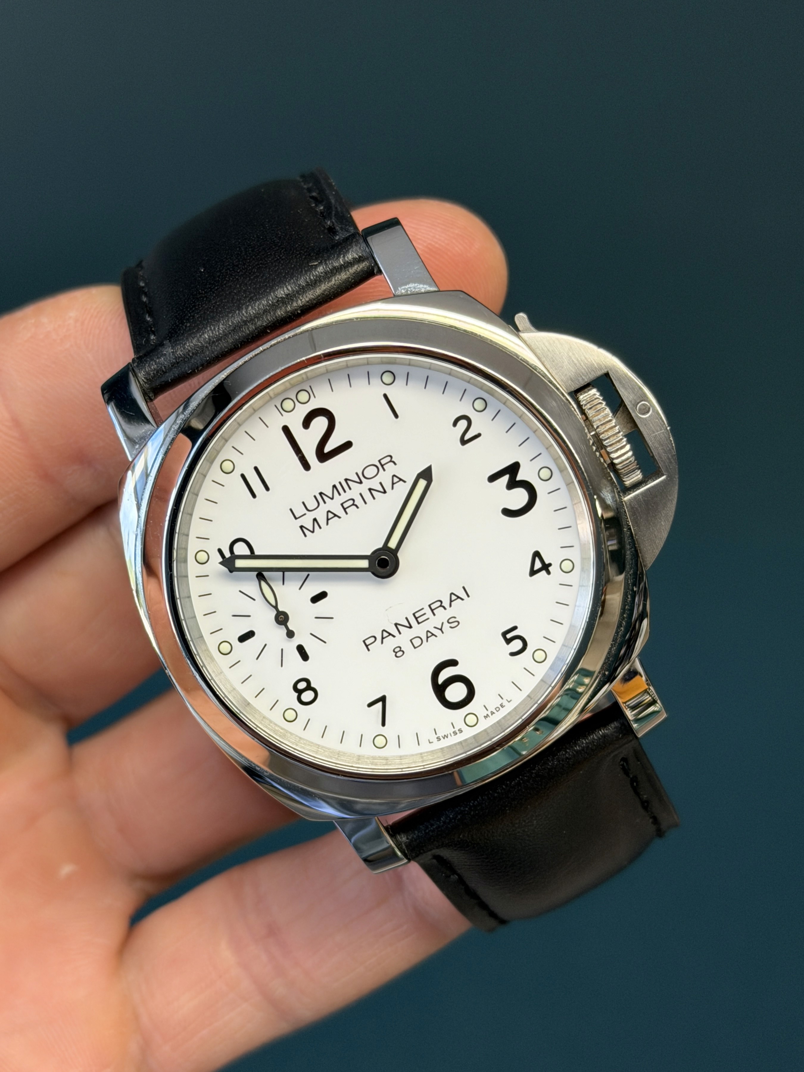 The clean white dial offers exceptional legibility, with bold Arabic numerals and luminous hour markers, a small seconds subdial at 9 o’clock, and a date window at 3 o’clock. Powering the watch is Panerai’s in-house manual-wind P.5000 movement, delivering an impressive 8-day power reserve, a hallmark of the brand’s modern tool-watch heritage.