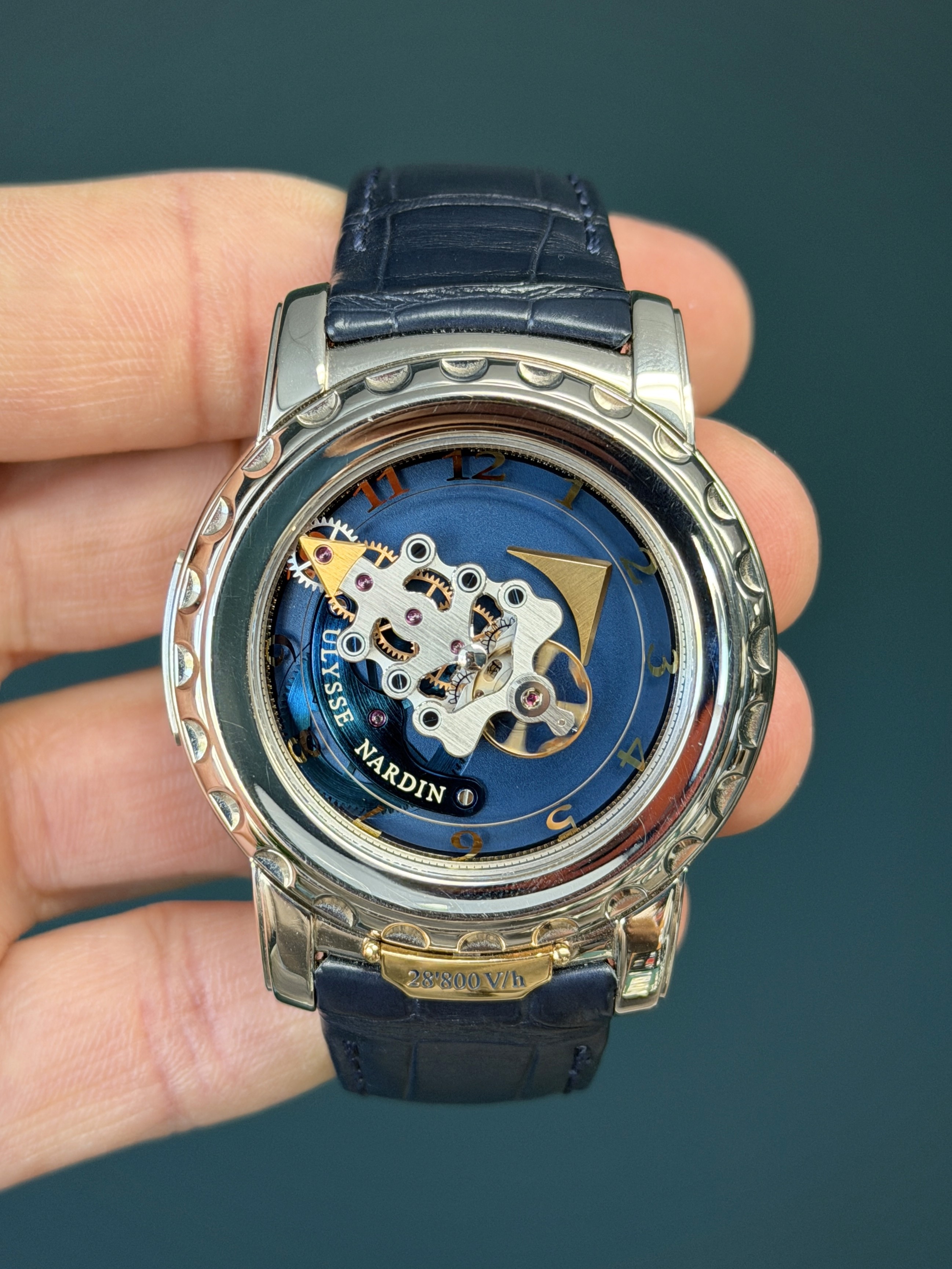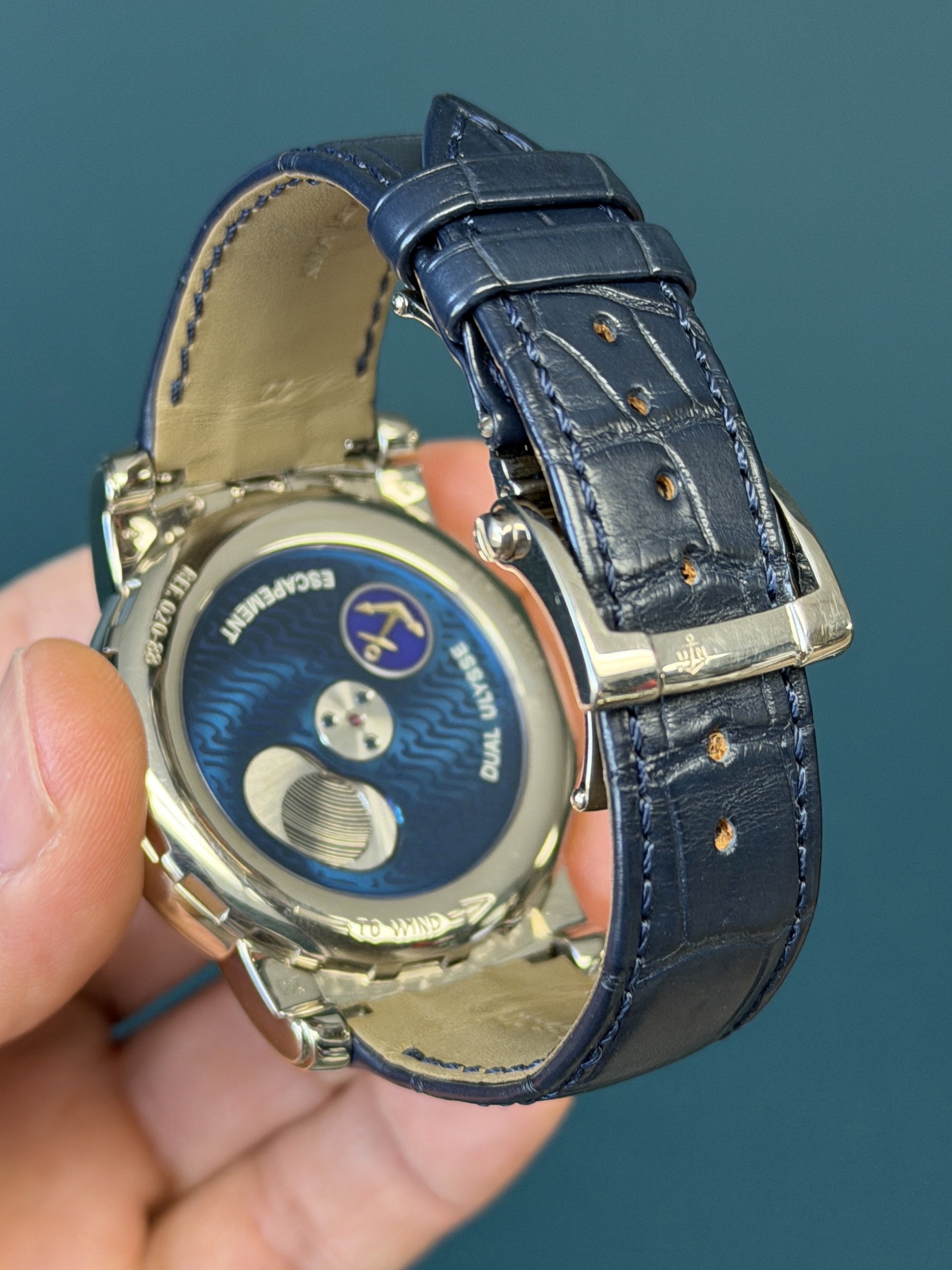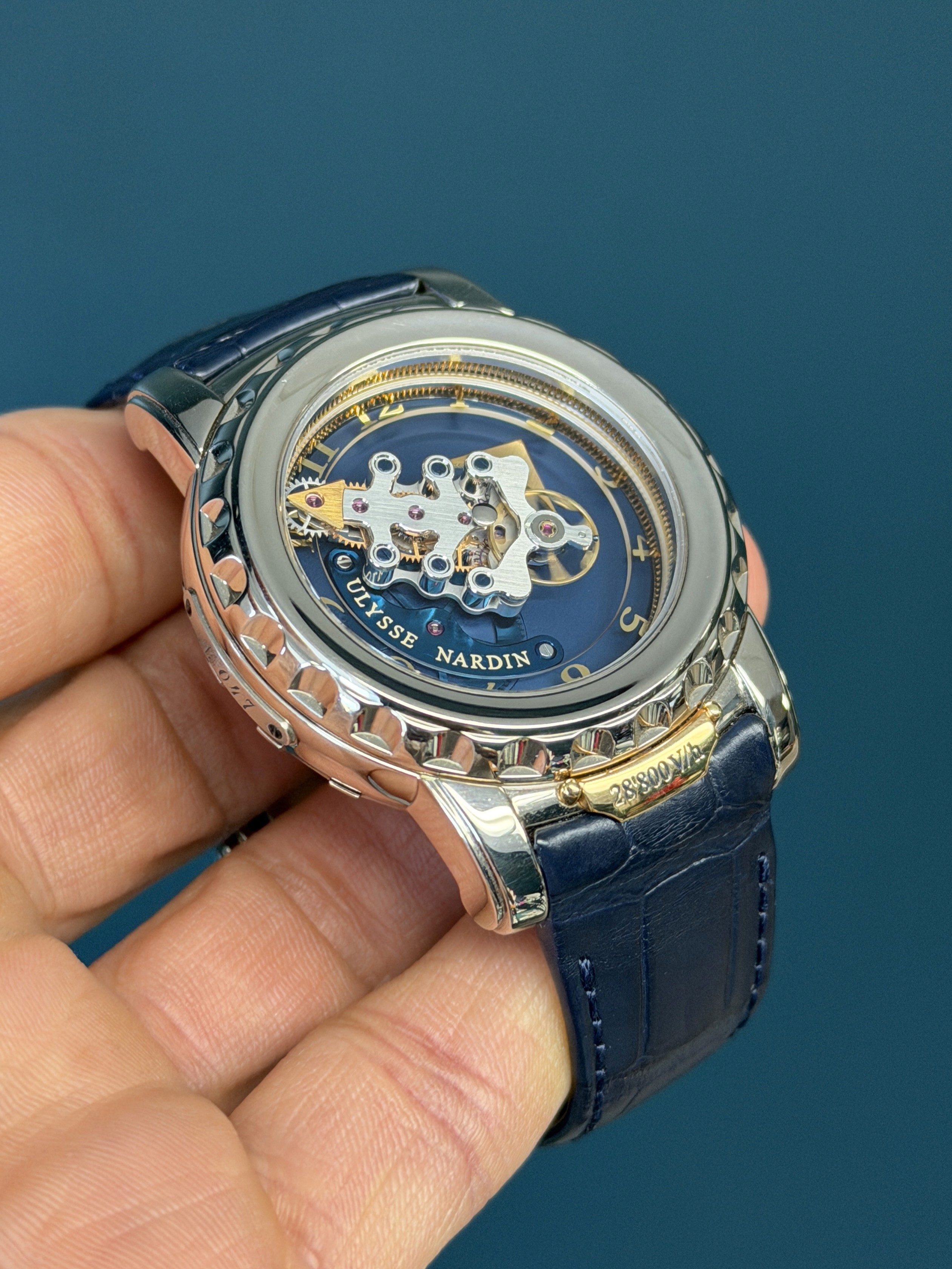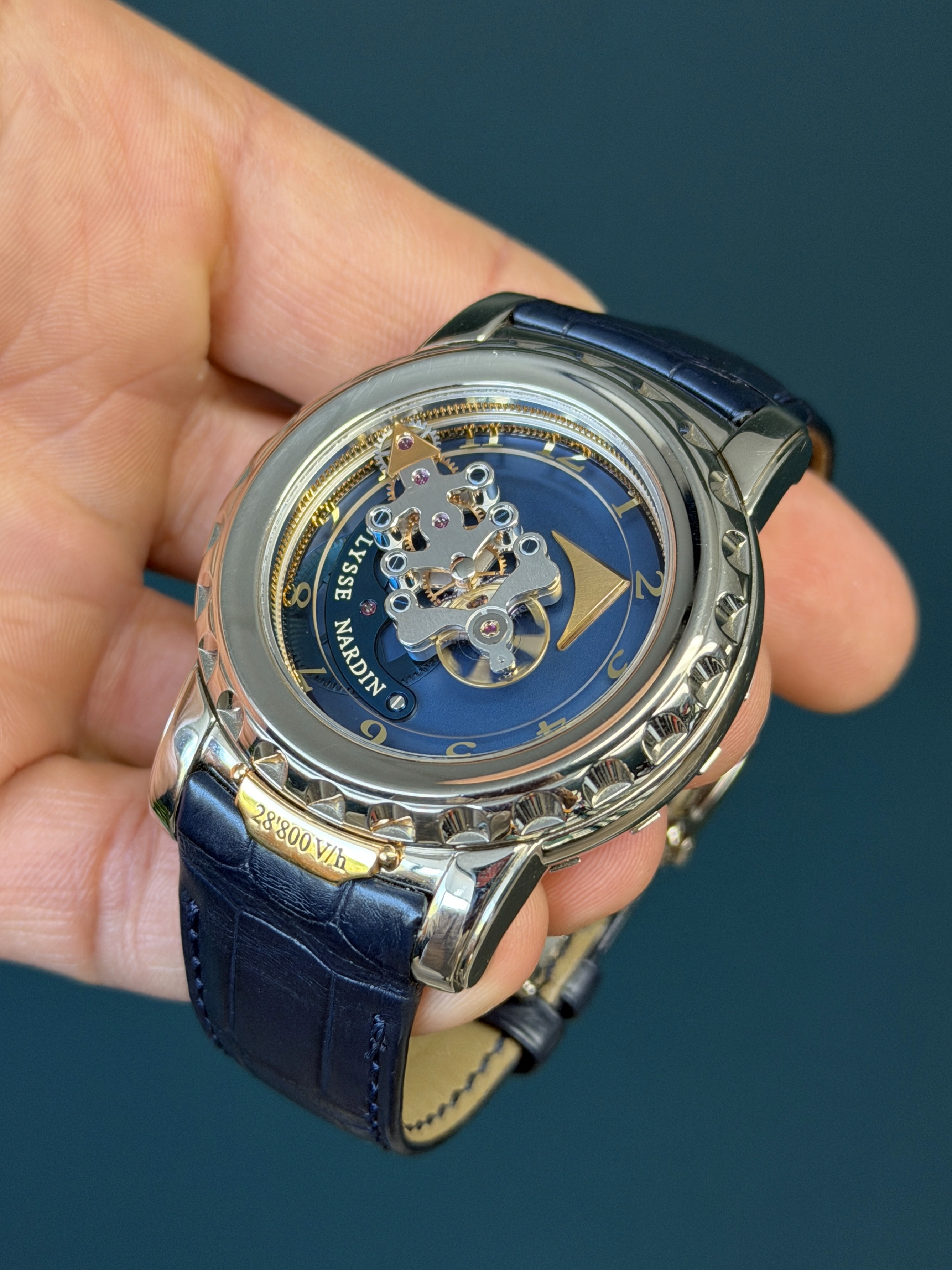 The striking blue composition showcases Ulysse Nardin’s pioneering use of silicon technology and avant-garde engineering, with the flying carousel movement acting as both the regulating organ and time display. This manual-wind caliber delivers a truly unique visual and mechanical experience, making the Freak one of the most technically significant watches of the 21st century.