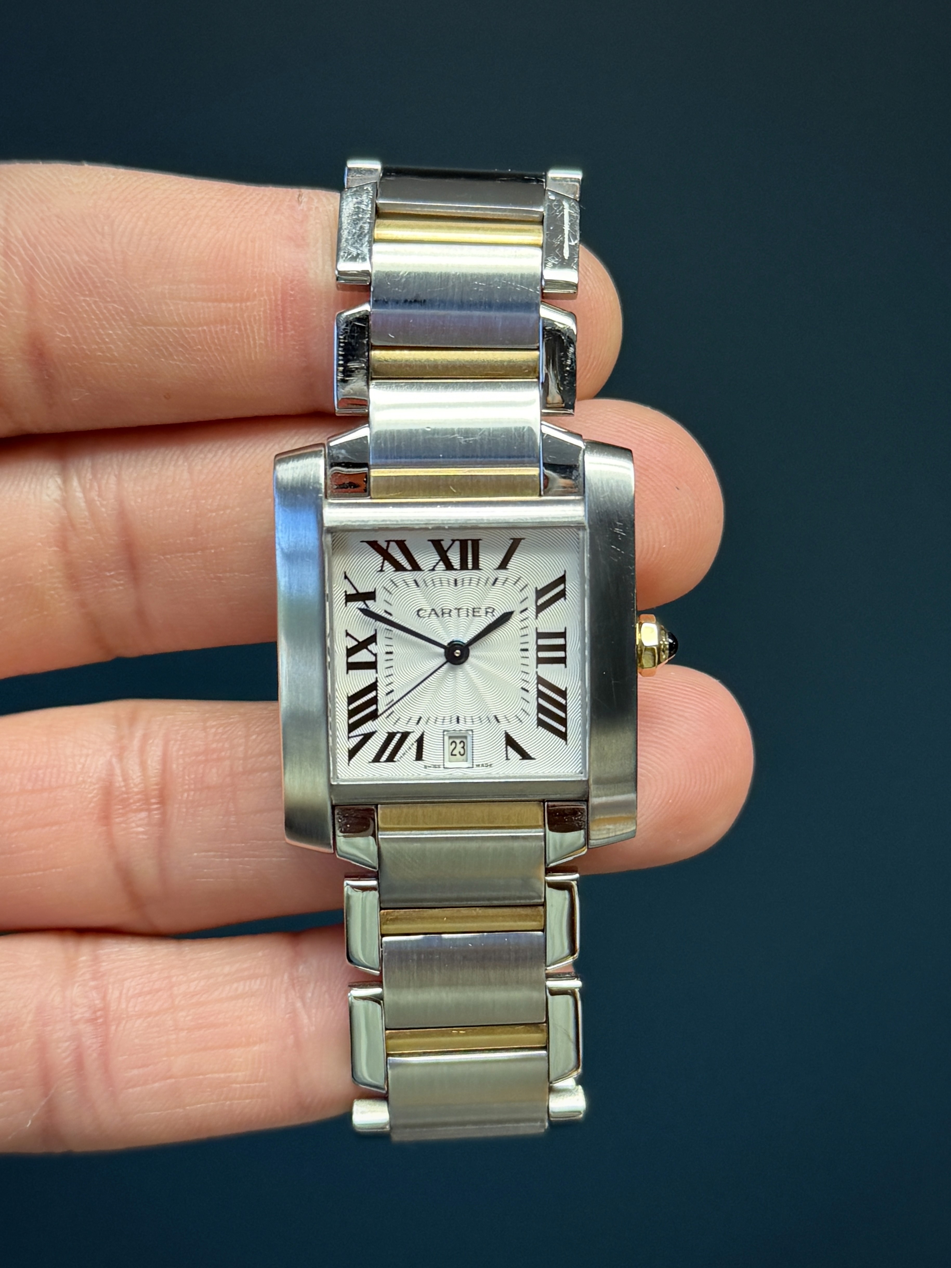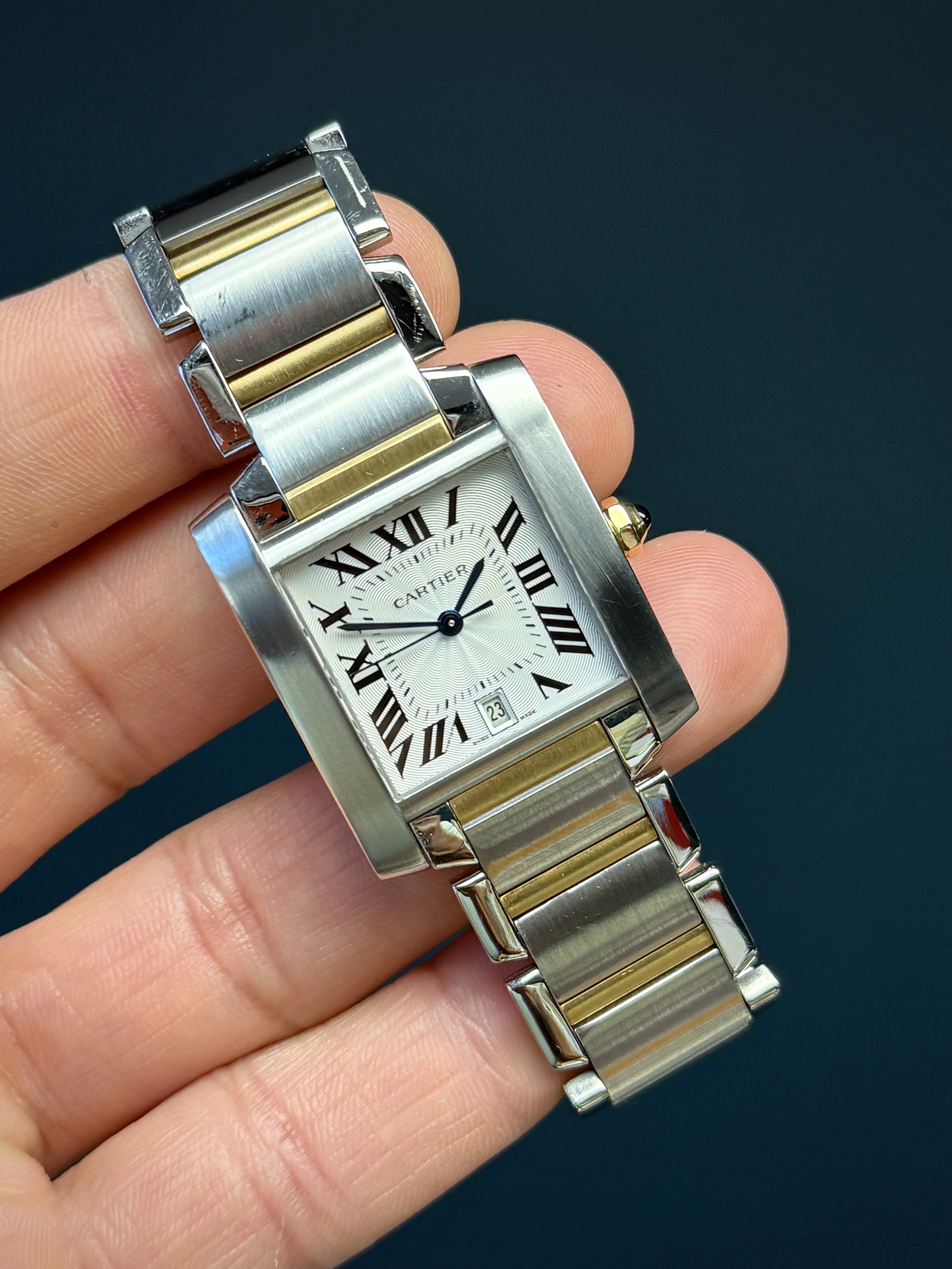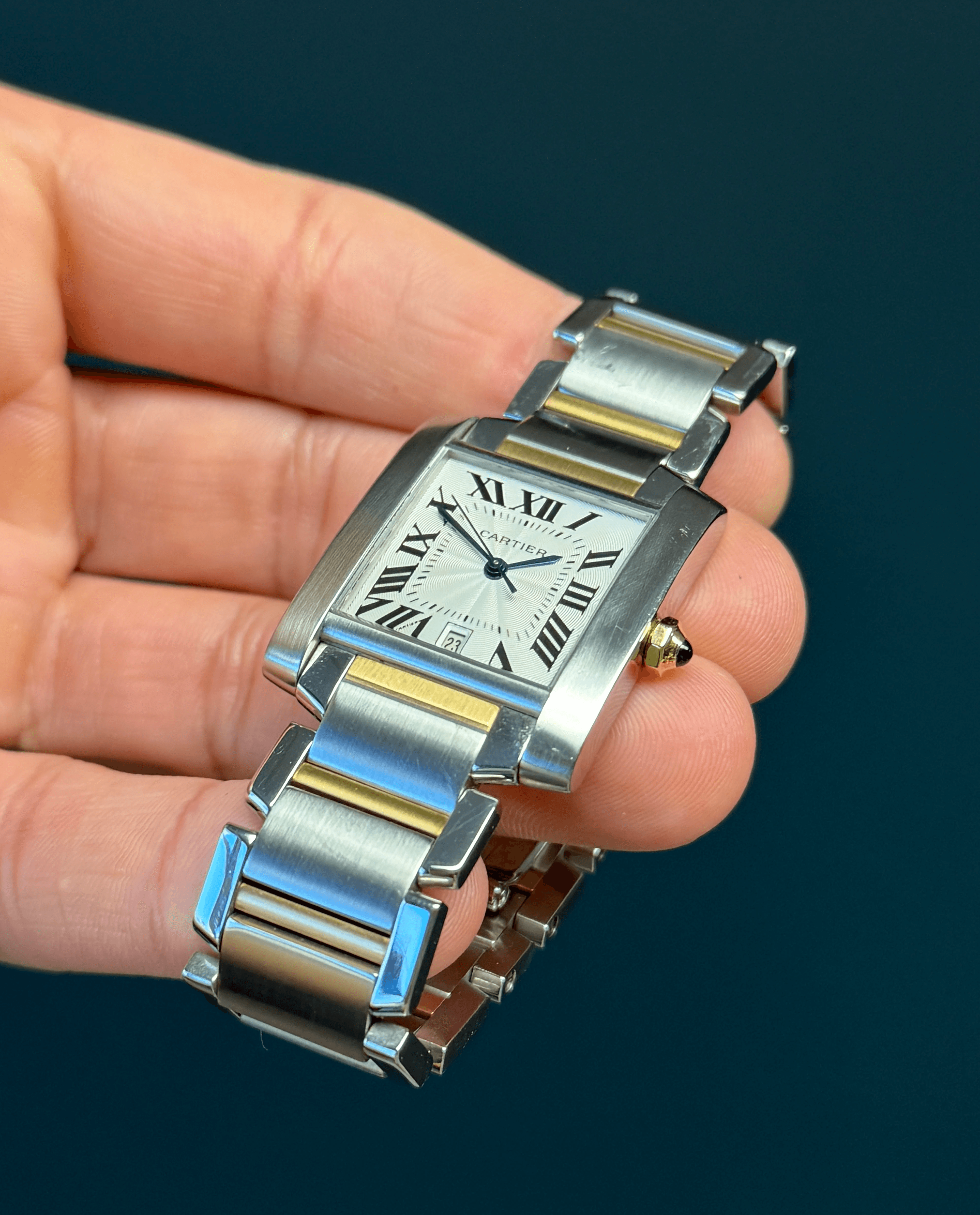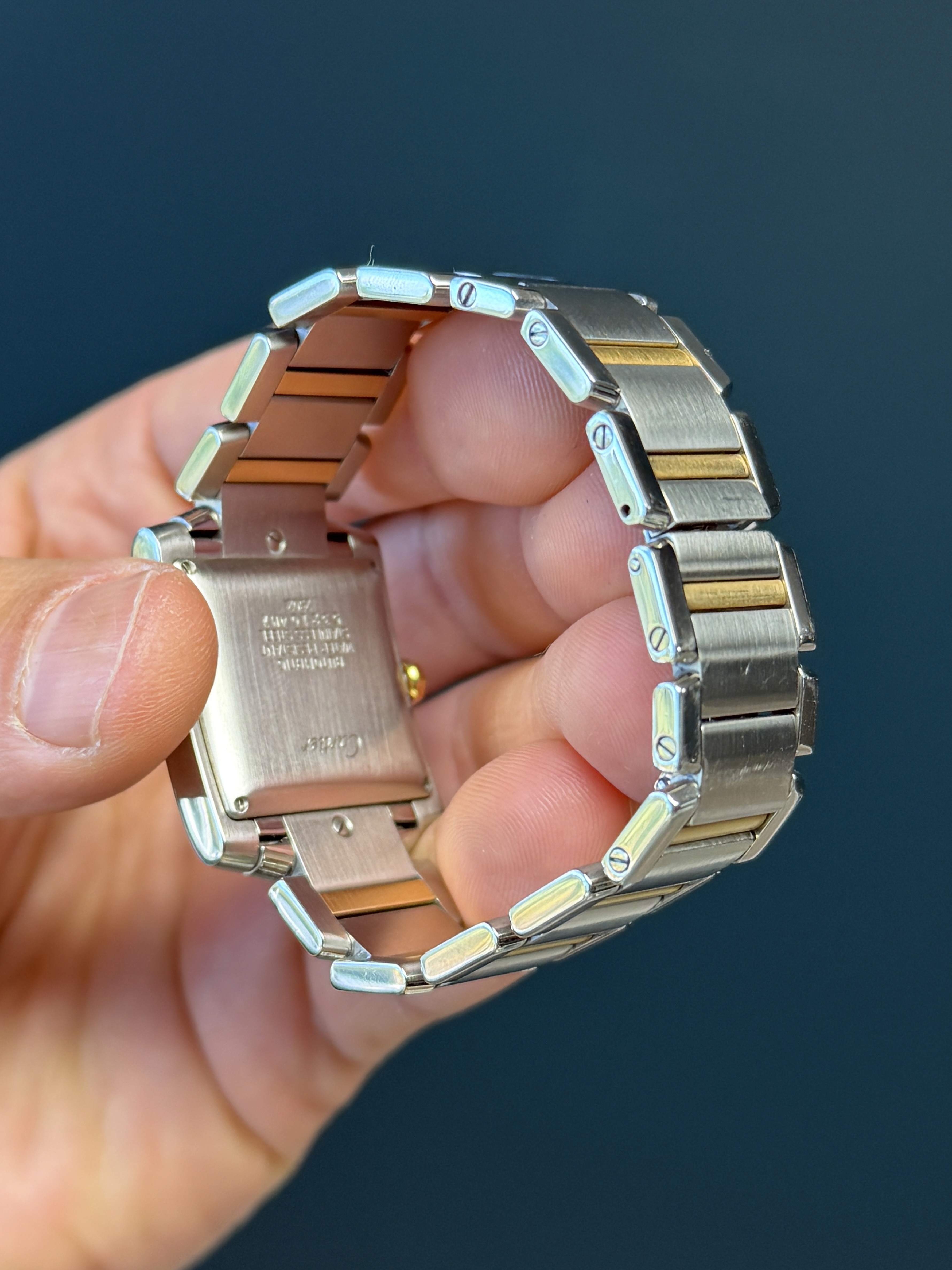 The vintage Cartier Tank reference 2302 (W51005Q4) is a stunning two-tone piece that exemplifies Cartier's timeless elegance and precision in design. This example showcases a rectangular stainless steel case paired with a gold bezel, offering a refined contrast and luxurious appeal. The Tank’s signature Roman numeral dial and blue steel sword hands enhance its classic charm, while the automatic movement inside provides reliable accuracy and low-maintenance functionality. With the distinctive Tank silhouette and Cartier’s unmatched craftsmanship, this watch stands as a beautiful blend of understated sophistication and enduring style, perfect for collectors who appreciate the legacy of this iconic model.